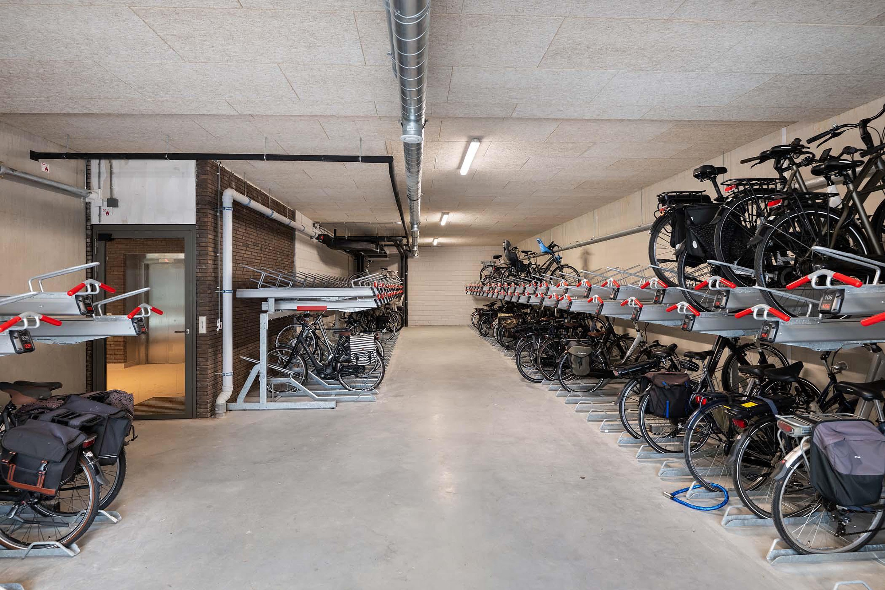 Direct naast de entree bevindt zich de ruime fietsenstalling met ruimte voor vier fietsen per appartement.
