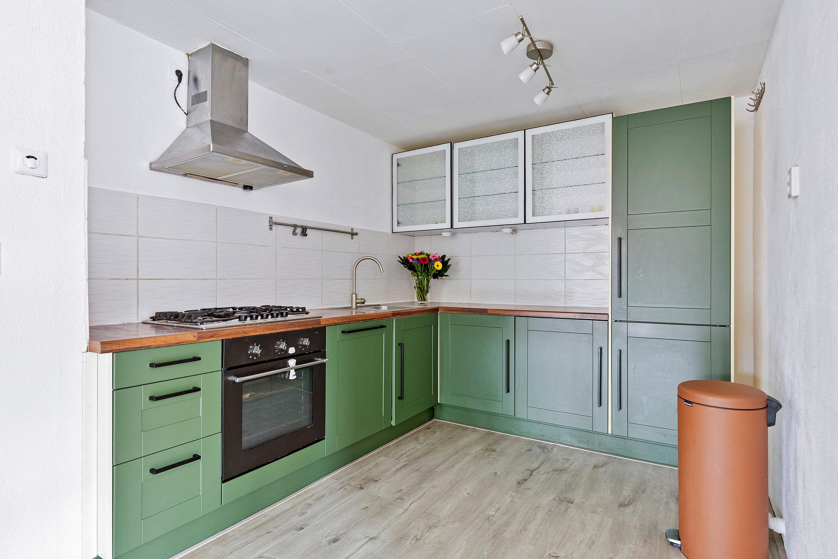 Keuken, voorzien van een L-vormig keukenblok met een 5-pits gaskookplaat en afzuigkap, een koel-vriescombinatie, oven en vaatwasser. Ook bevat de keuken een wasmachine, welke achterblijft.