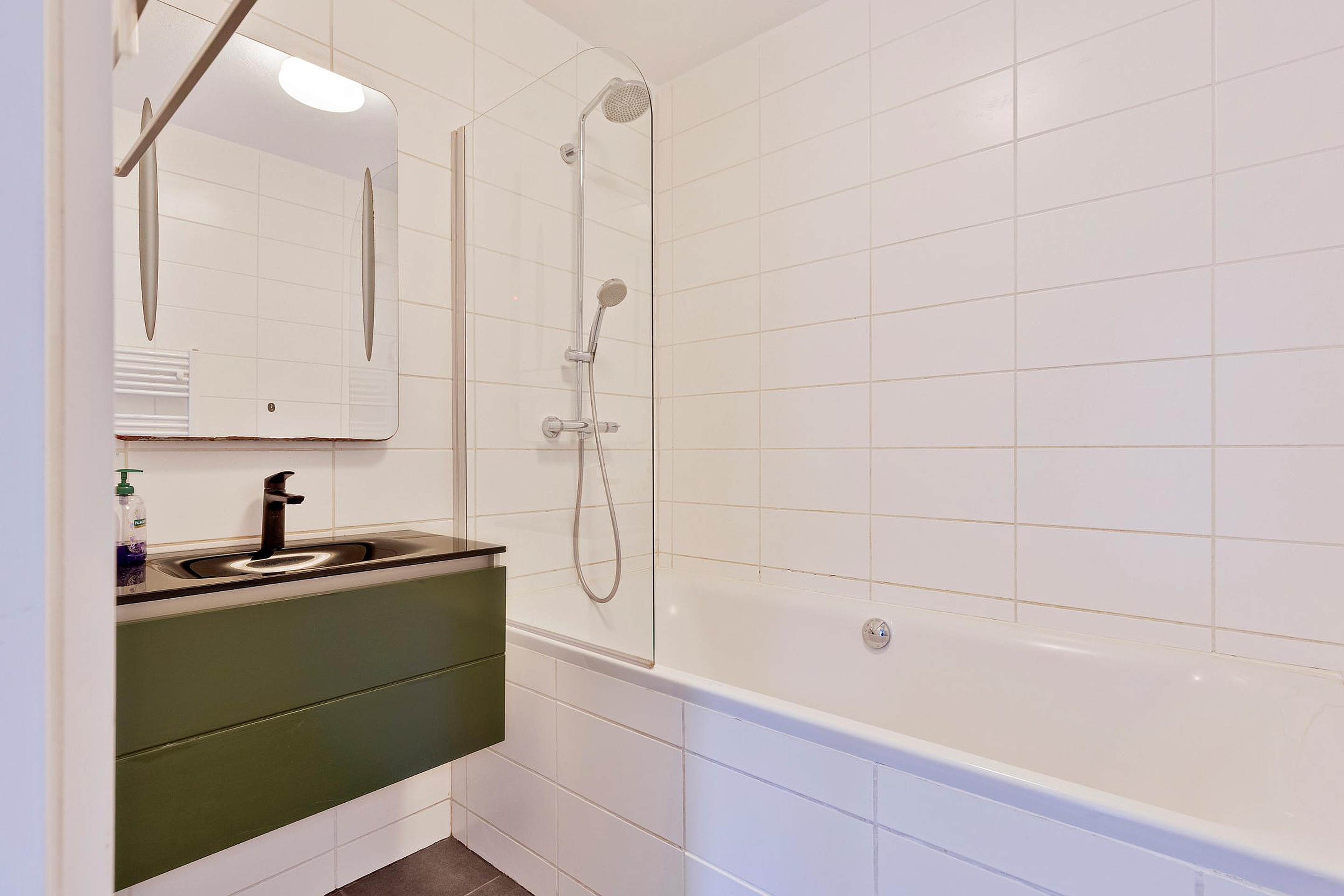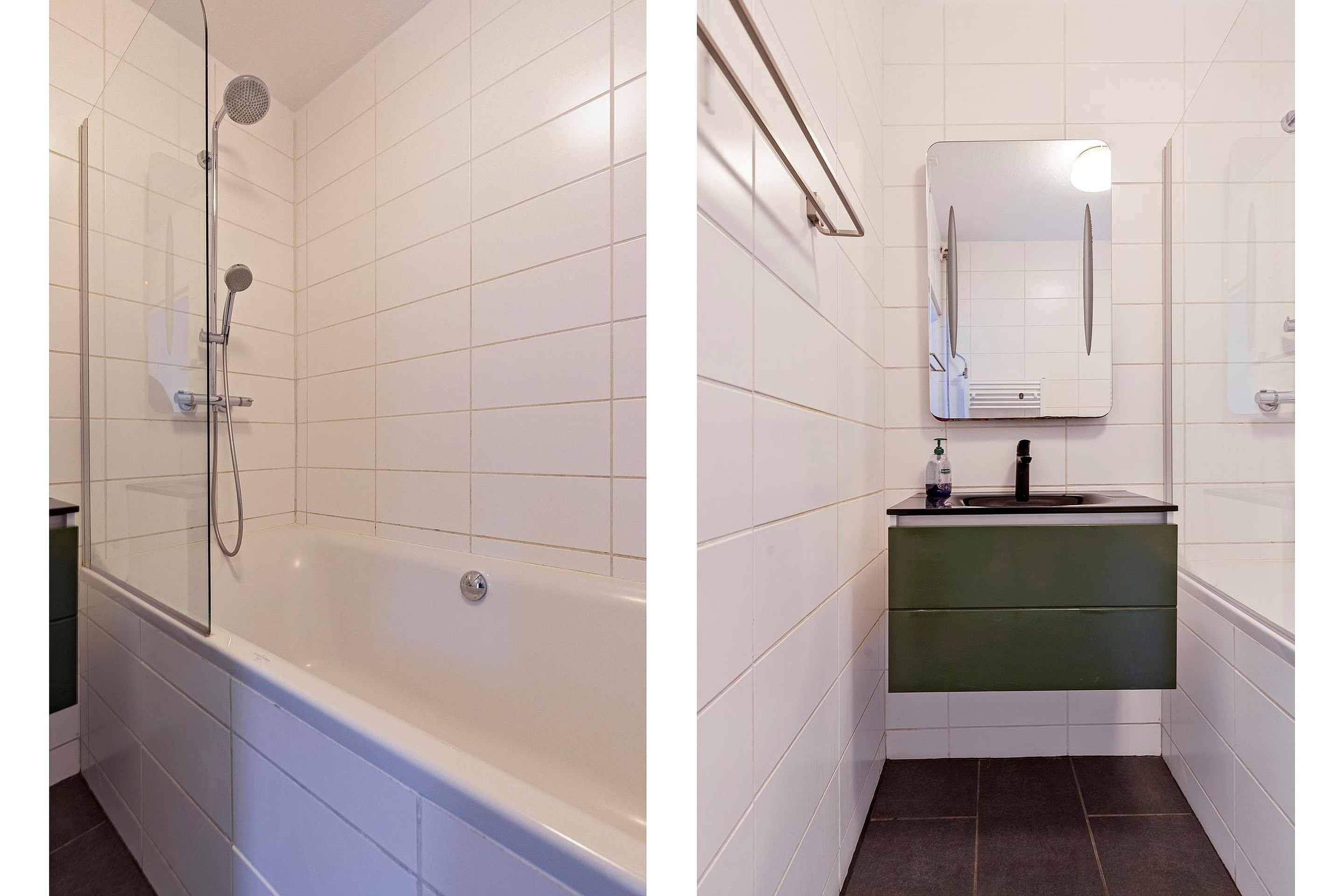 Badkamer, een geheel betegelde badkamer, voorzien van een groot ligbad met thermostaatkraan met rainshower en handdouche, een wastafel met onderladen en spiegel en een badkamerradiator.
