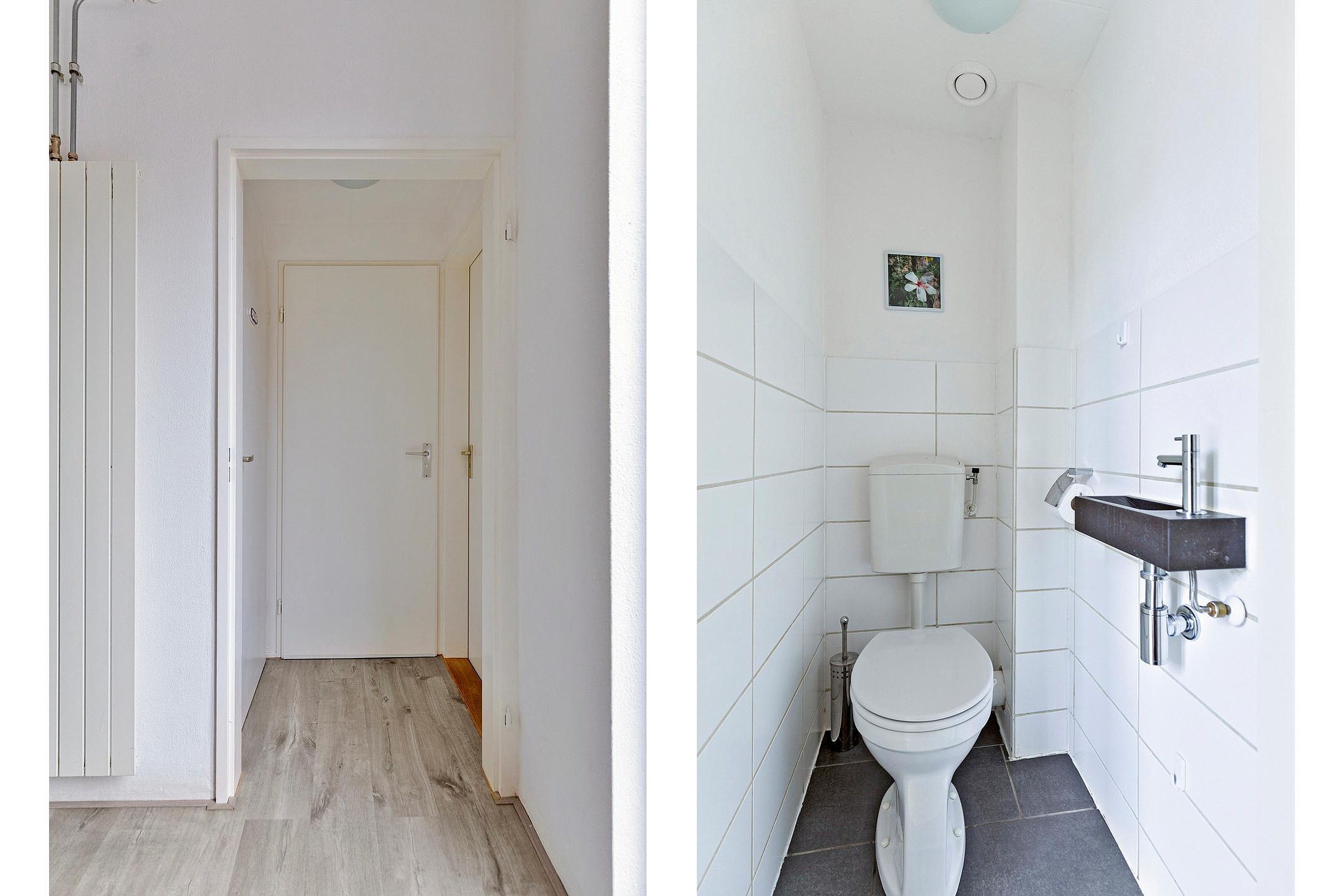 Toilet, grotendeels betegeld en voorzien van een staand closet en fonteintje.