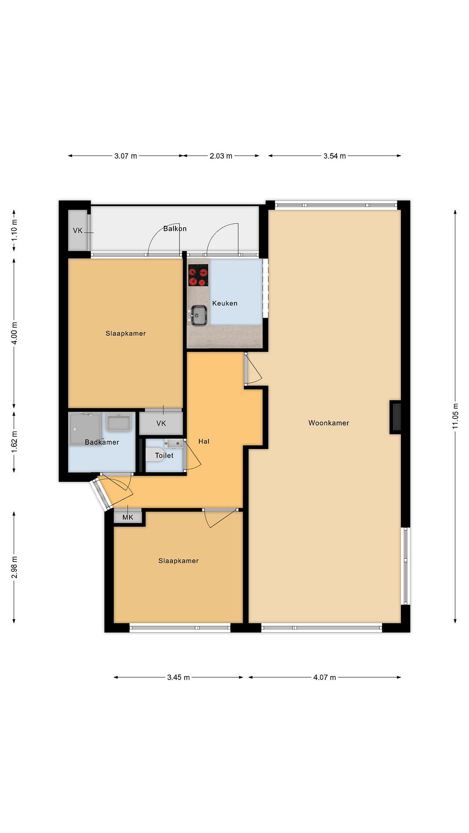 Je komt het complex binnen in een gemeenschappelijk portiek met een trappenhuis zowel naar het souterrain (berging) als naar de woonlagen. Op de tweede woonlaag betreed je het appartement in een keurige hal met toegang tot het toilet, de badkamer, de slaapkamers en woonkamer. De doorzon living is heerlijk licht door de grote raampartijen in kunststof kozijnen en door de hoekligging ook het extra zijraam. Er is een open keuken, in hoekopstelling geplaatst, die is voorzien van inbouwapparatuur als een kookplaat, combi-oven, koel- en vrieskast. De living is bij elkaar ruim 40m2 groot! Zowel aan de voor- als achterzijde van het appartement vind je nagenoeg even grote slaapkamers. De slaapkamer aan de achterzijde is momenteel in gebruik als hoofdslaapkamer, die aan de voorzijde als kastenkamer. In het hart van het appartement is het sanitair gesitueerd. Een keurig, modern toilet en evenzo moderne badkamer, geheel betegeld en voorzien van inloopdouche en wastafelmeubel. Vanuit de keuken kom je op het balkon, op het Westen gelegen met wijds zicht.