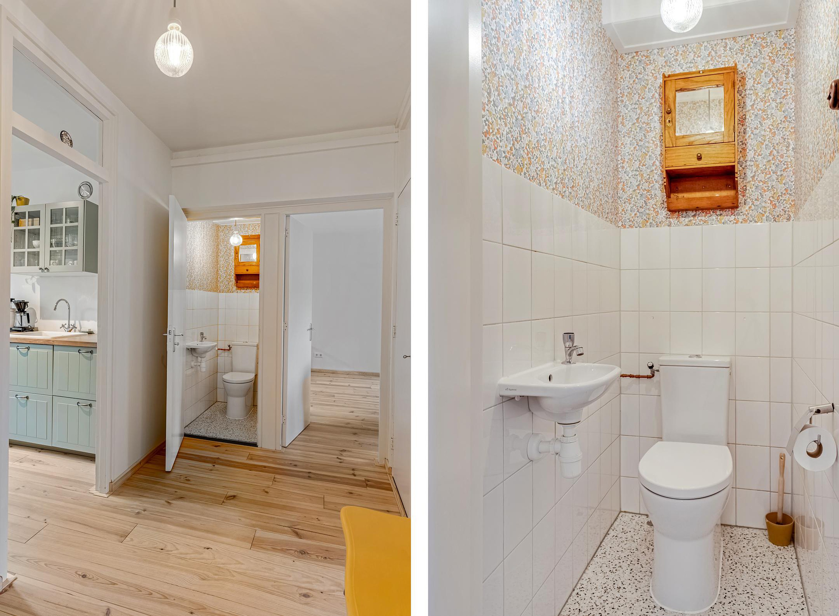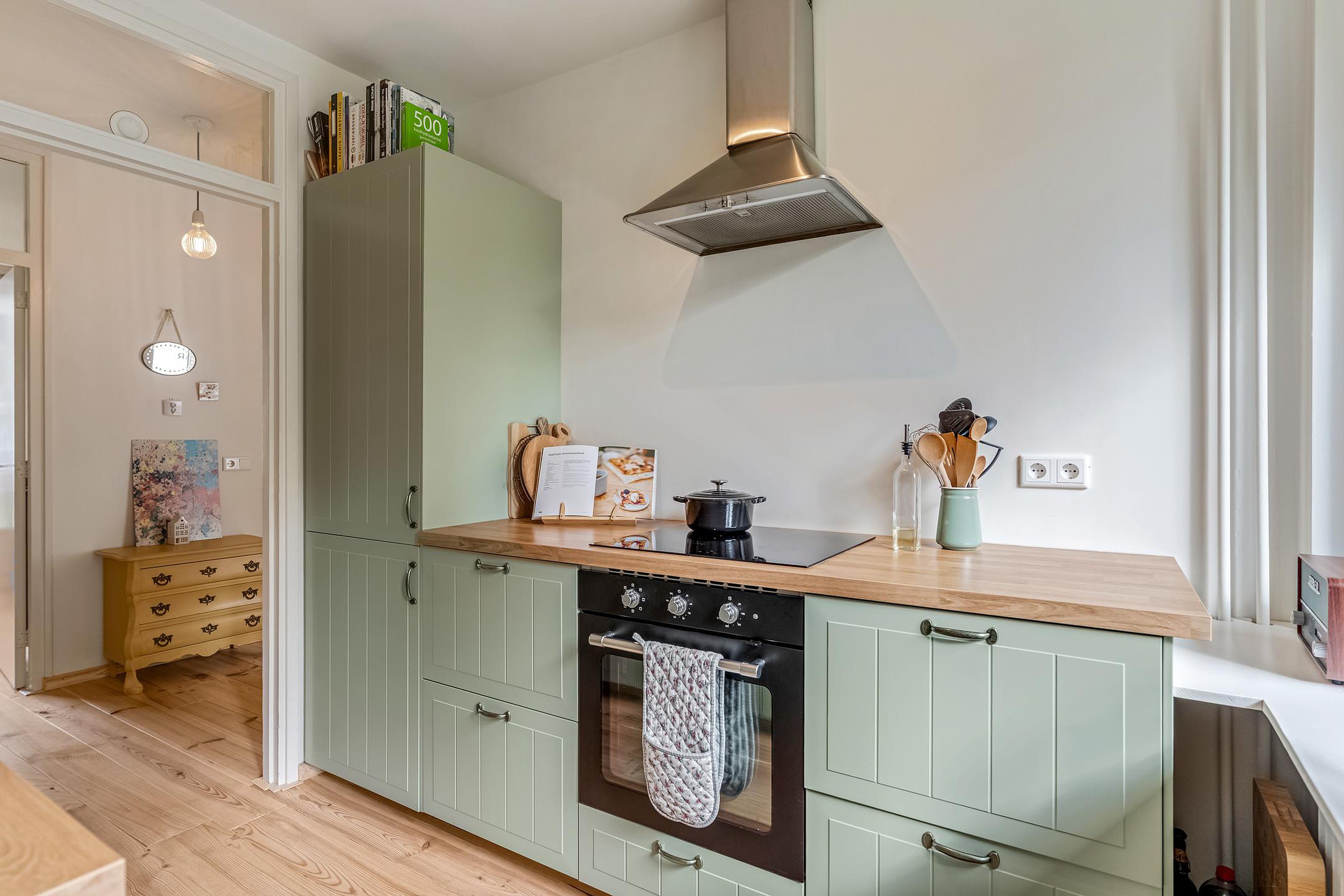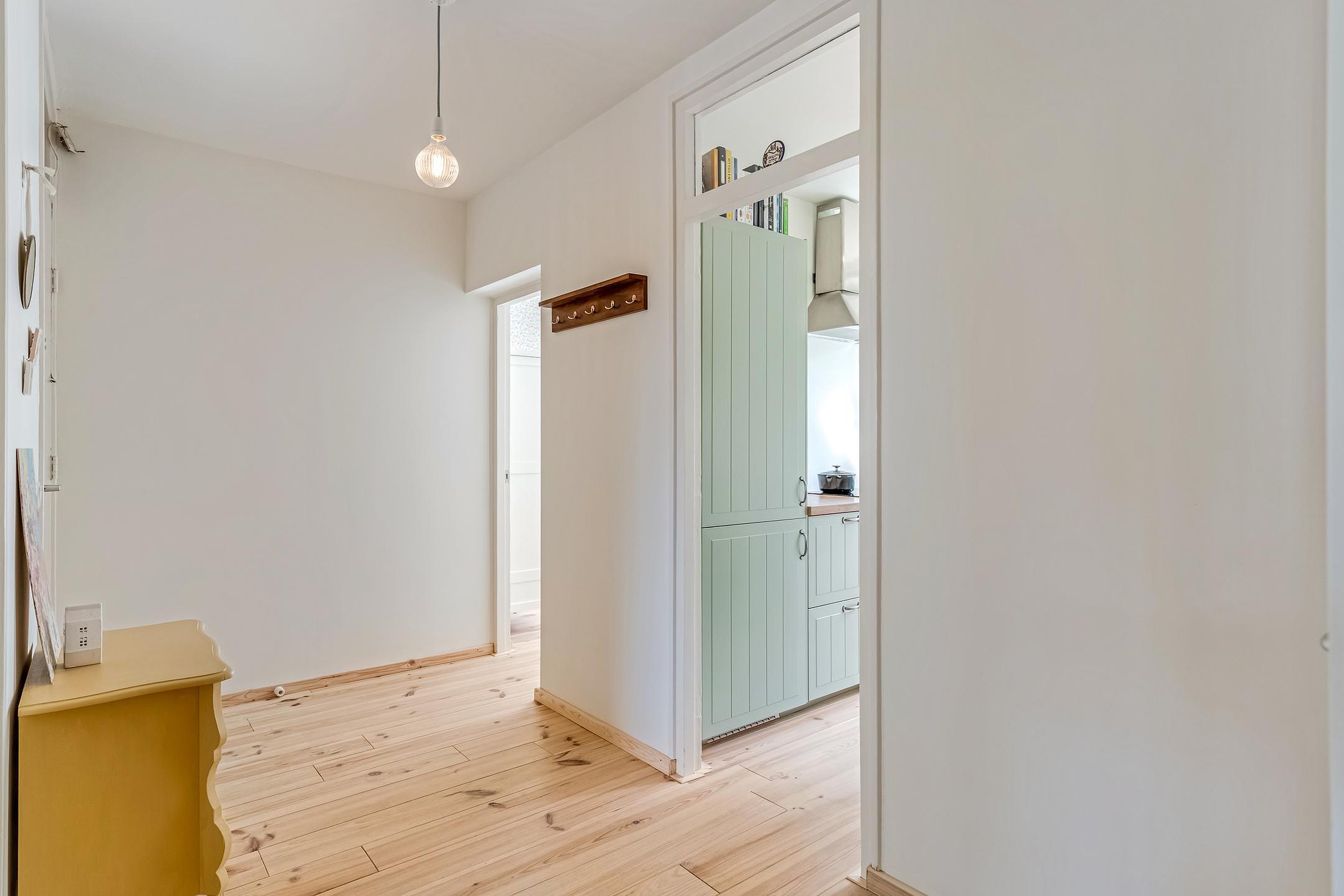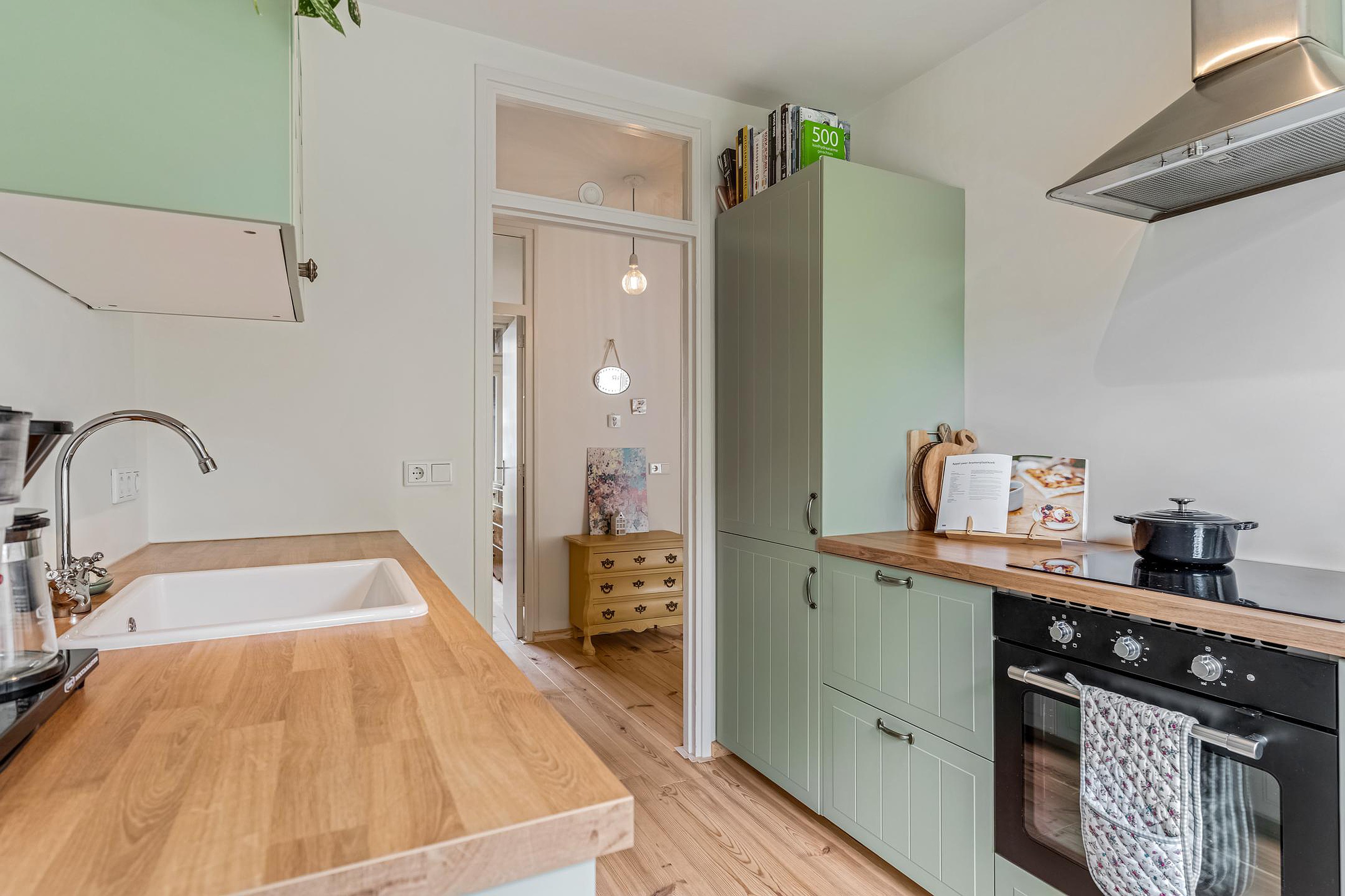 Ruime hal met meterkast, apart toilet met fonteintje en toegang tot de woonkamer, keuken en de twee slaapkamers. De gesloten keuken is in 2024 eveneens geheel gerenoveerd en voorzien van olijfgroene kastjes en diverse inbouwapparatuur zoals een koel/vriescombinatie, oven, inductiekookplaat en afzuigkap. Op de keuken zit nog geruime tijd garantie.