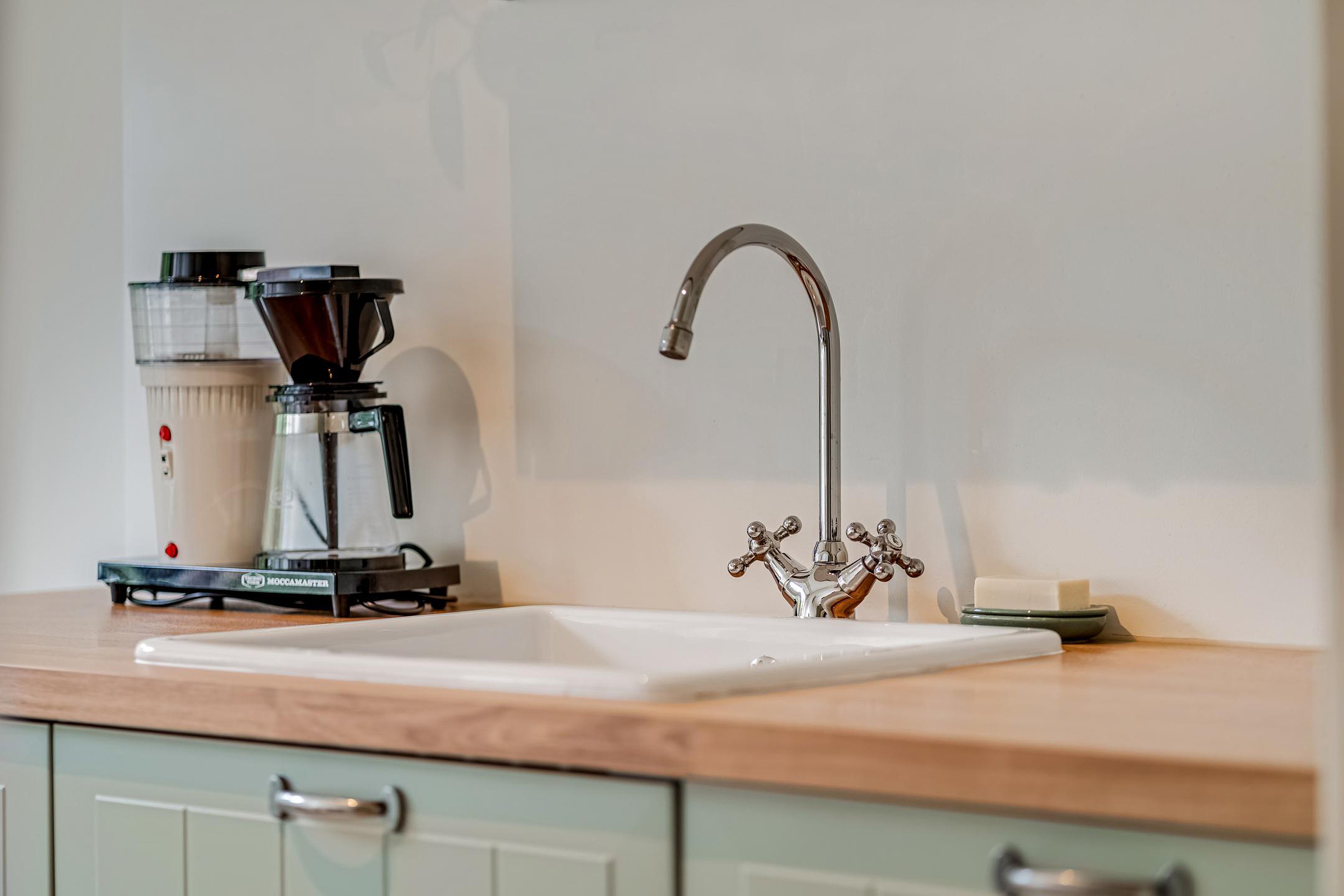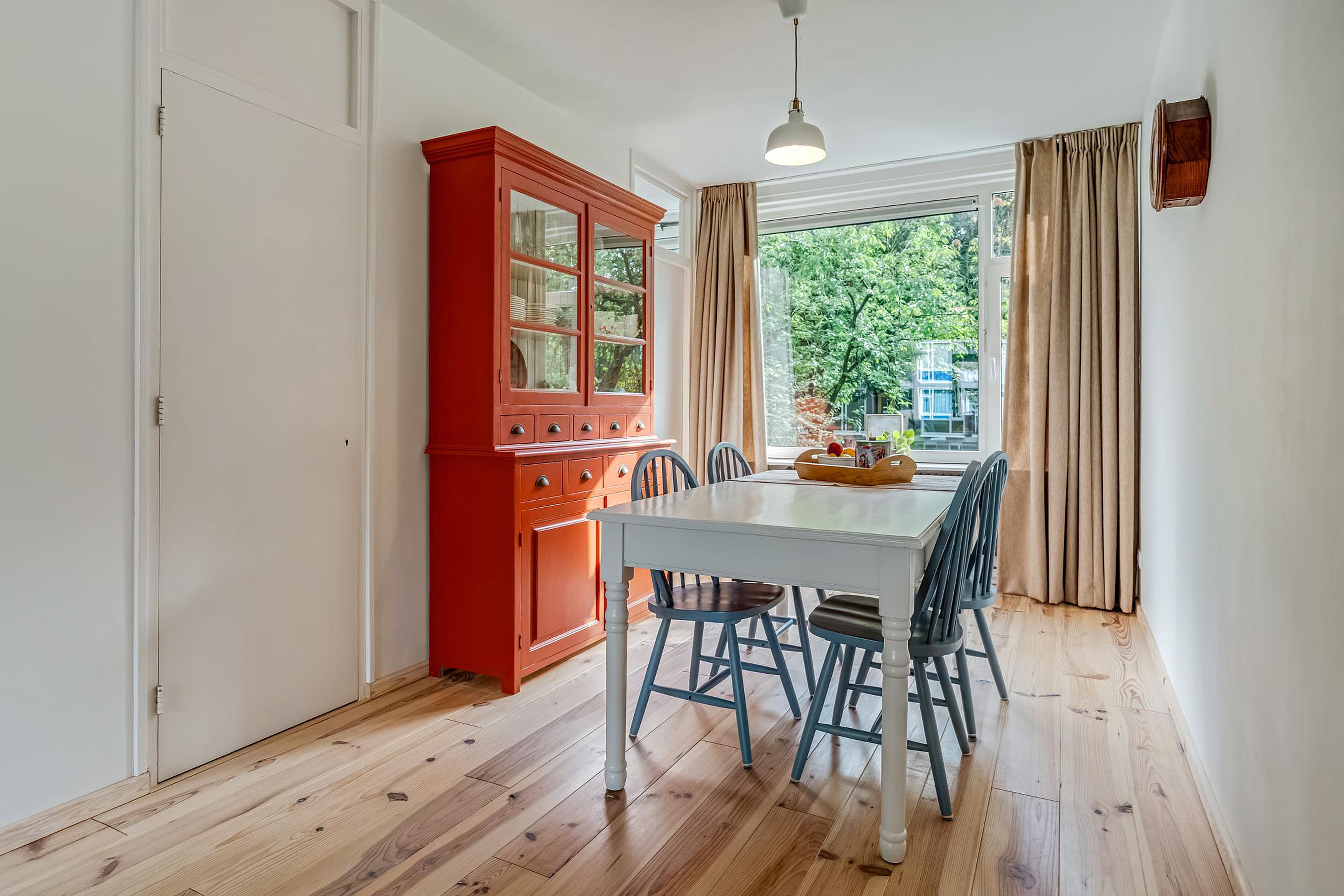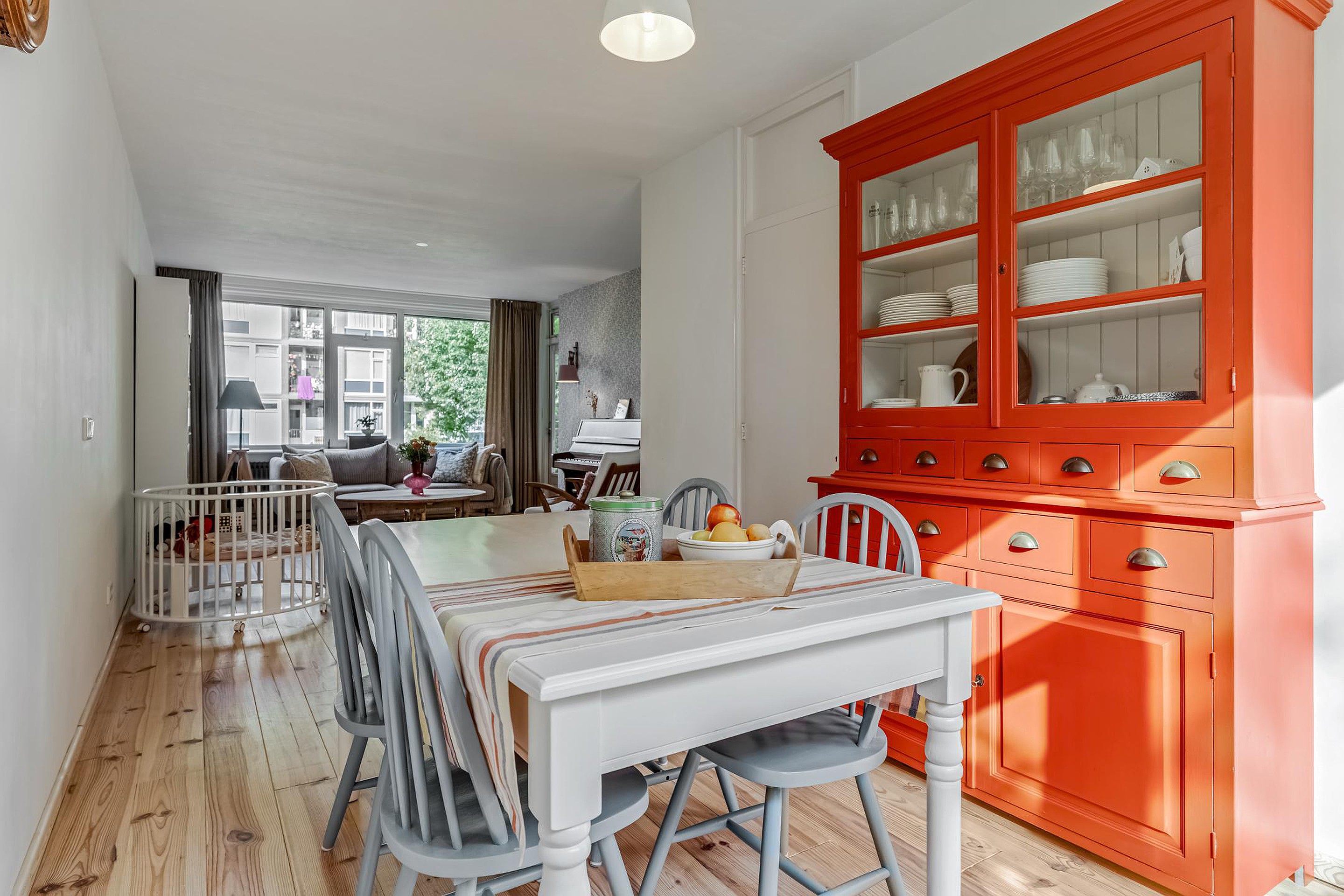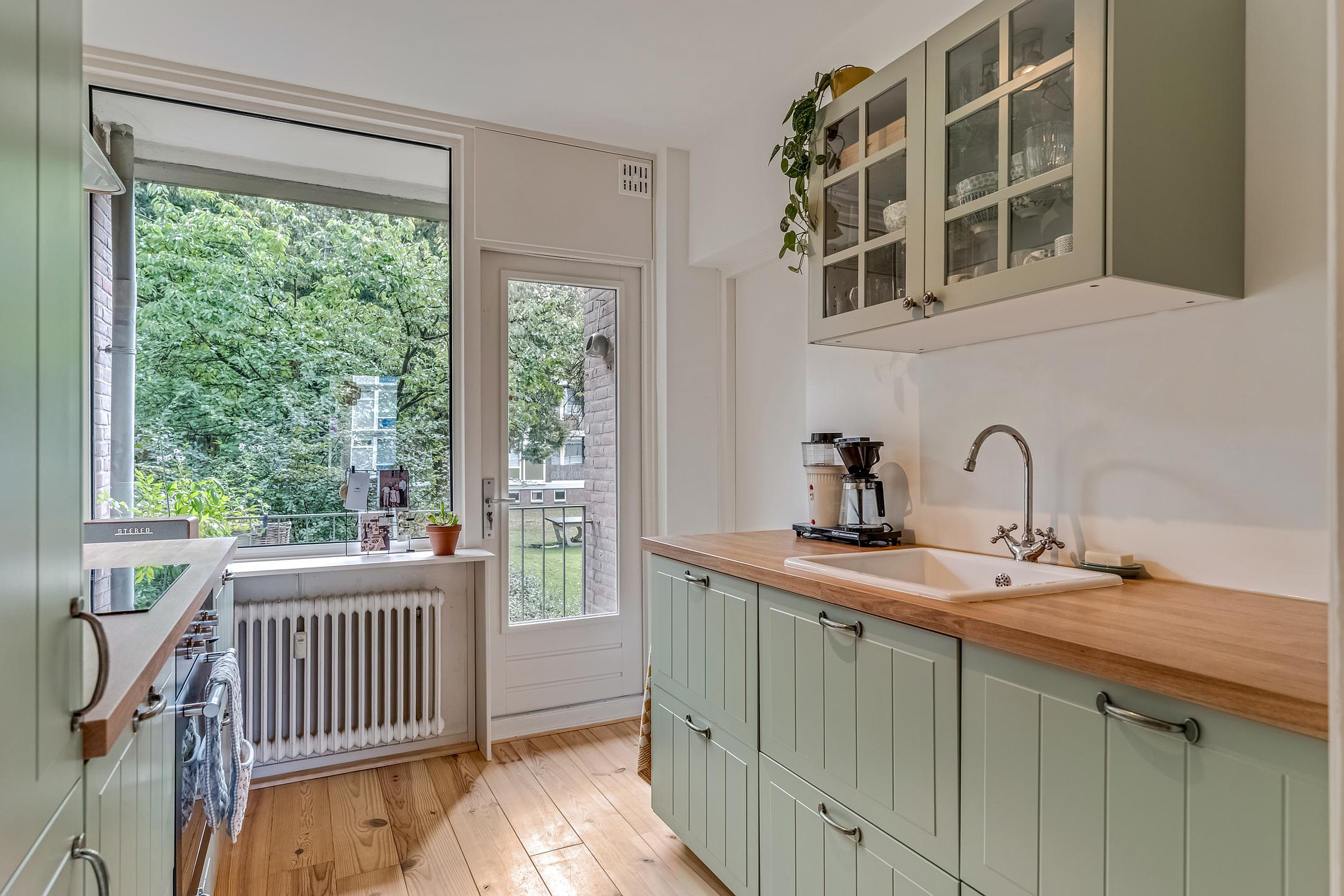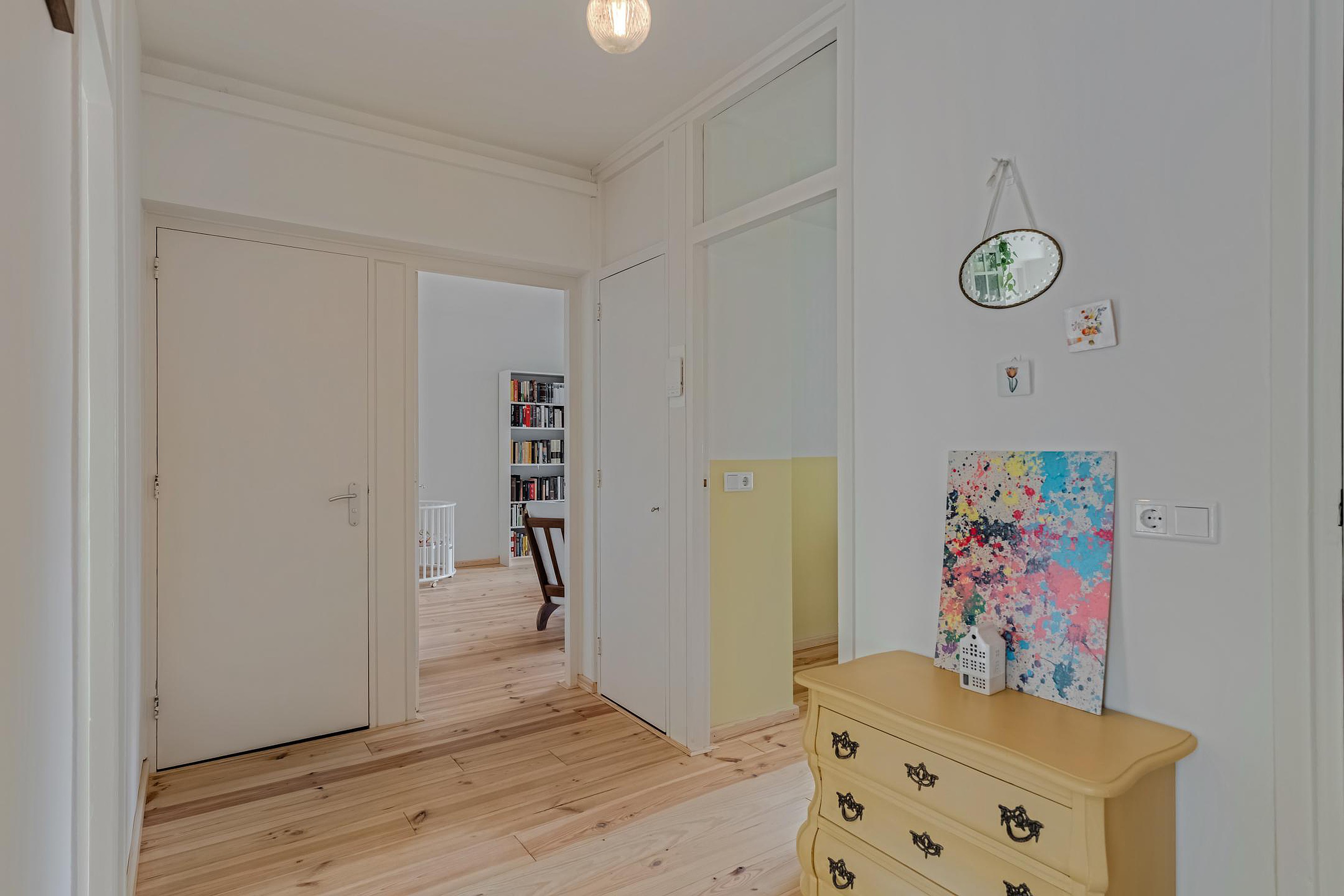 Ruime hal met meterkast, apart toilet met fonteintje en toegang tot de woonkamer, keuken en de twee slaapkamers. De gesloten keuken is in 2024 eveneens geheel gerenoveerd en voorzien van olijfgroene kastjes en diverse inbouwapparatuur zoals een koel/vriescombinatie, oven, inductiekookplaat en afzuigkap. Op de keuken zit nog geruime tijd garantie.