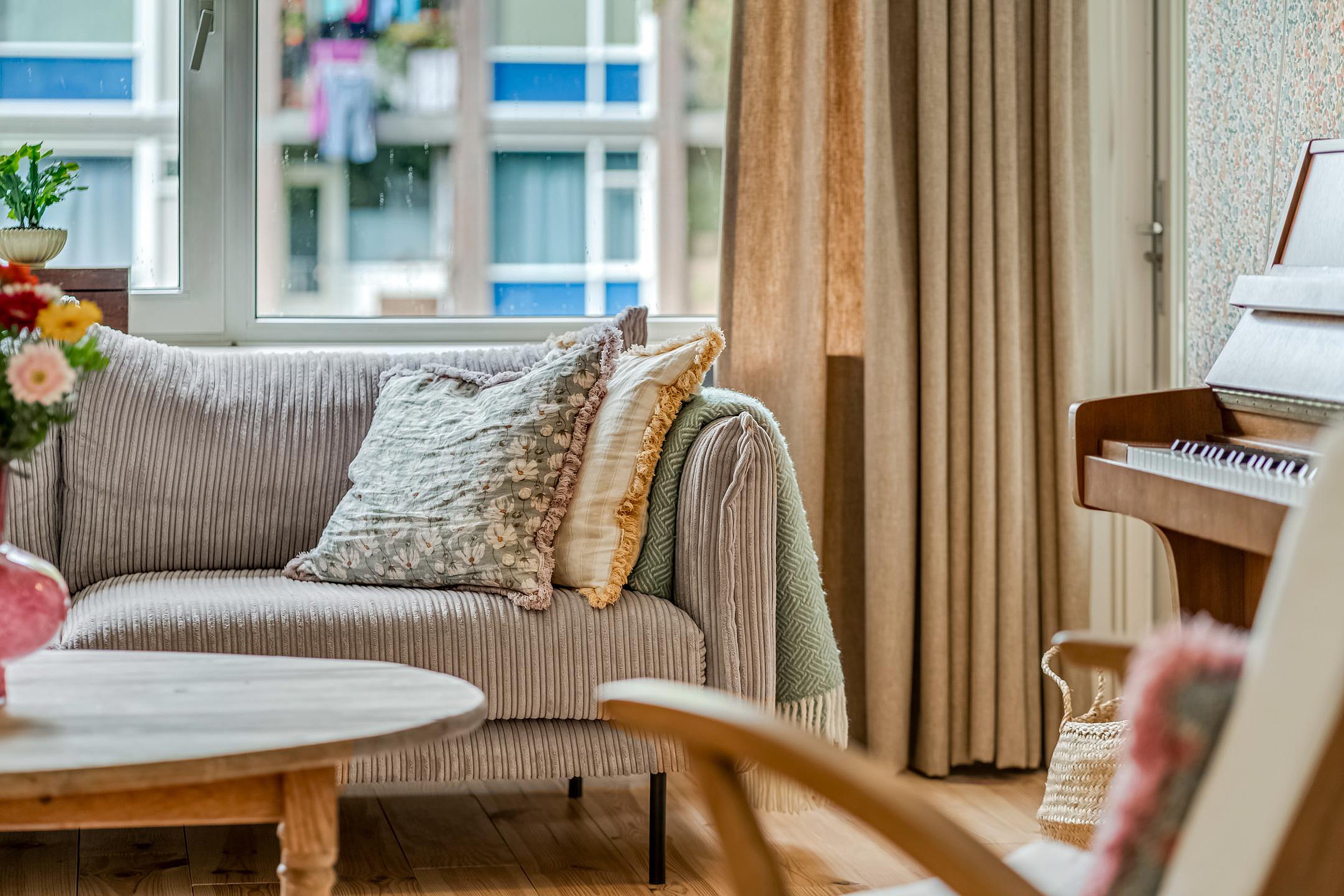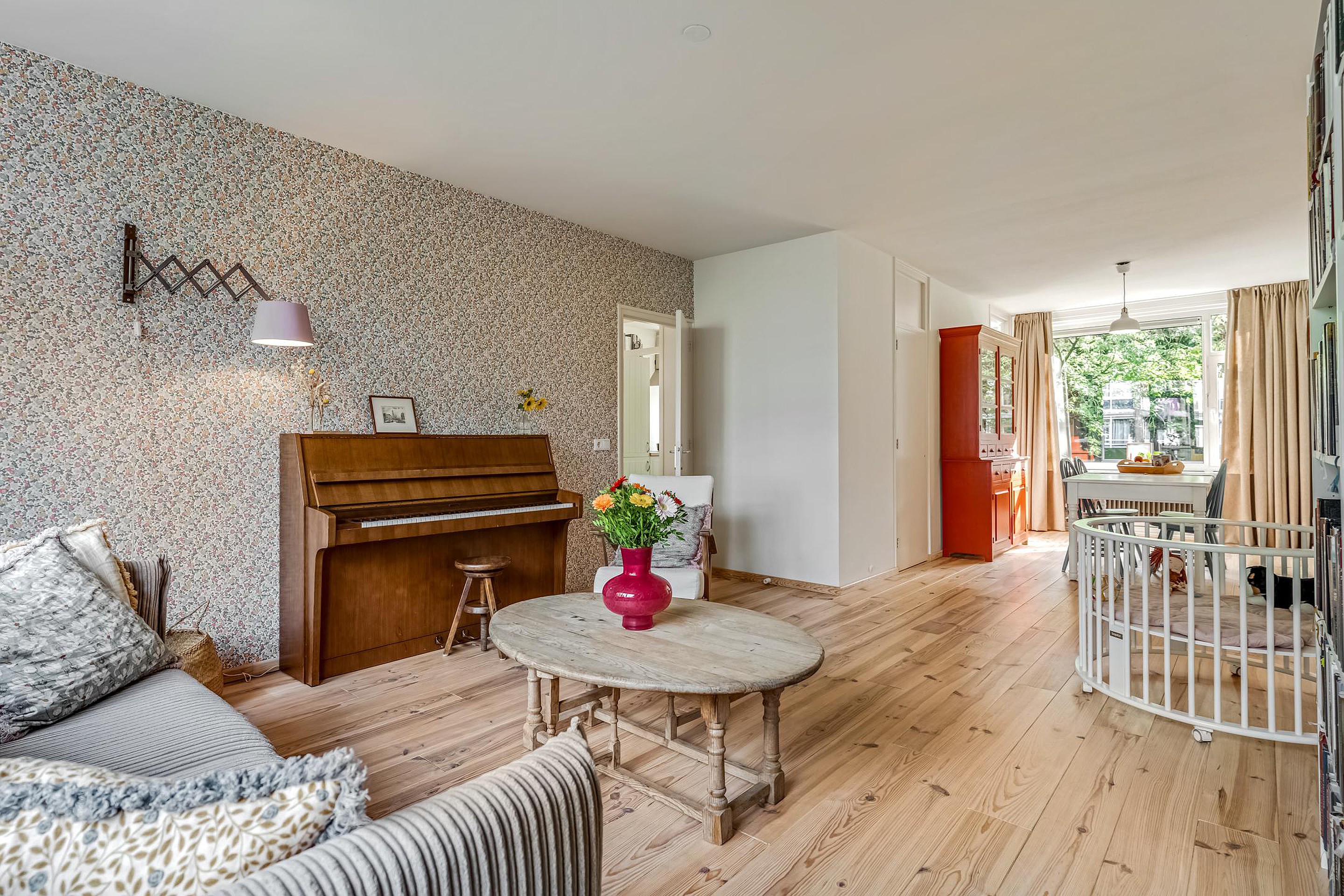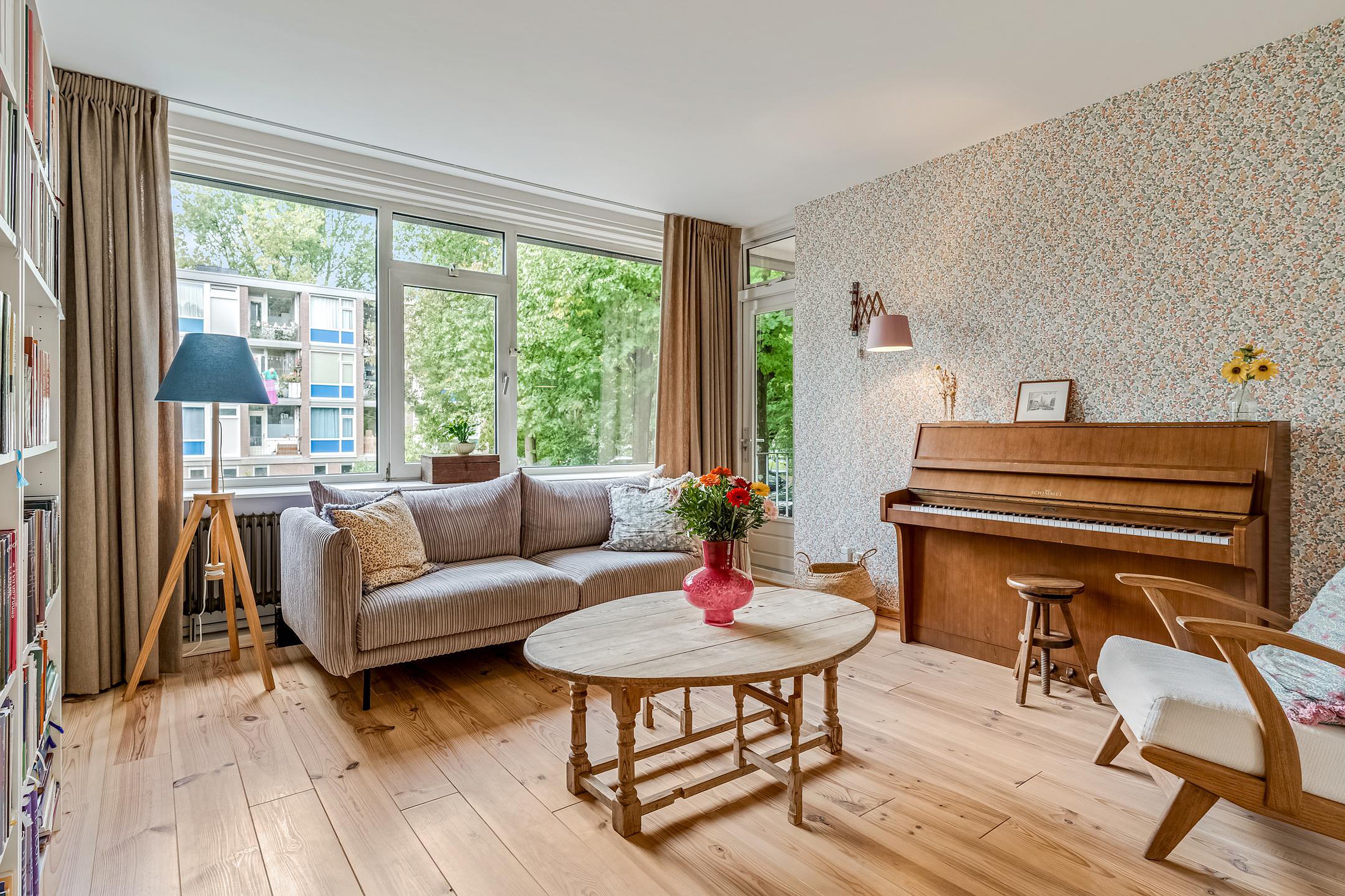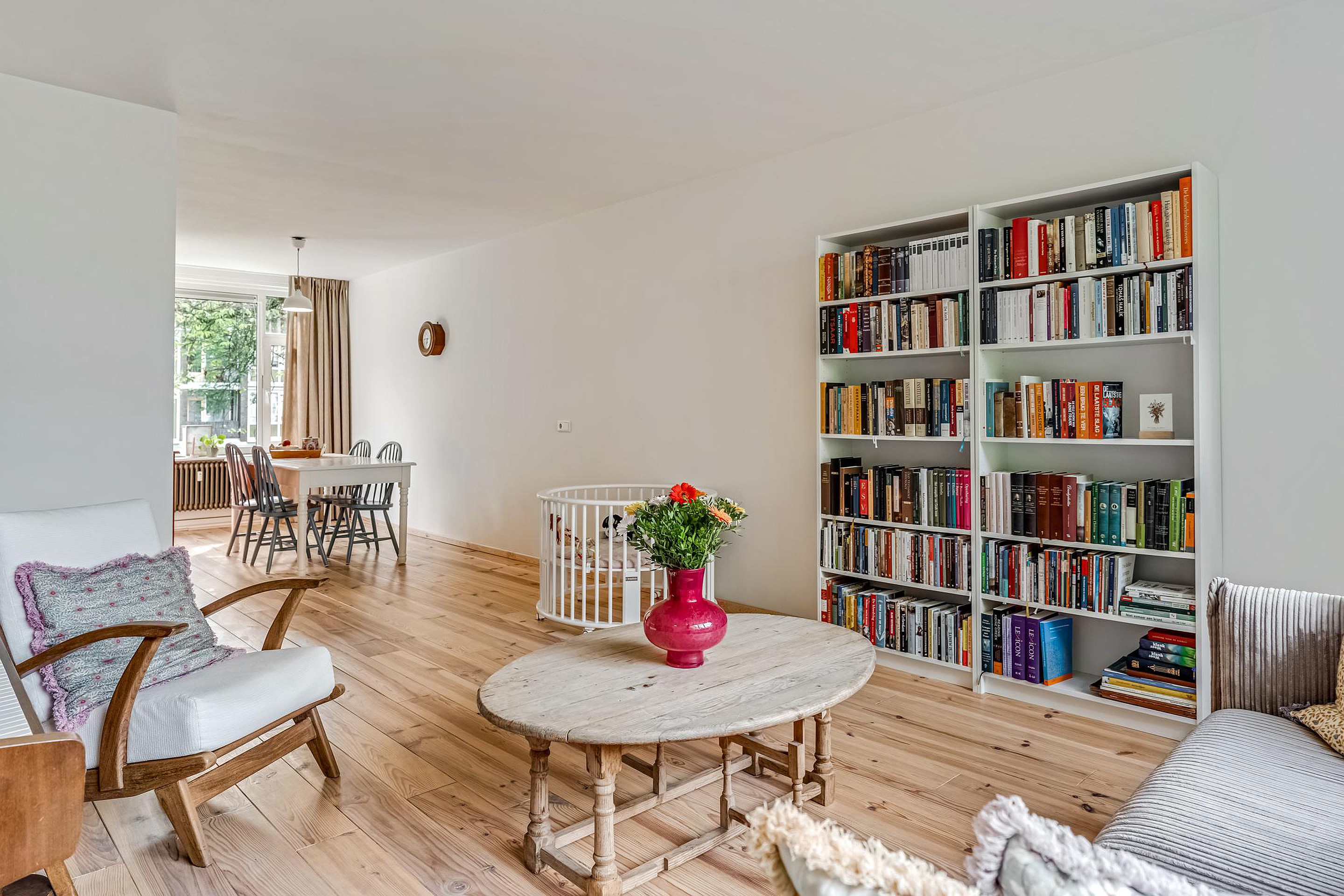 De lichte en ruime woonkamer heeft een warme Scandinavische sfeer met grote raampartijen, een massief houten vloer en toegang tot het balkon op het westen.