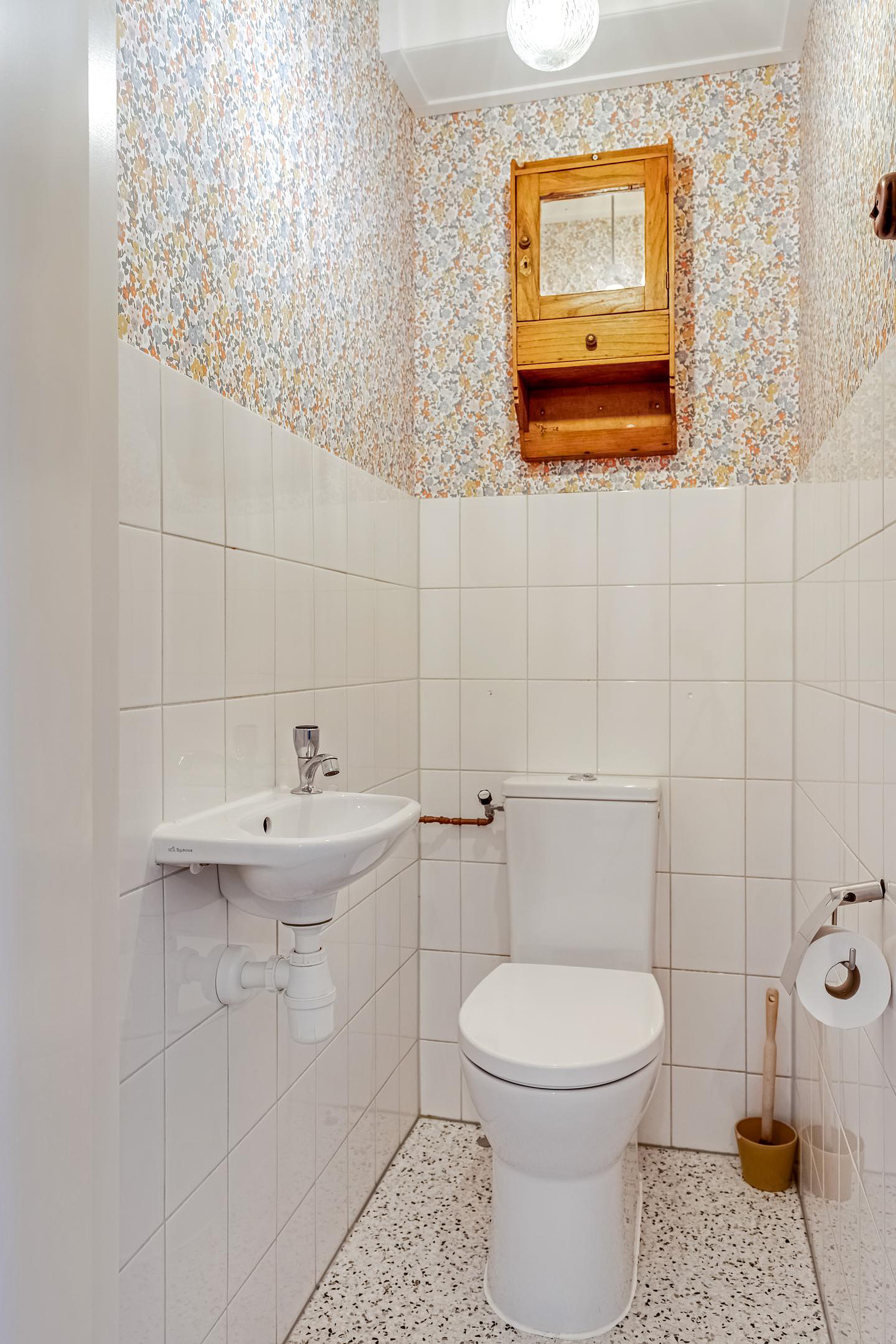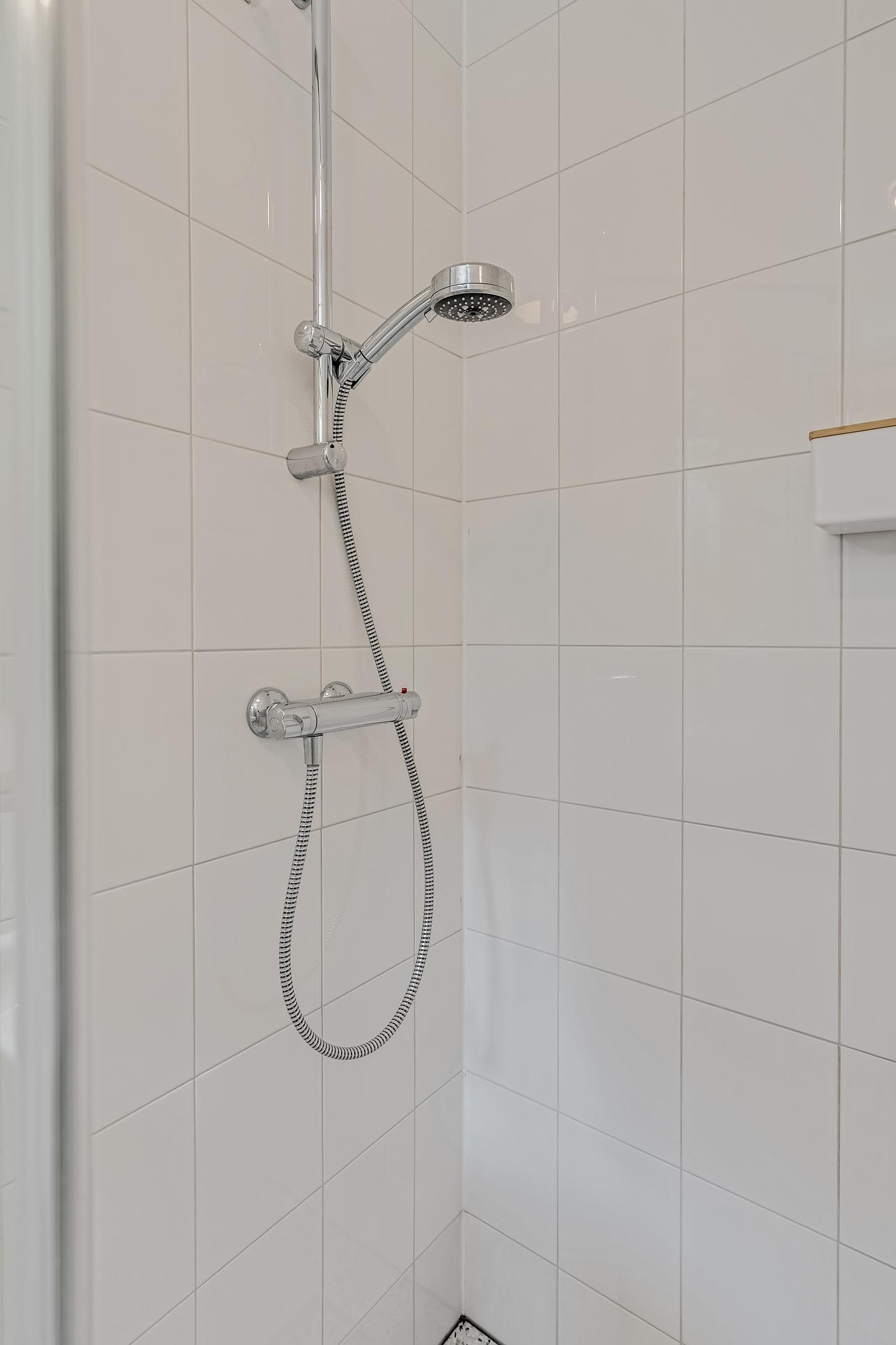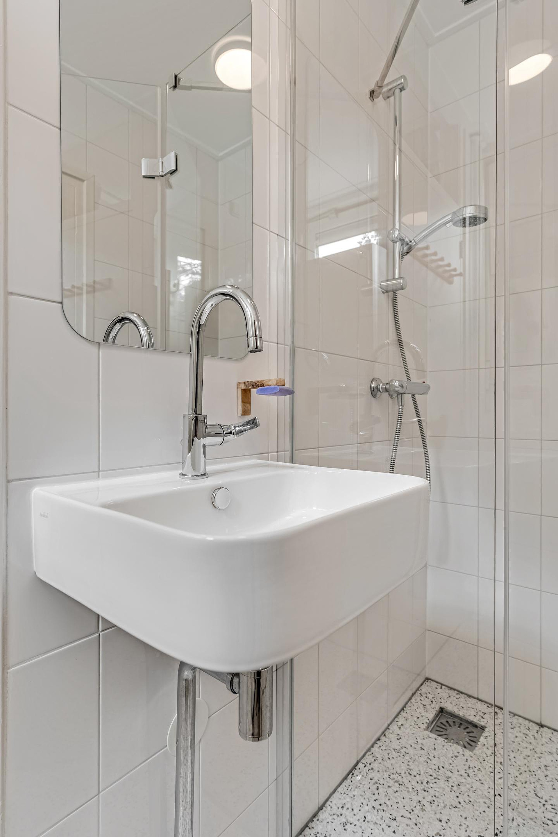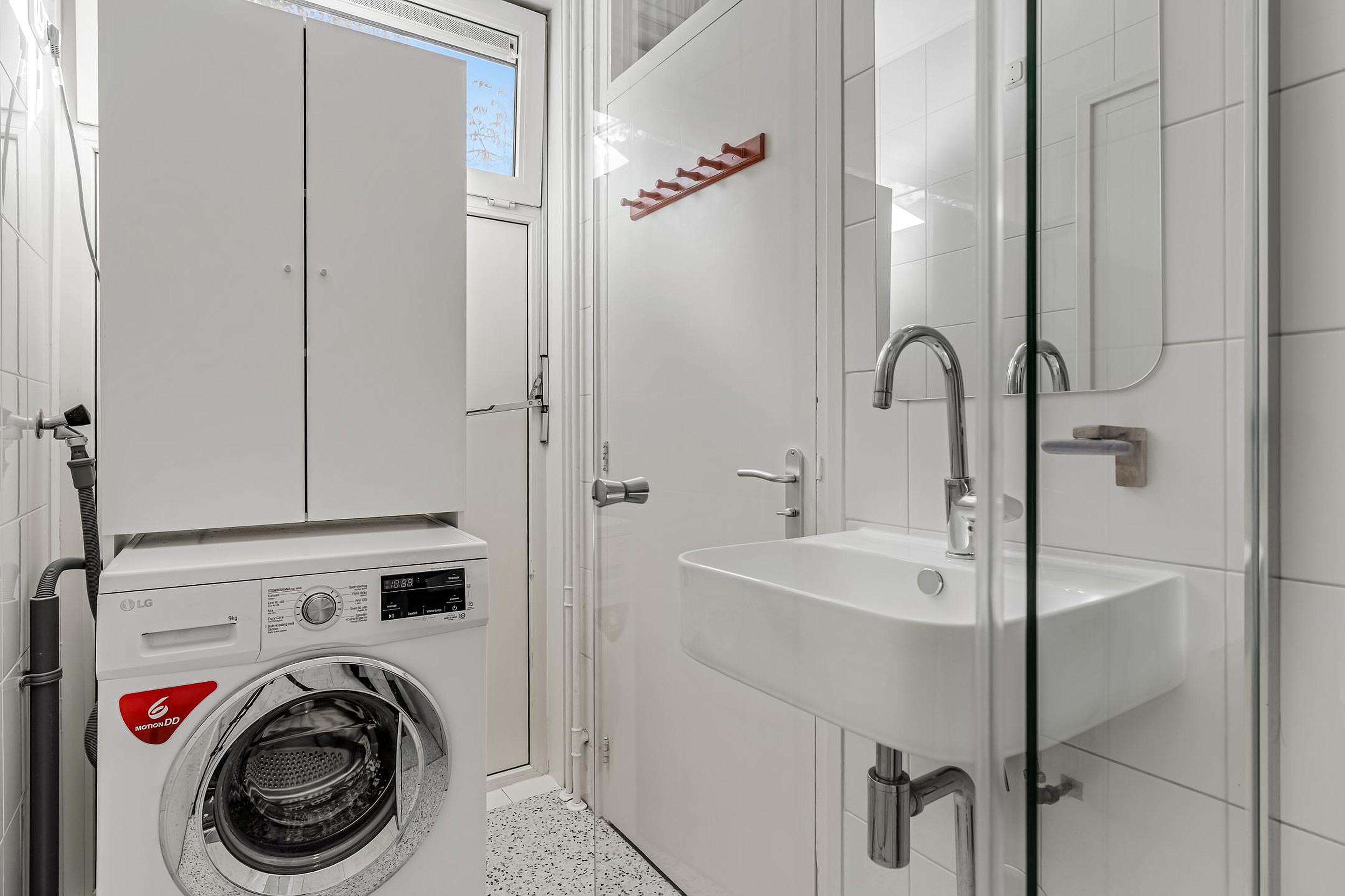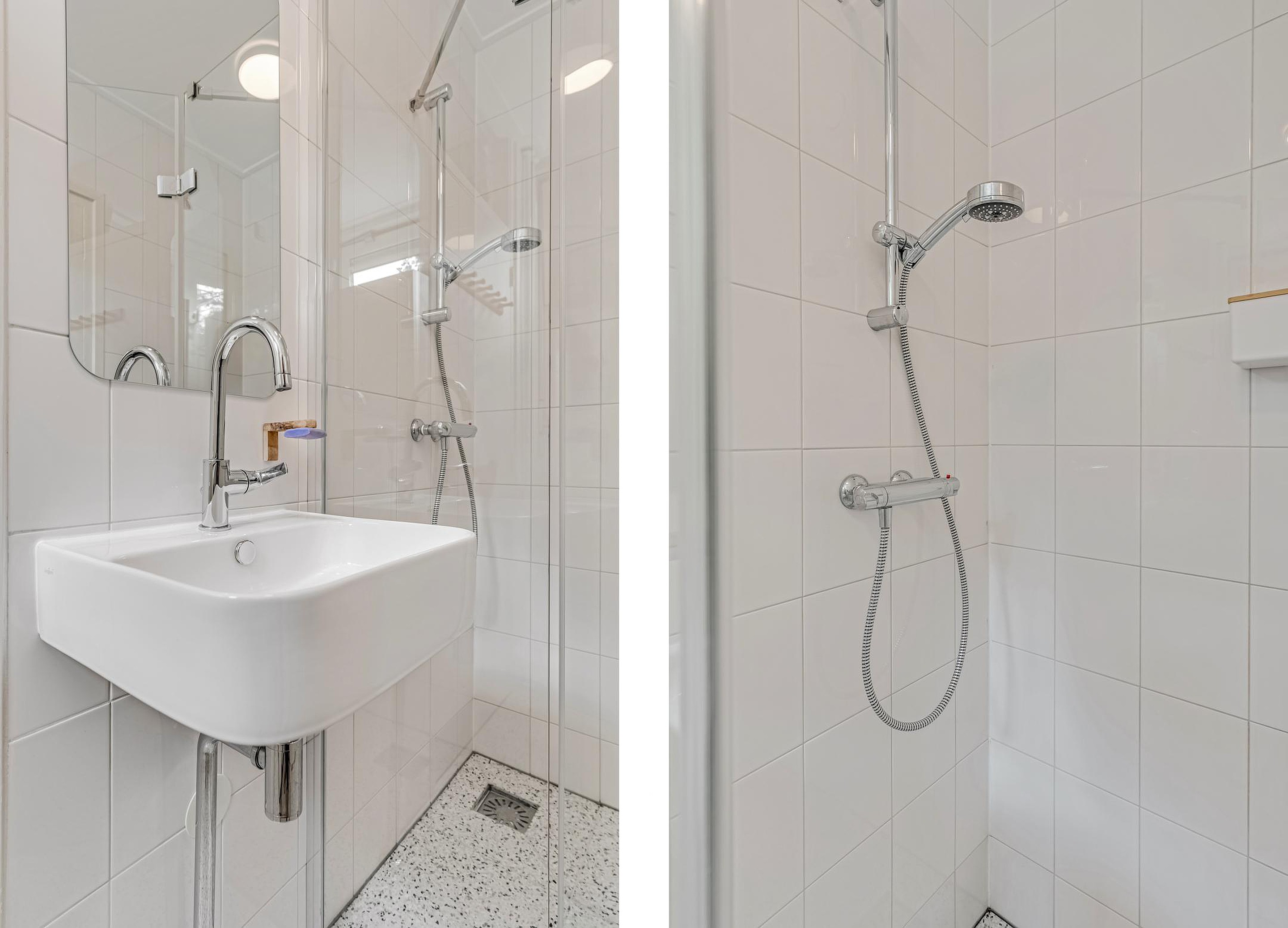 De badkamer ( 2024) is vanuit de eetkamer bereikbaar en is voorzien van een douche, wastafel en aansluiting voor de wasmachine. In de eetkamer is ook een vaste kast met daarin de boiler (2024). De muren zijn in 2024 ook gestuukt en het elektra is vernieuwd voor wat betreft bedrading en stopcontacten. De woning is inmiddels ook van het gas af.