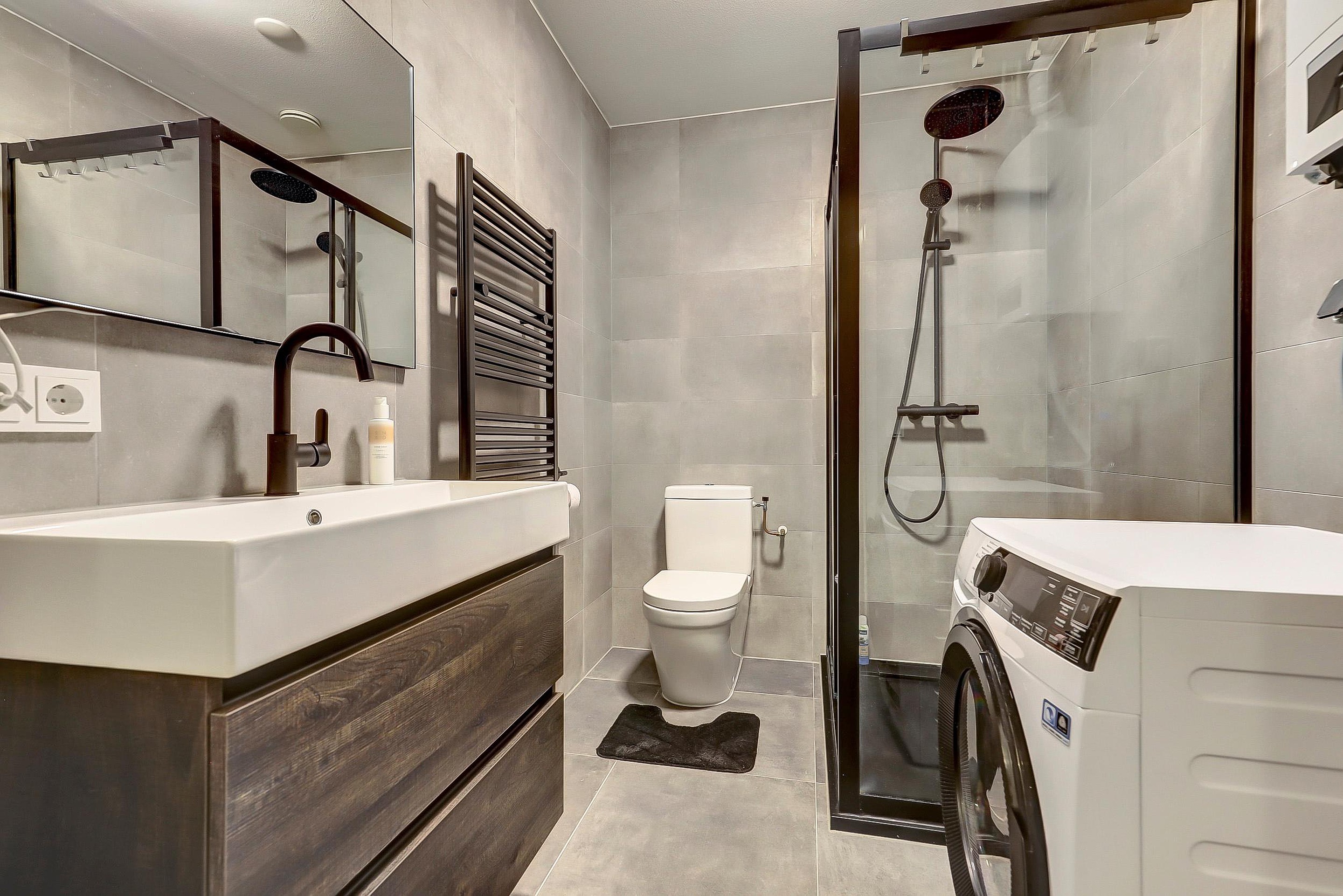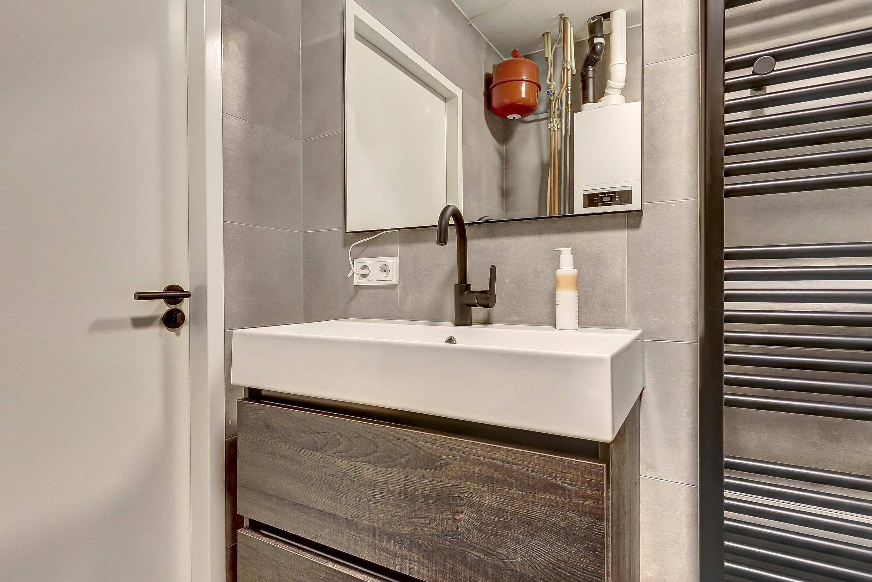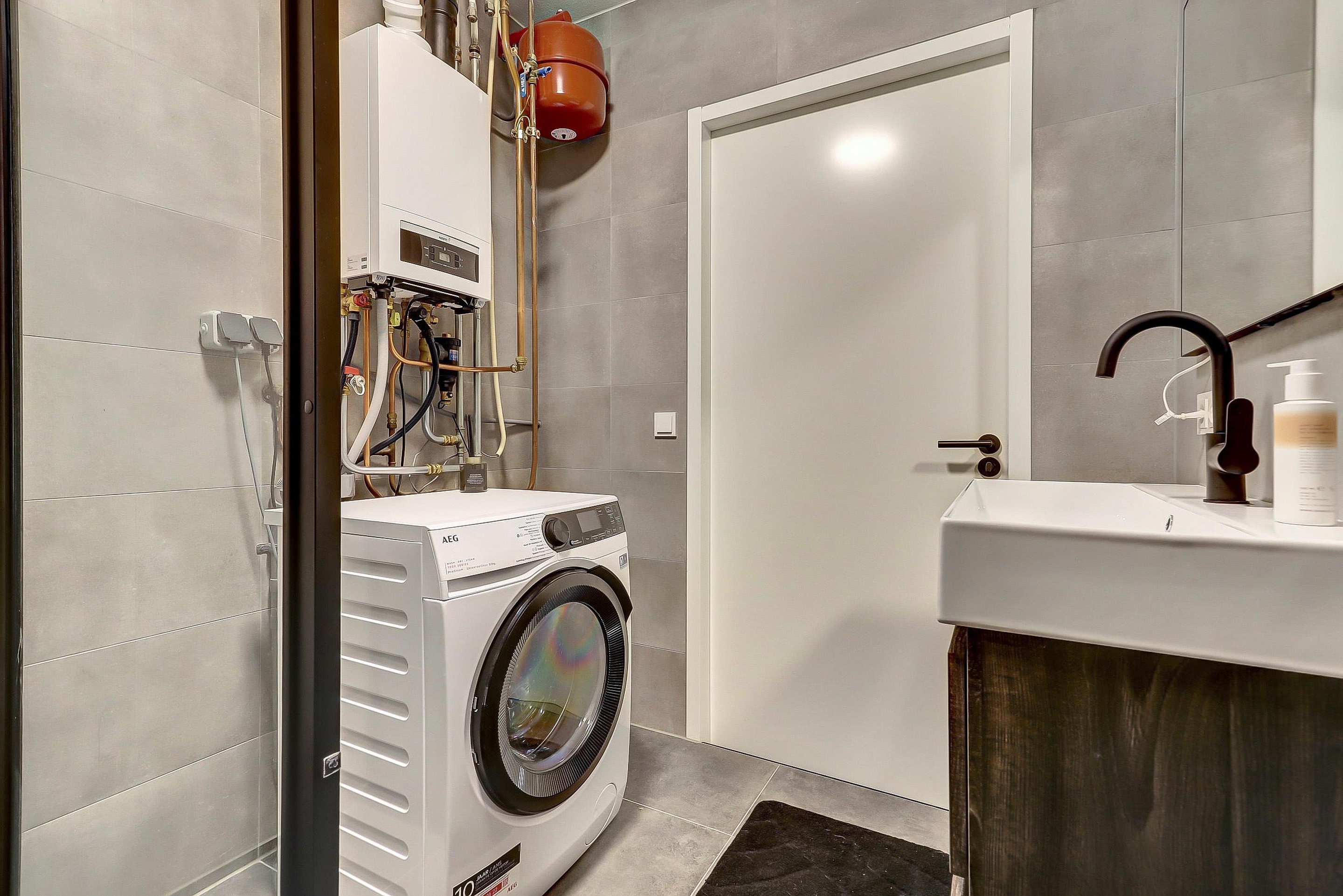 - Badkamer (2024): stijlvol betegeld en voorzien van een moderne wastafel met meubel, douchecabine, toilet, designradiator, wasmachine-aansluiting en de cv-installatie.