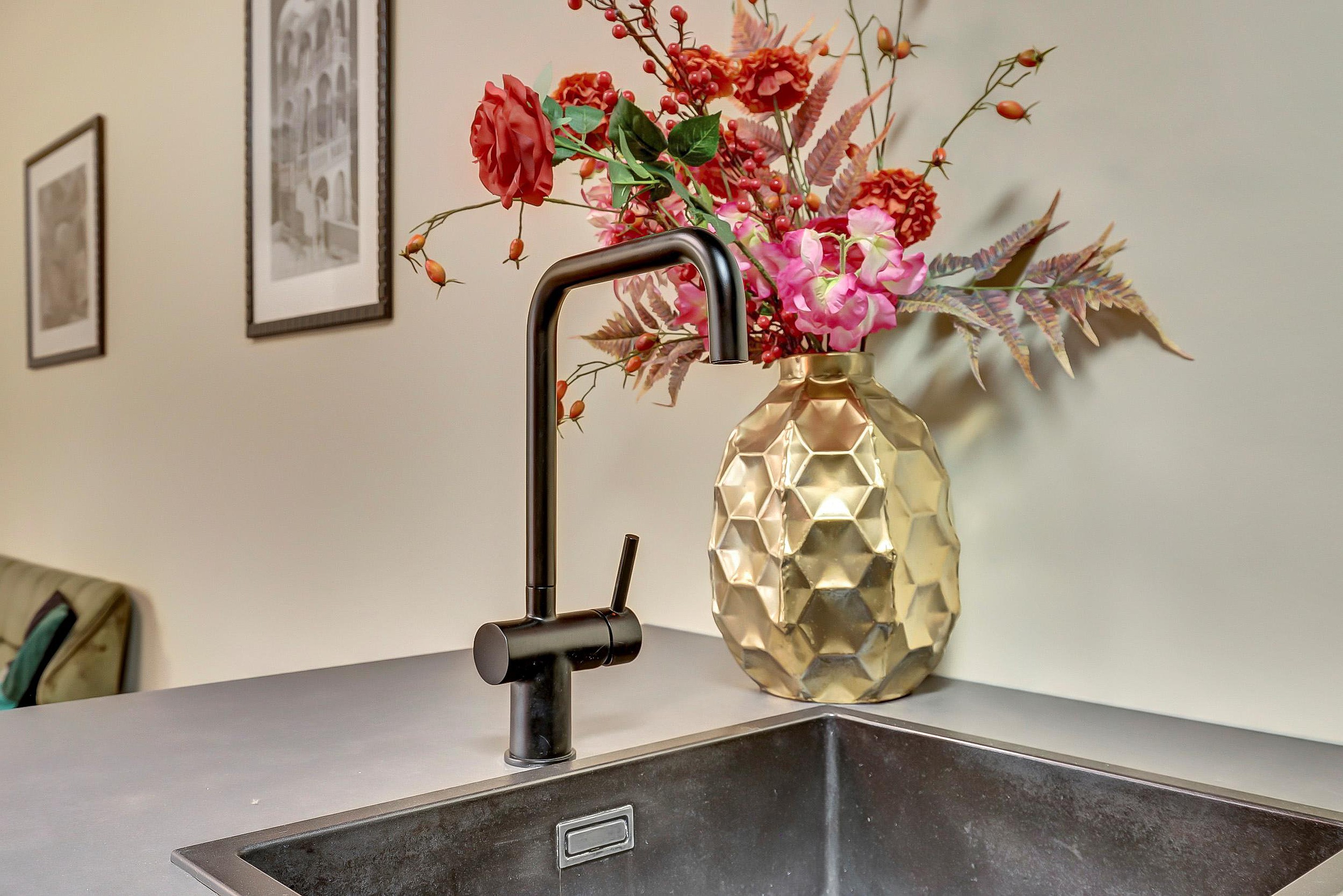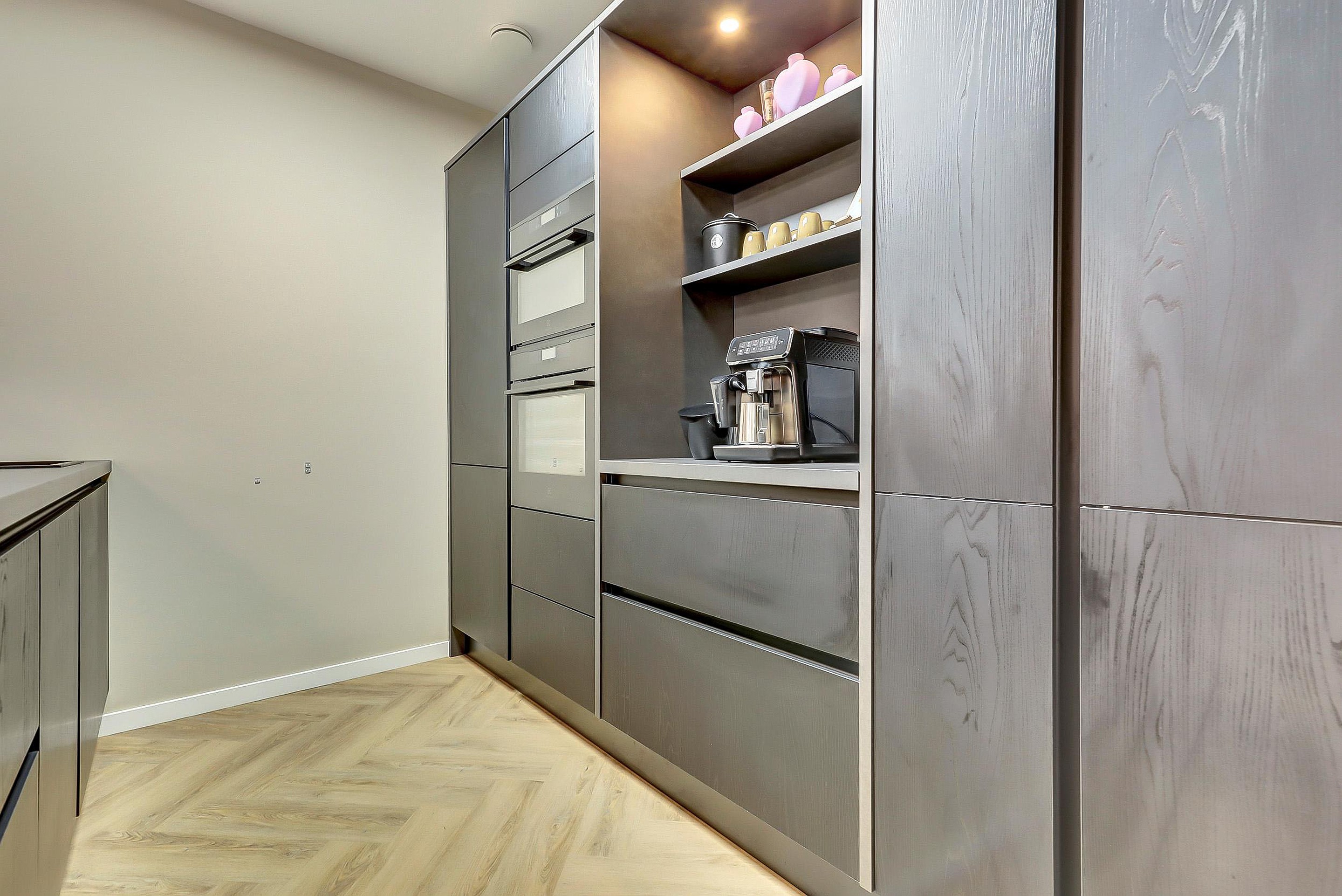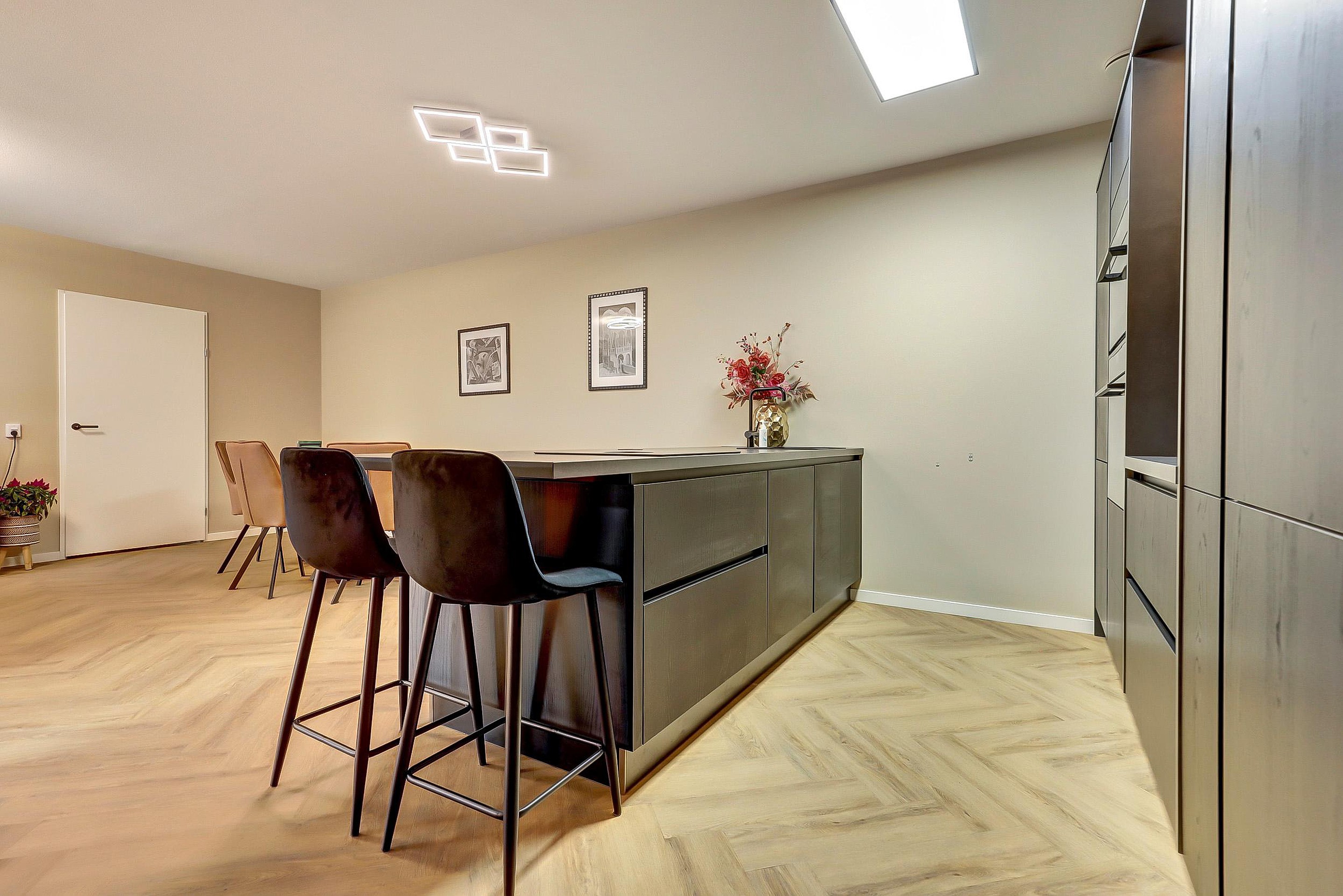 - Woonkamer & keuken (ca. 45 m2): een lichte, royale living met een nieuwe pvc-vloer en airco. De luxe open keuken (2024) is uitgerust met een inductie kookplaat met geïntegreerde afzuiging, combimagnetron, oven, koel-/vriescombinatie, apothekerskast en vaatwasser.