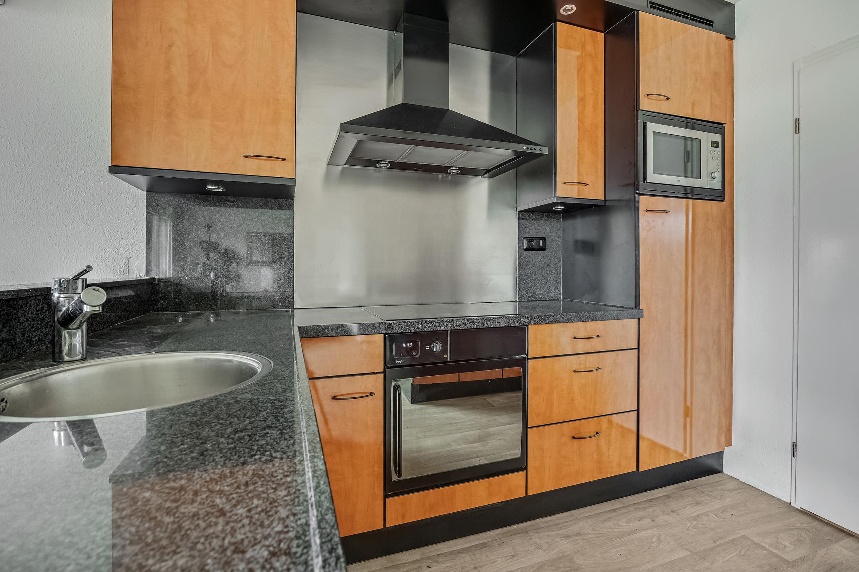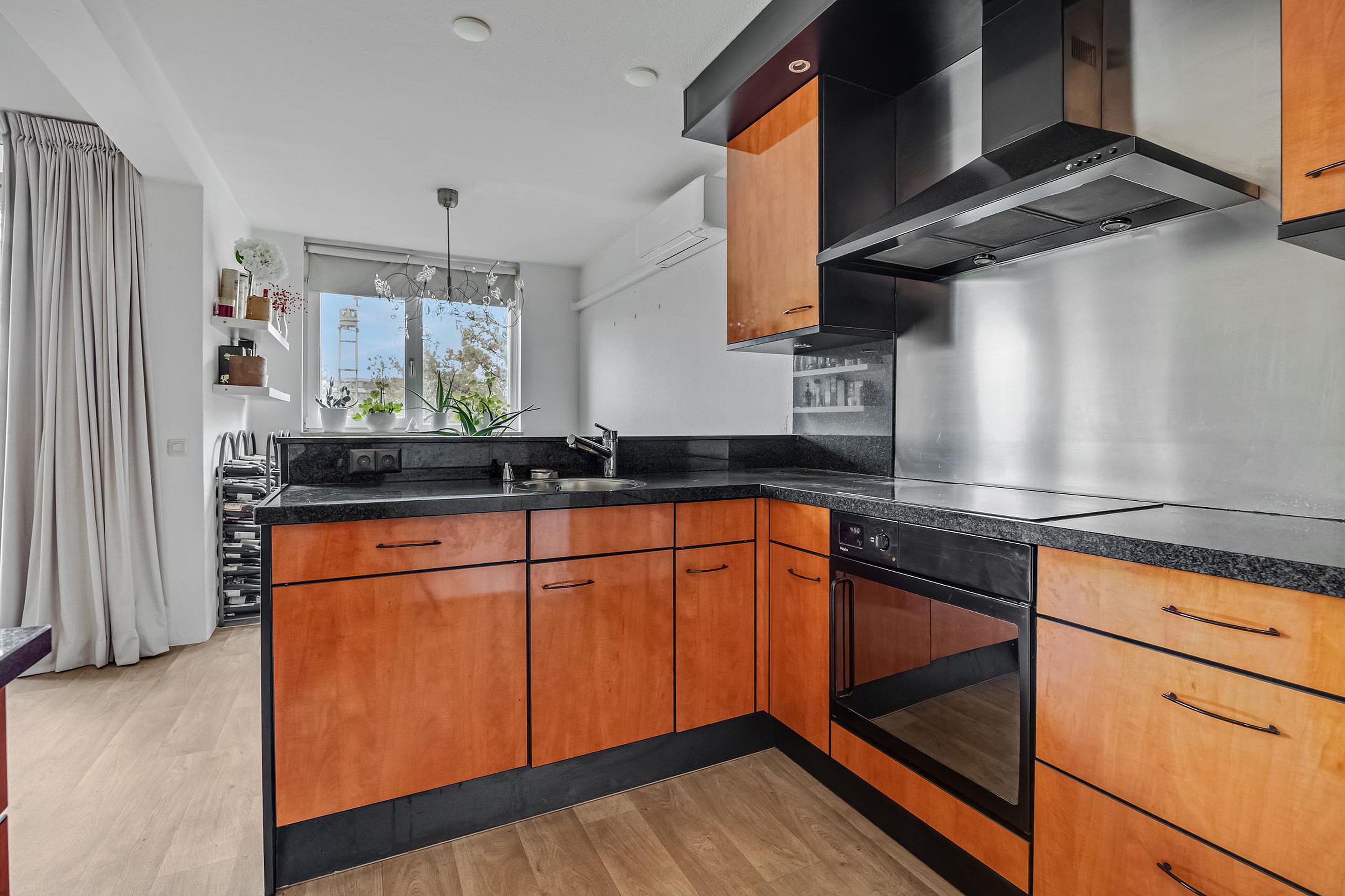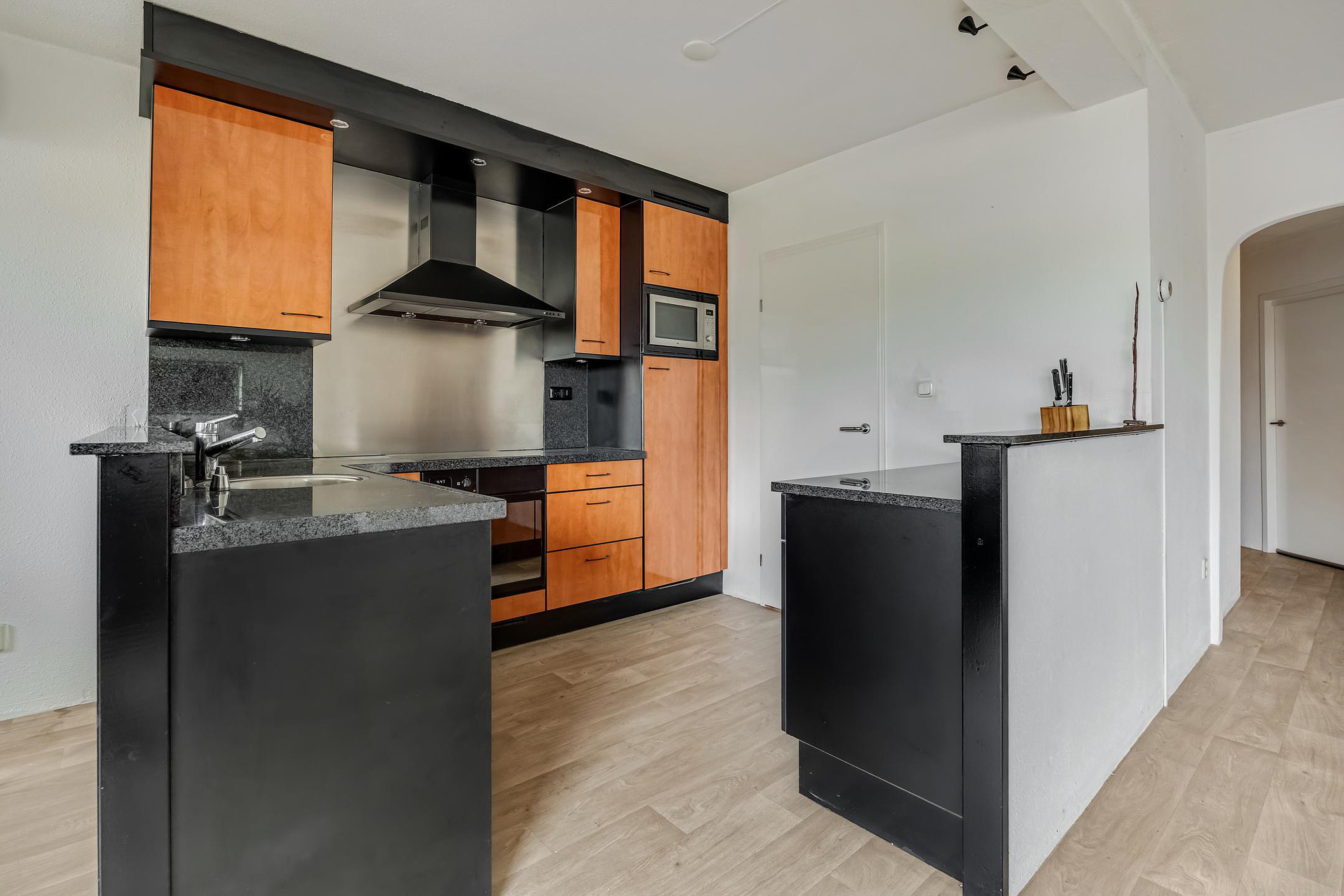 Aansluitend vind je de open keuken, die is voorzien van moderne inbouwapparatuur en alles biedt wat je nodig hebt om comfortabel te koken. Vanuit de keuken heb je toegang tot de bijkeuken met ruimte voor de wasmachine, een vriezer, extra koelkast of als voorraad ruimte.