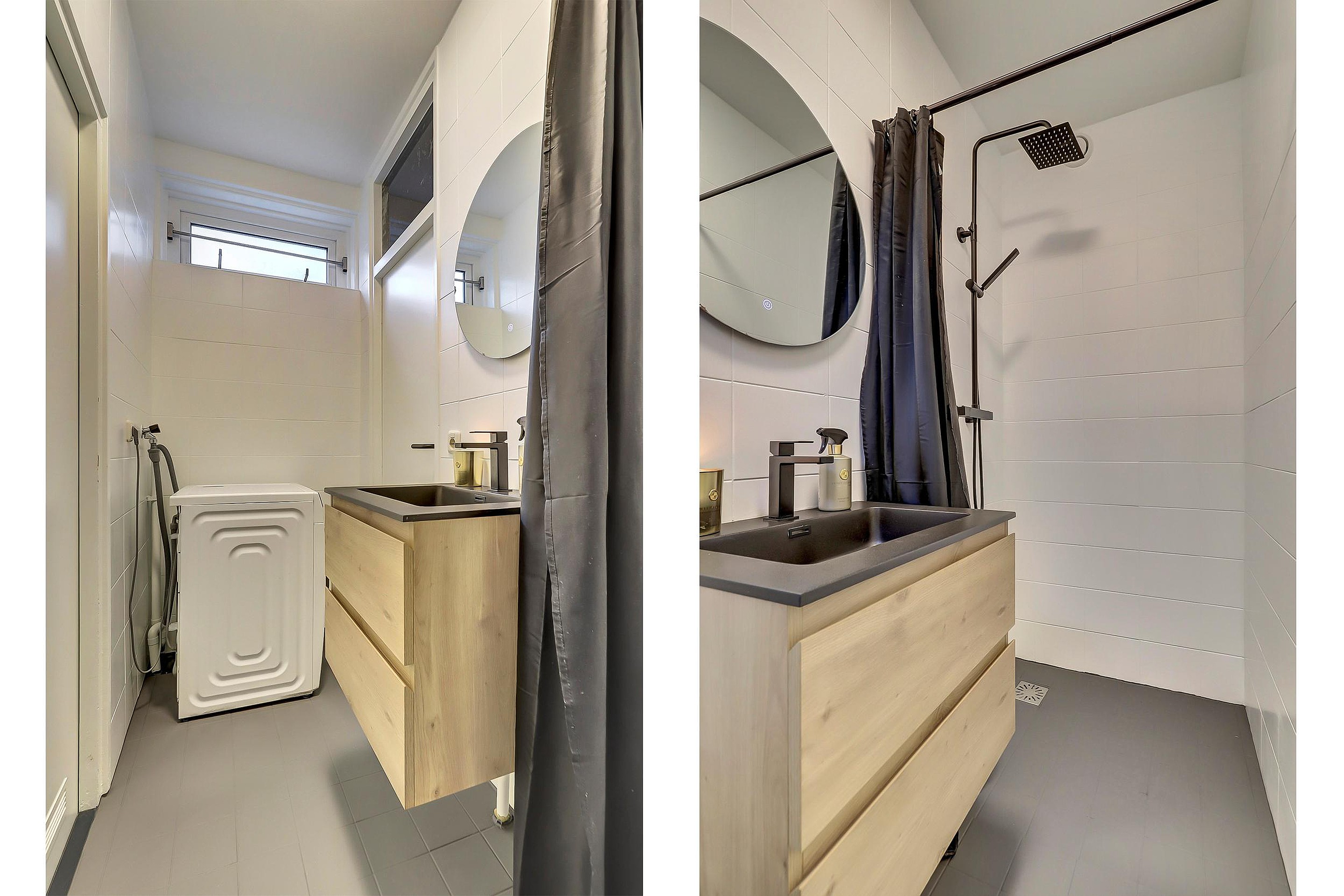 De volledig betegelde badkamer is eveneens in 2023 gerenoveerd en uitgerust met een wastafel met meubel, inloopdouche, wasmachineaansluiting en een raam voor natuurlijke daglichttoetreding.