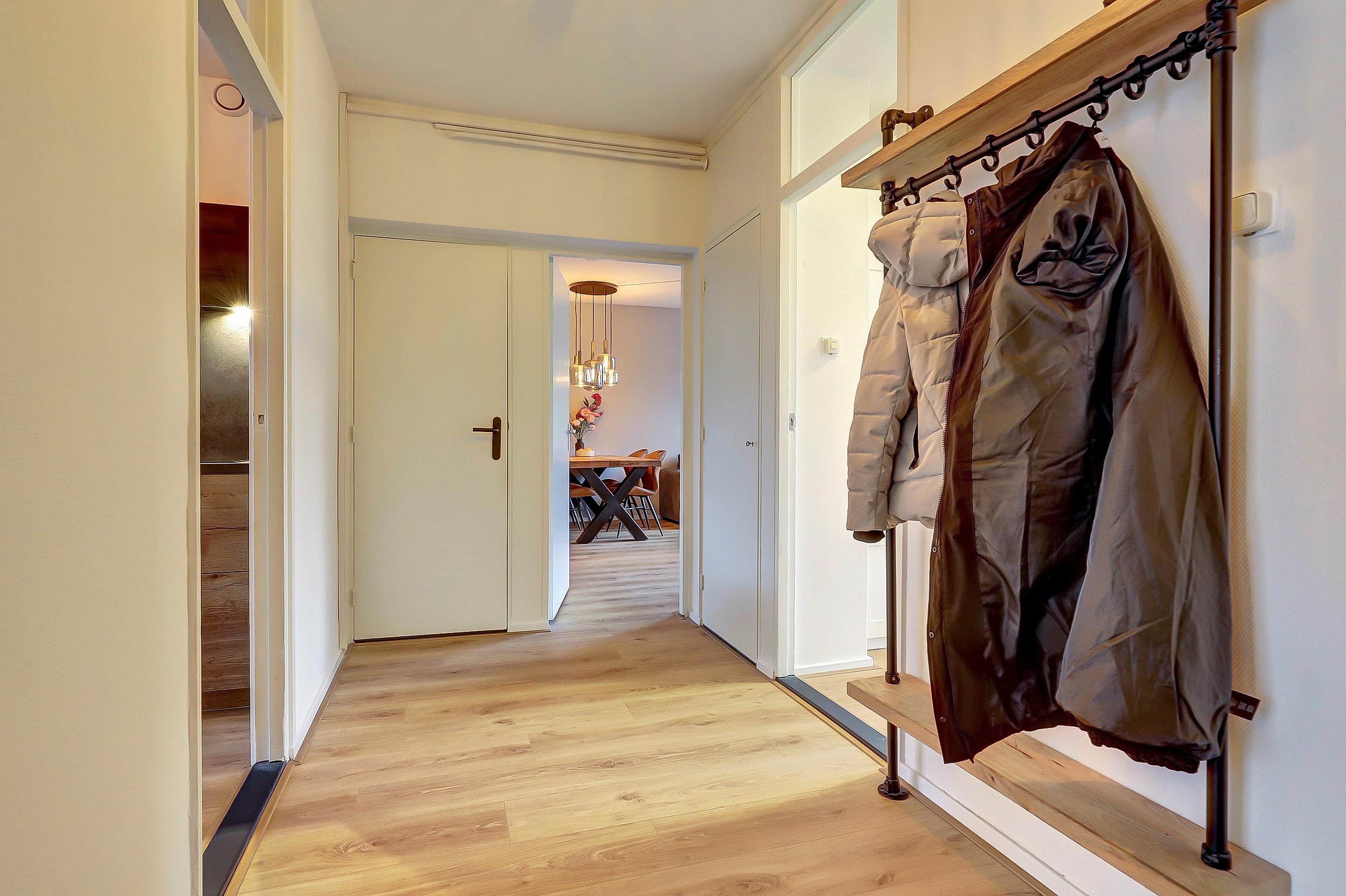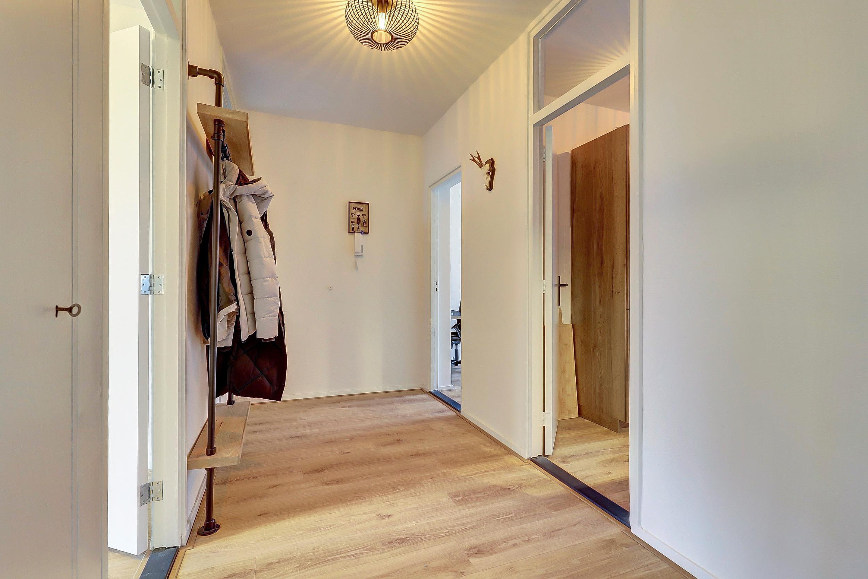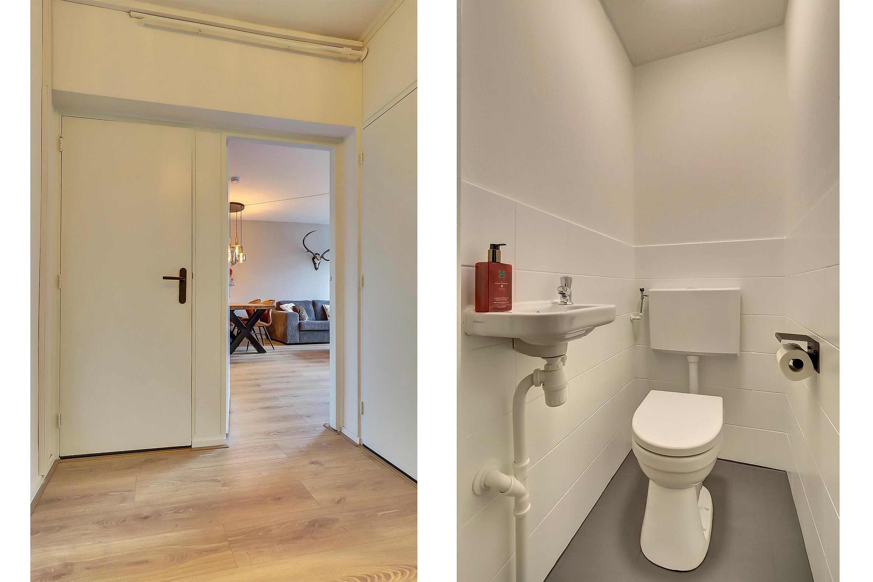 Entree, hal met intercominstallatie, meterkast, toiletruimte met fonteintje en toegang tot vrijwel alle vertrekken (met uitzondering van de grote slaapkamer, die via de woonkamer bereikbaar is).