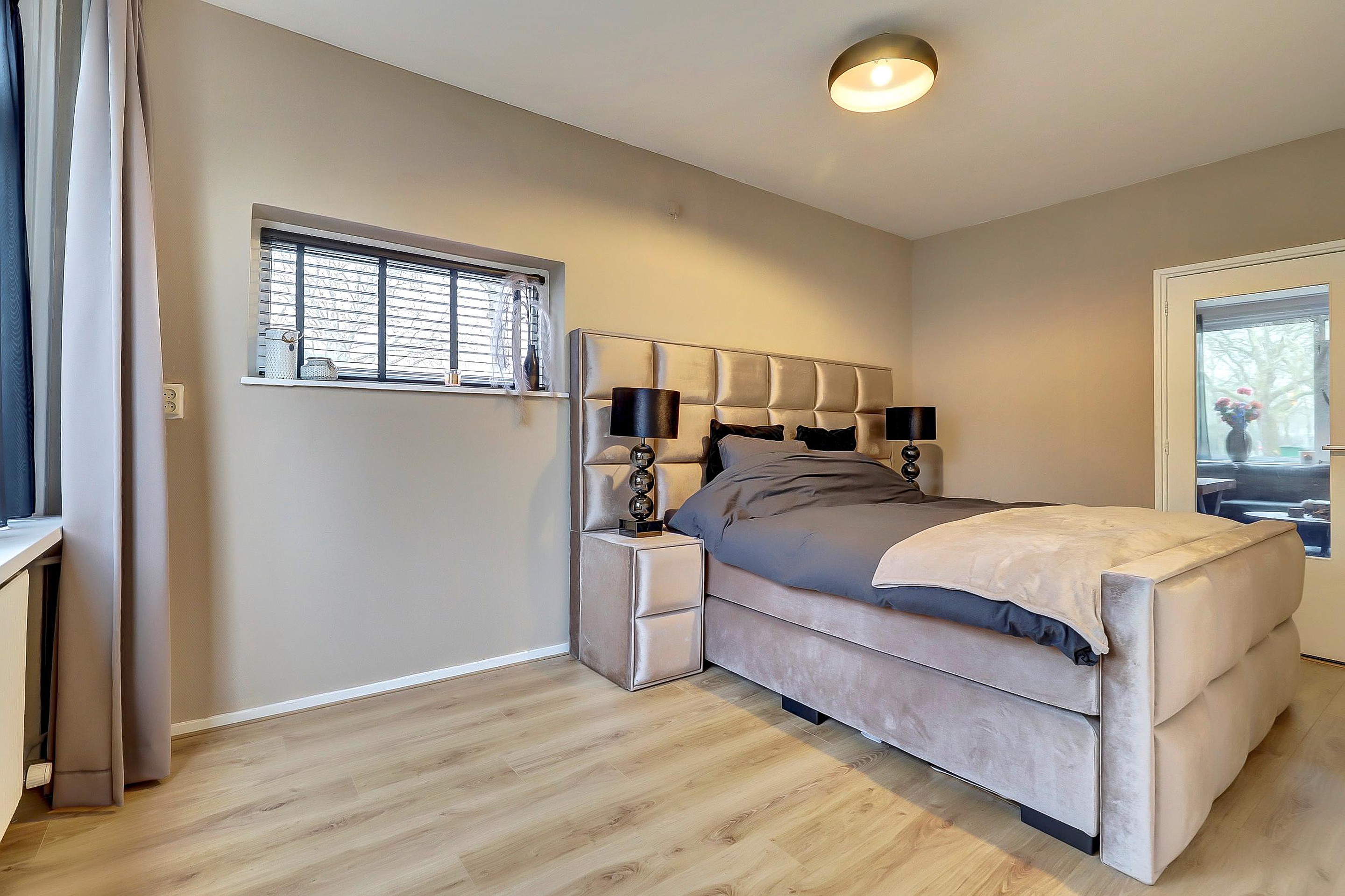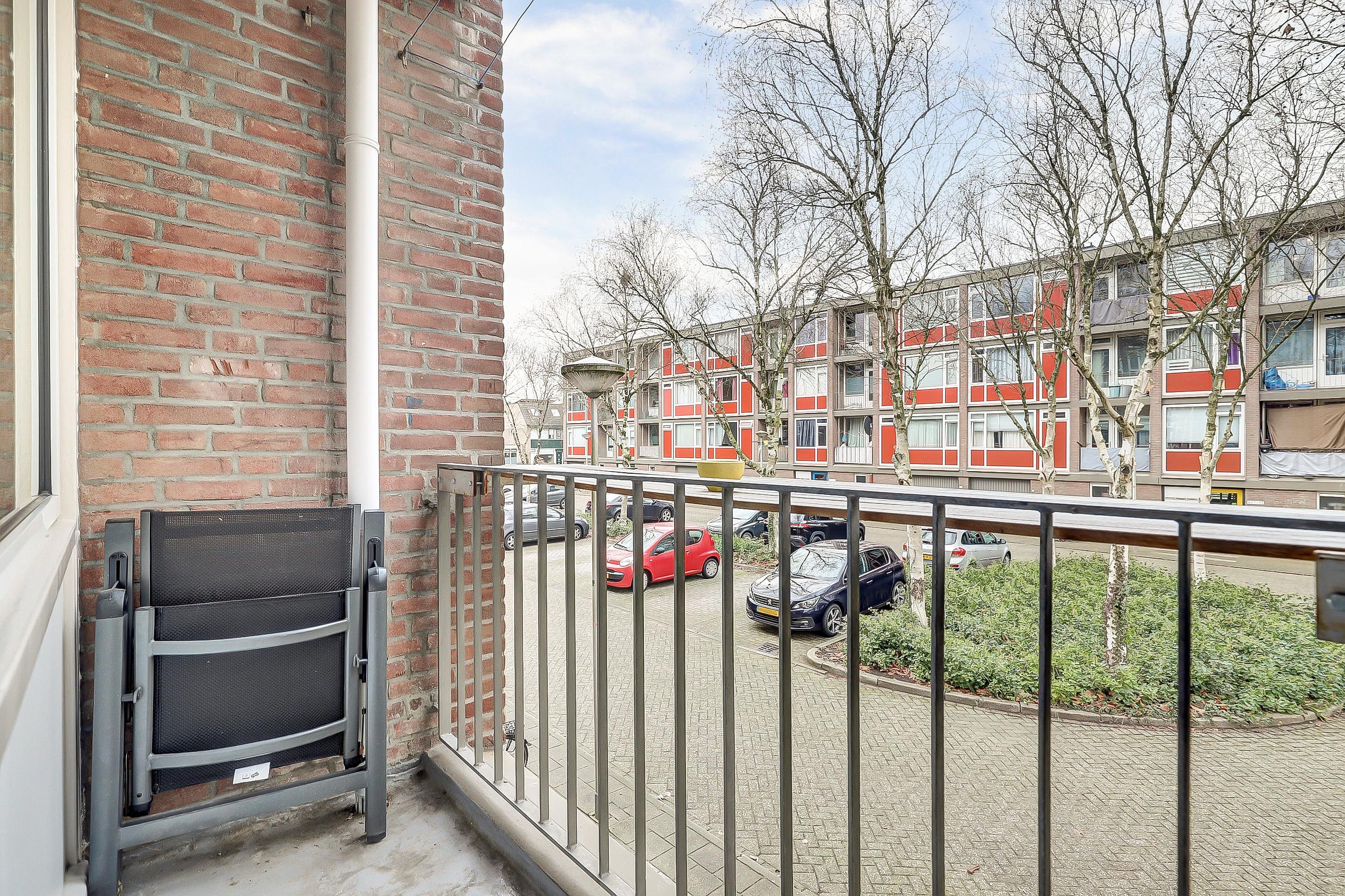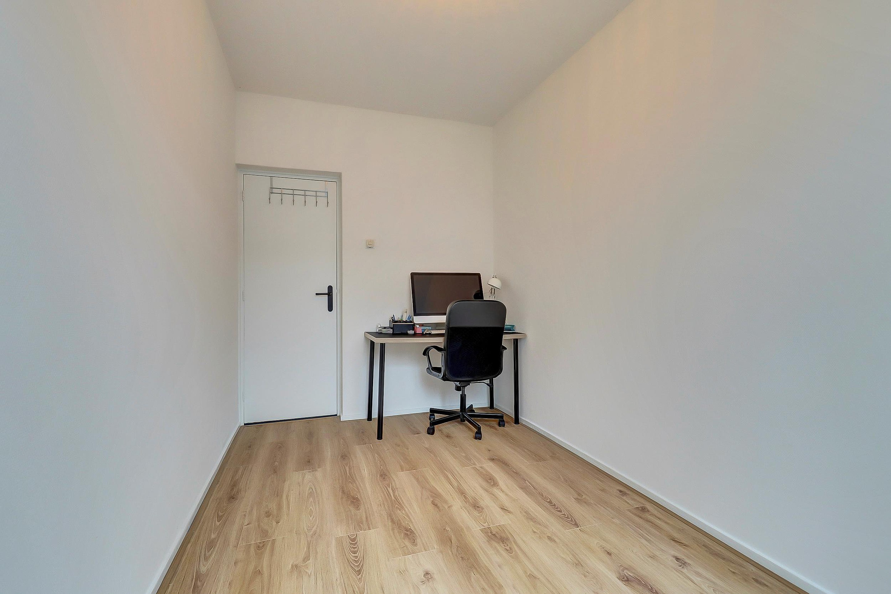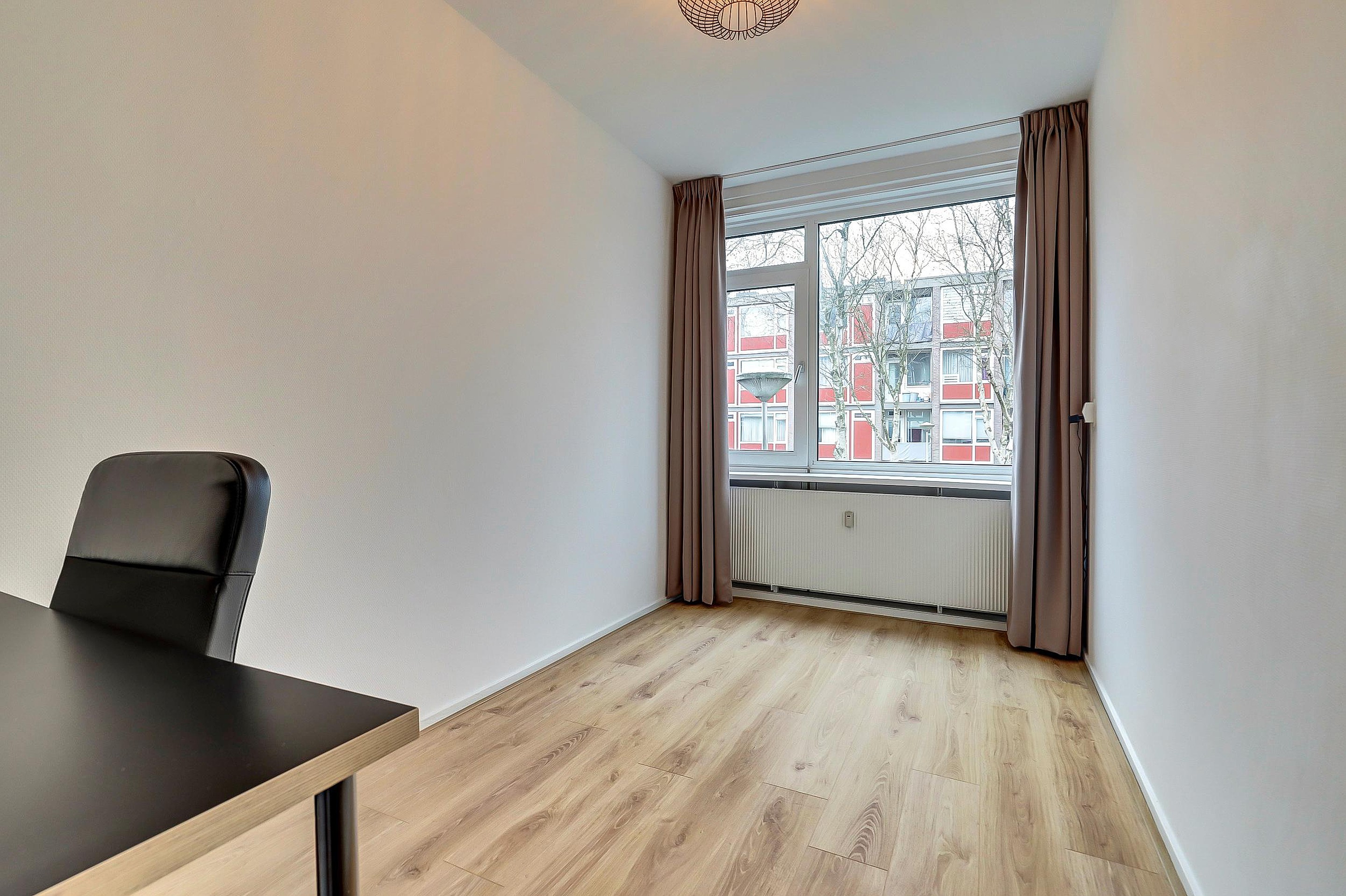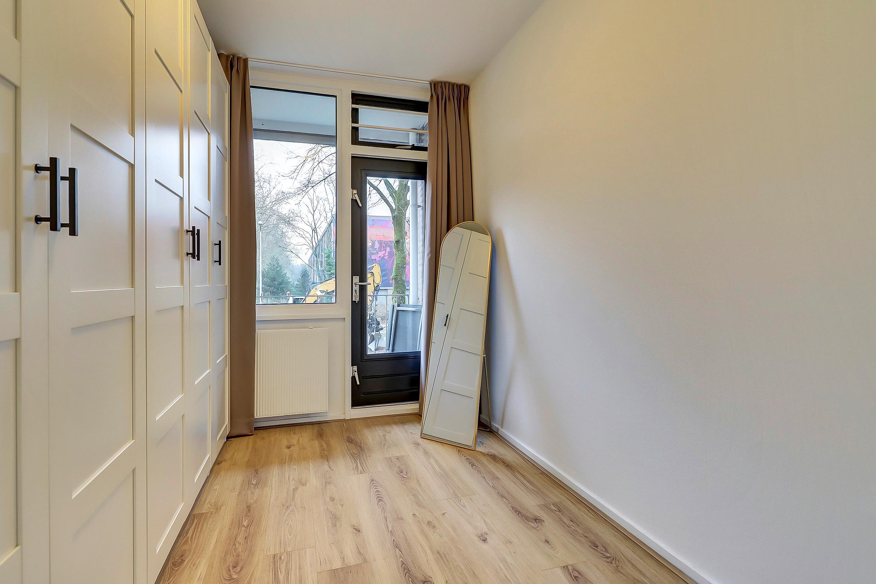 De woonkamer is voorzien van kunststof kozijnen en een deur naar het balkon op het oosten – een fijne plek voor een kop koffie in de ochtendzon. Vanuit de woonkamer bereikt u de grote slaapkamer van ca. 2,74 x 4,91 m, eveneens met kunststof kozijnen en een vaste kast met daarin de CV-ketel.