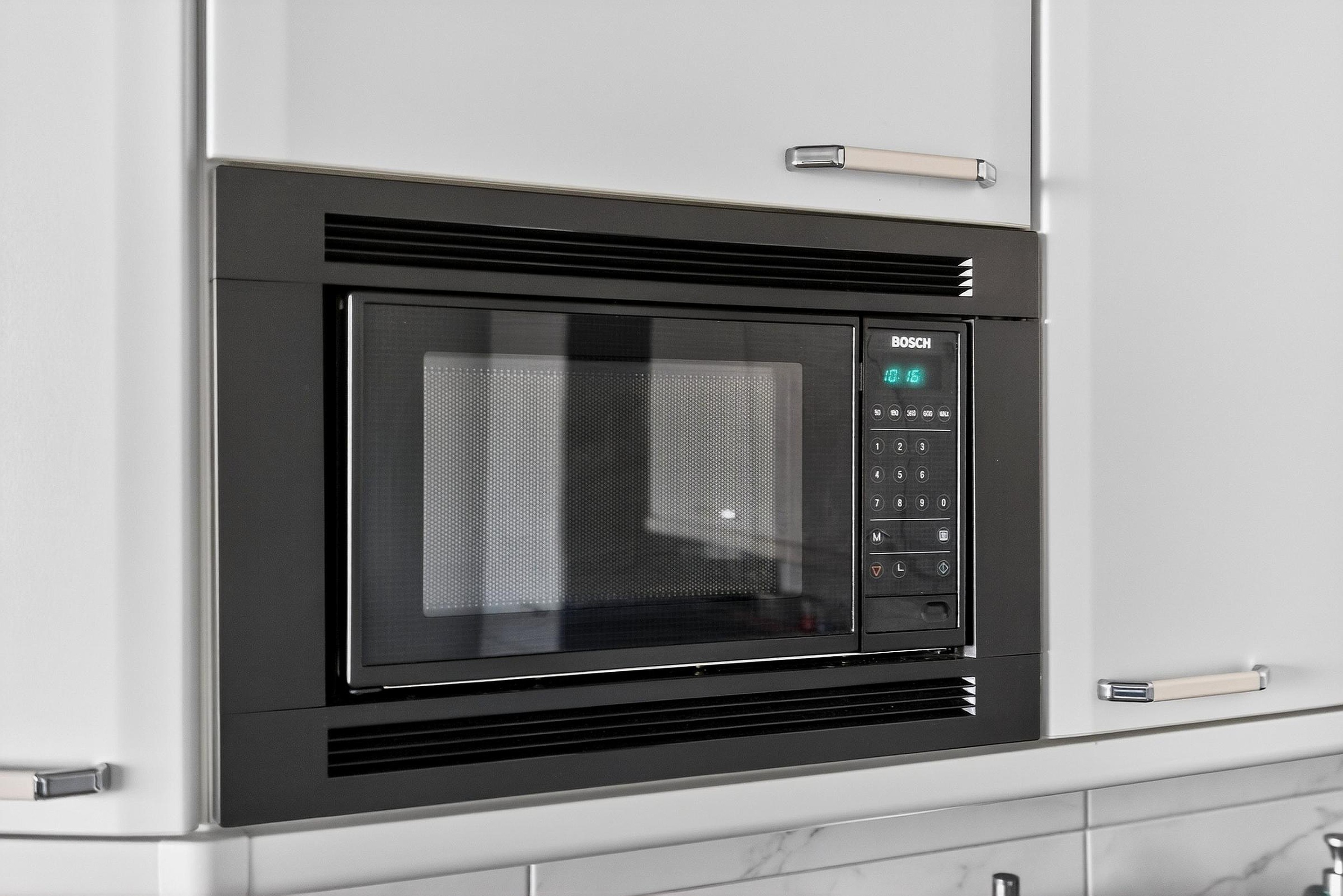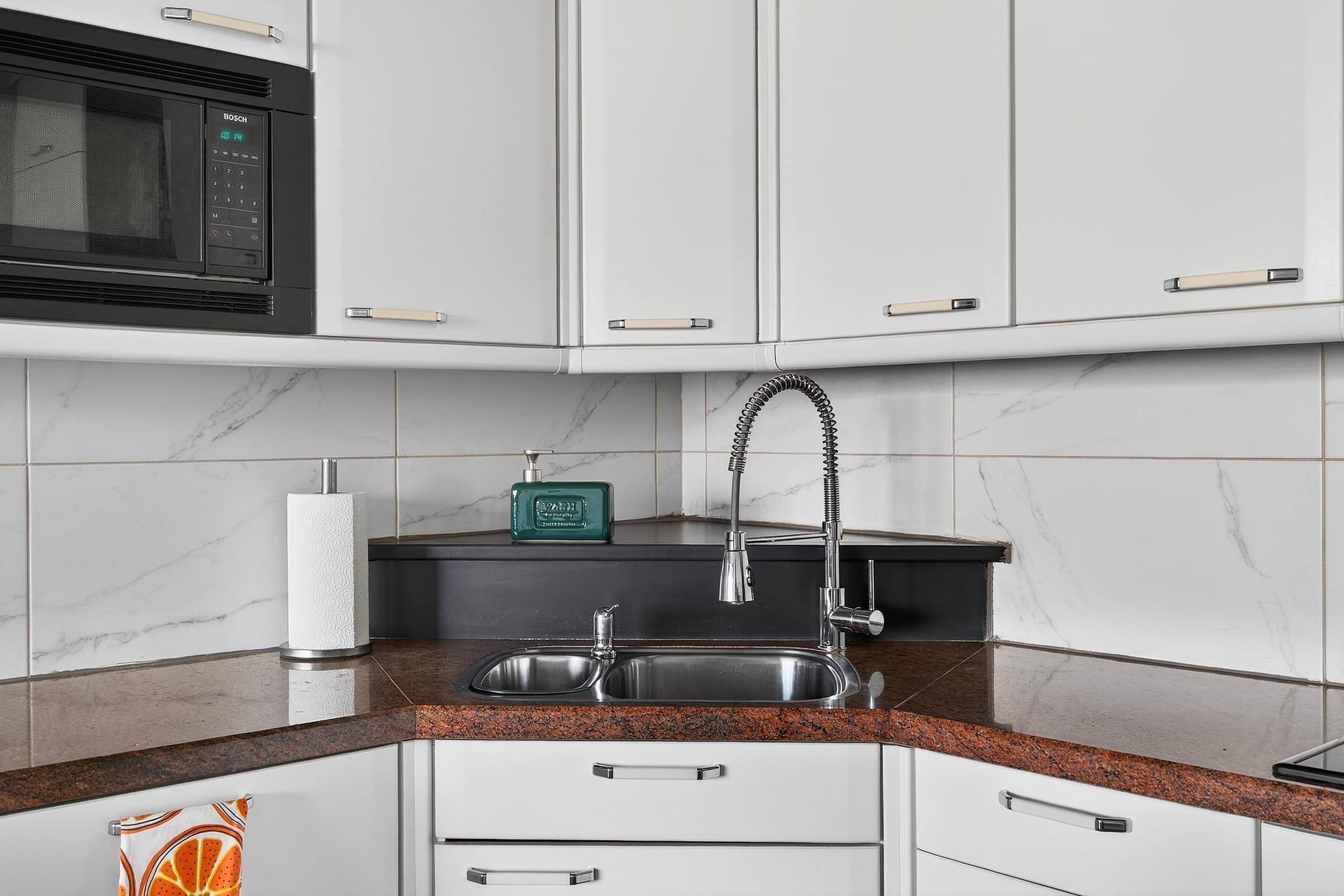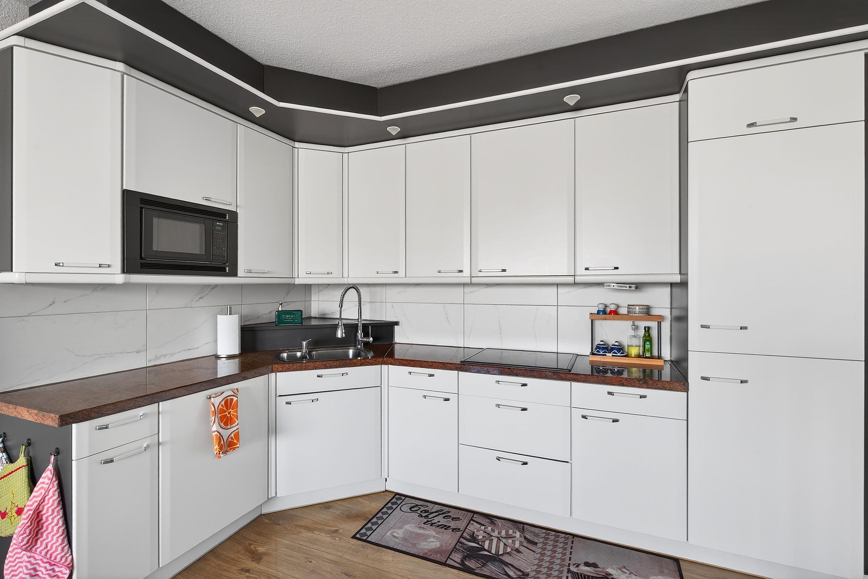 De keukeninrichting bestaat uit een hoek-opgestelde keuken met een composiet werkblad, voldoende boven- en onderkasten, lades en alle noodzakelijke inbouwapparatuur.