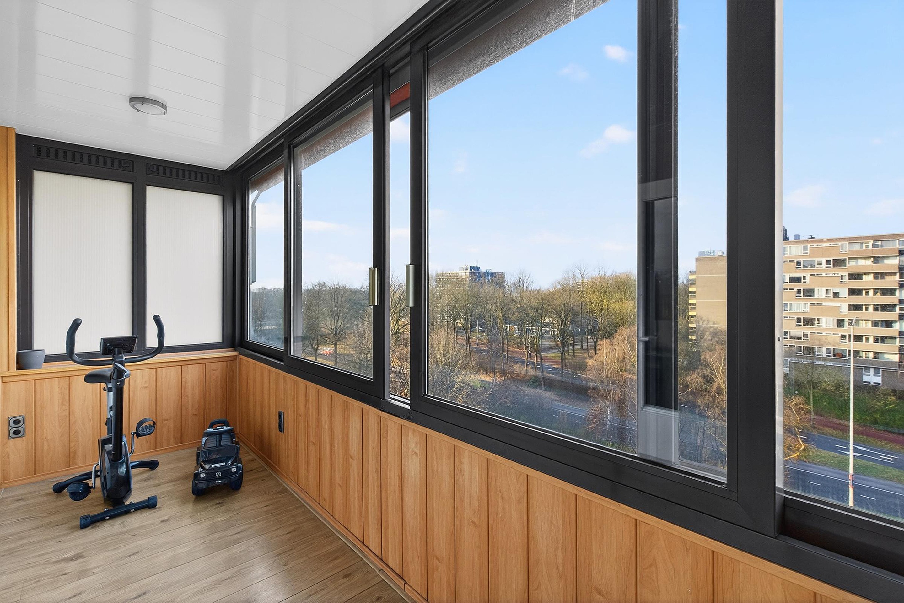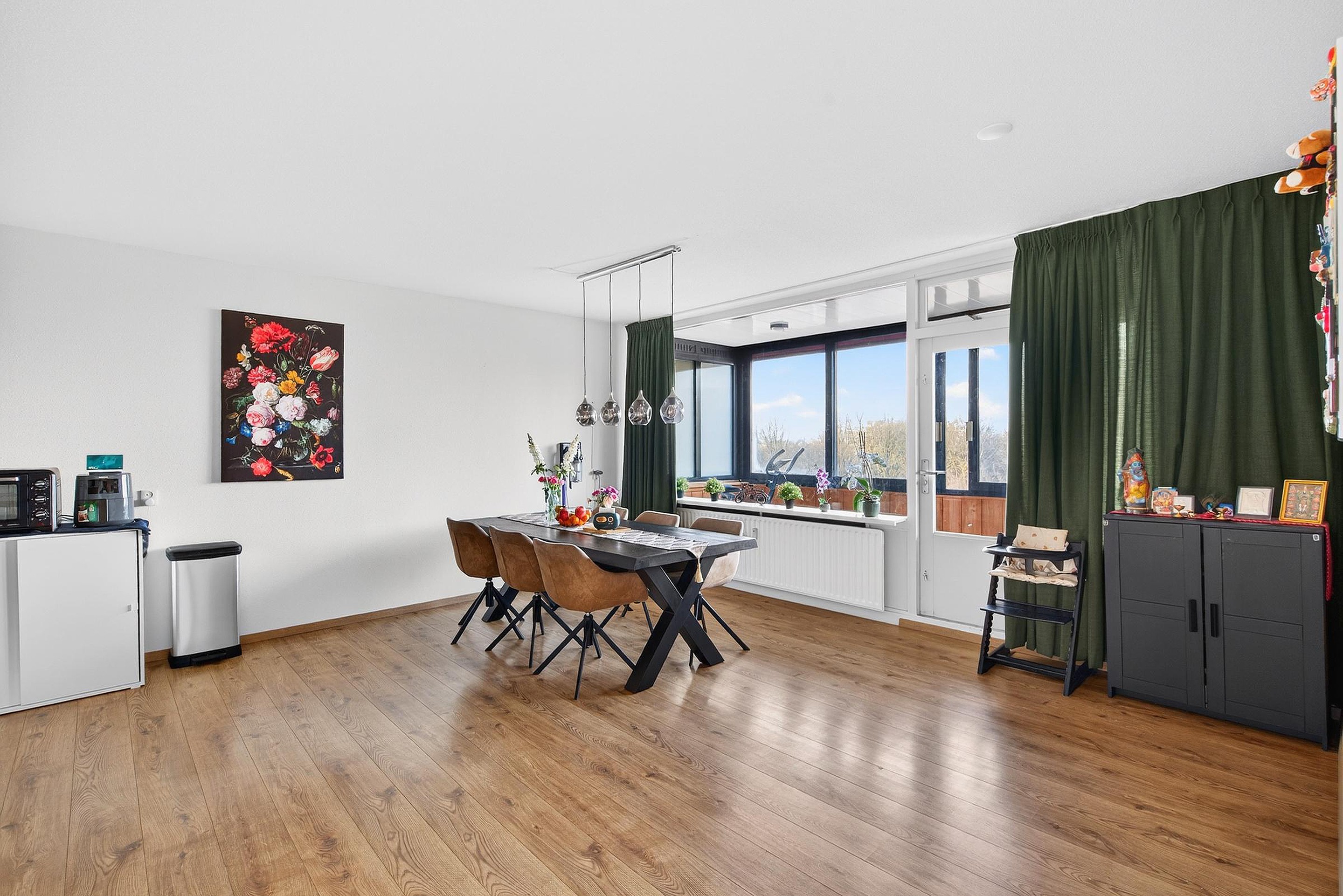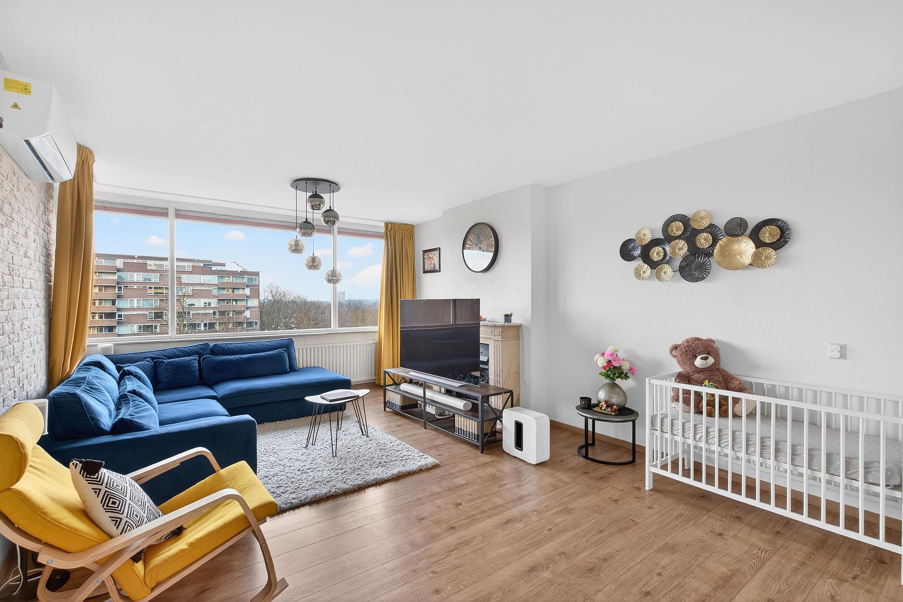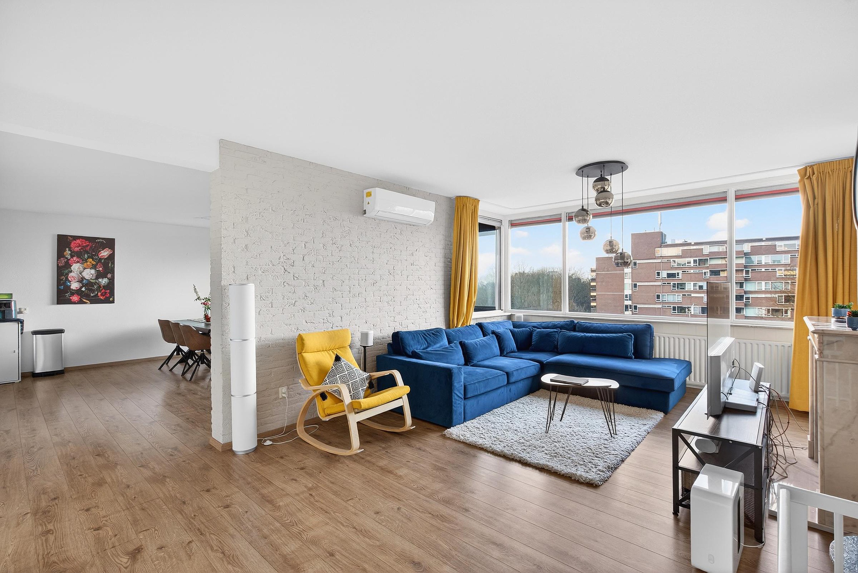 De woonkamer is ruim en beschikt over grote raampartijen, die zorgdragen voor een fraaie lichtinval en een fraai en vrij uitzicht. De woonkamer beschikt tevens een airco-unit hetgeen met name in de zomer prettig is omdat het appartement op het zuidwesten georiënteerd is. De airco kan ook verwarmen.