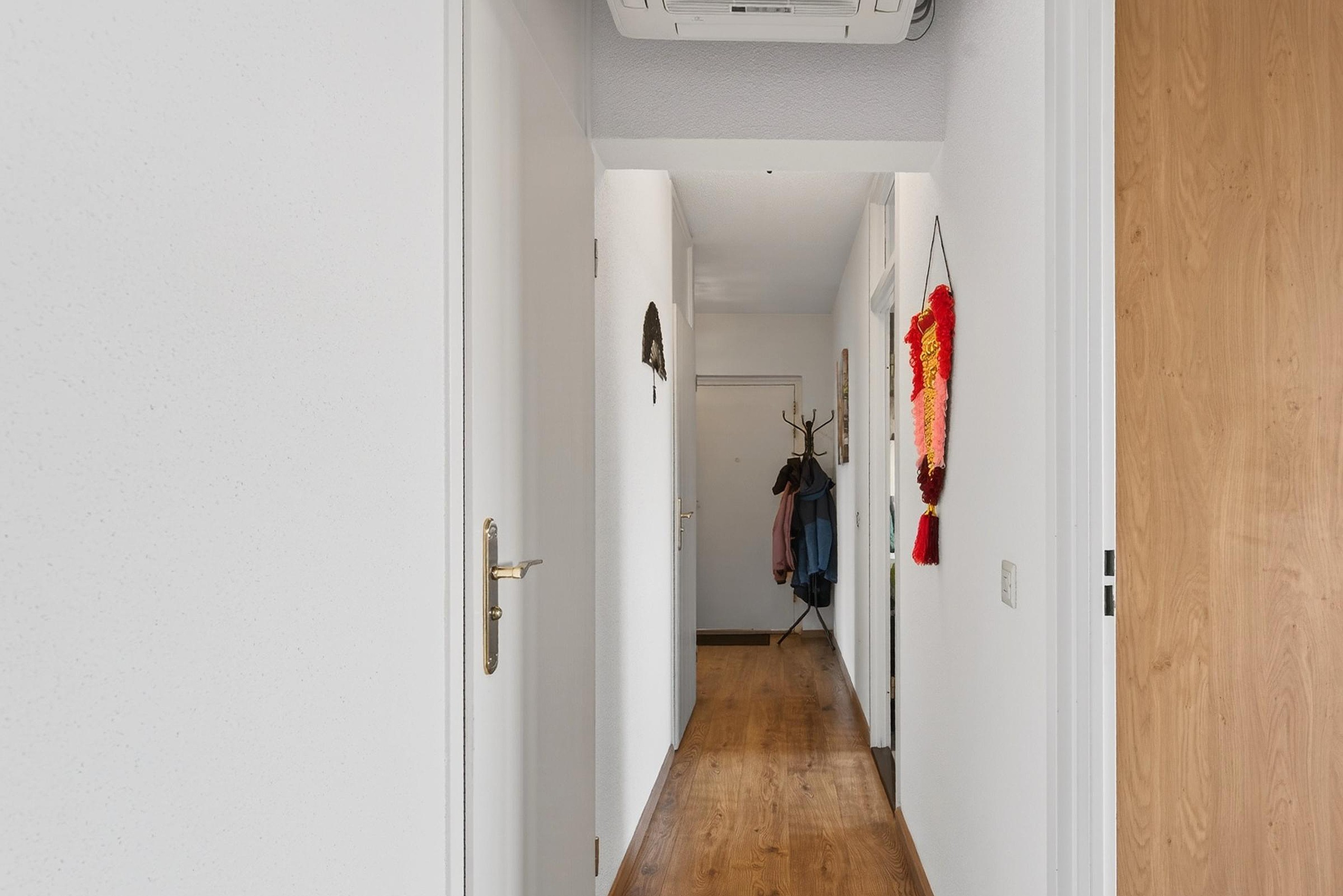 De toegangsdeur leidt tot de ruime, uitnodigende ontvangsthal, met aan de linker zijde een gang naar de slaapvertrekken, de badkamer en een separaat toilet. En aan de rechterzijde de toegang tot de woonkamer, overgaand in de wooneetkeuken met toegang tot een ruime loggia met schuiframen.