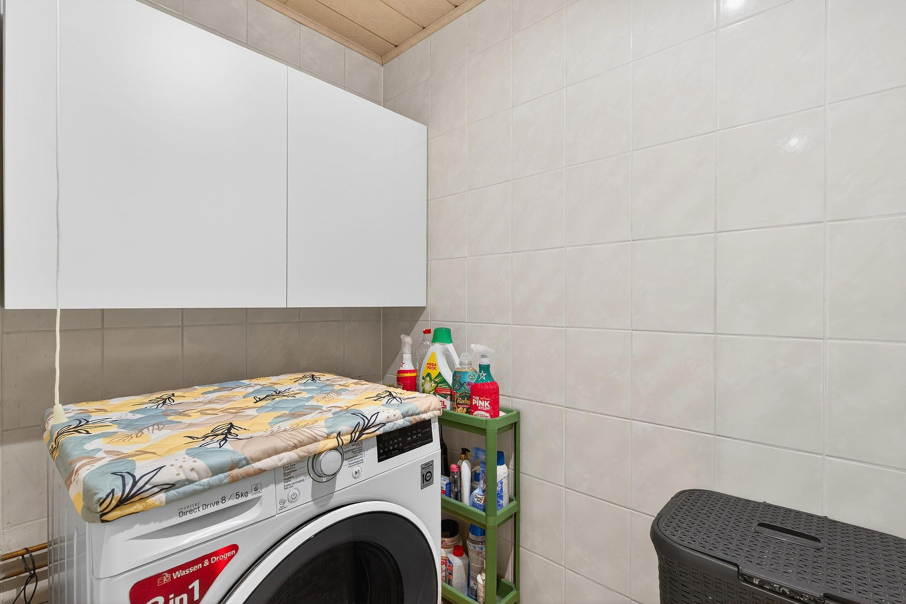 De badkamer is geheel betegeld en beschikt over een ligbad met douchescherm en douchegarnituur. Vanuit de badkamer is de geheel betegelde wasruimte bereikbaar met opstelplaatsen voor de was- en droogapparatuur.