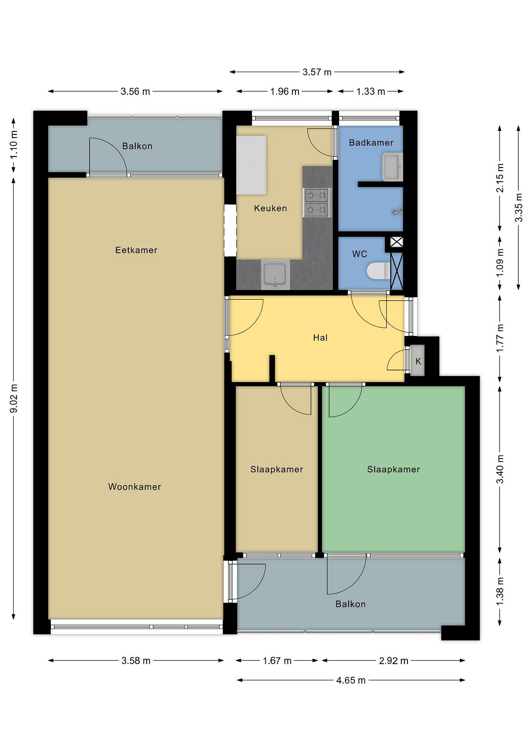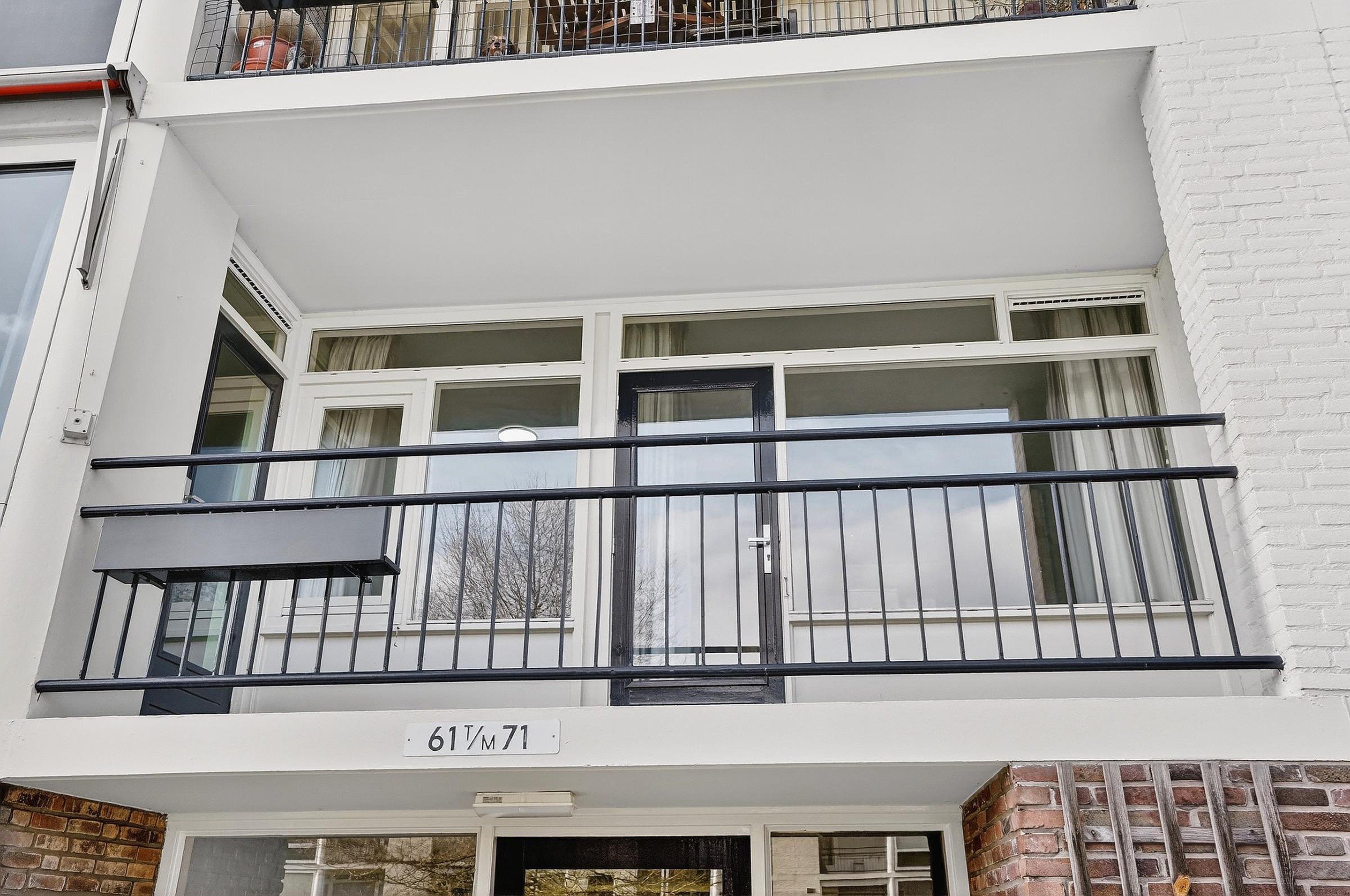 De woning op nummer 61 verwelkomt u en geeft toegang tot de hal/gang die op haar beurt toegang biedt tot een inbouwkast, de twee slaapkamers, een toiletruimte en de royale woonkamer. Vanuit de woonkamer zijn twee balkons, de keuken en via een doorloop de badkamer bereikbaar.