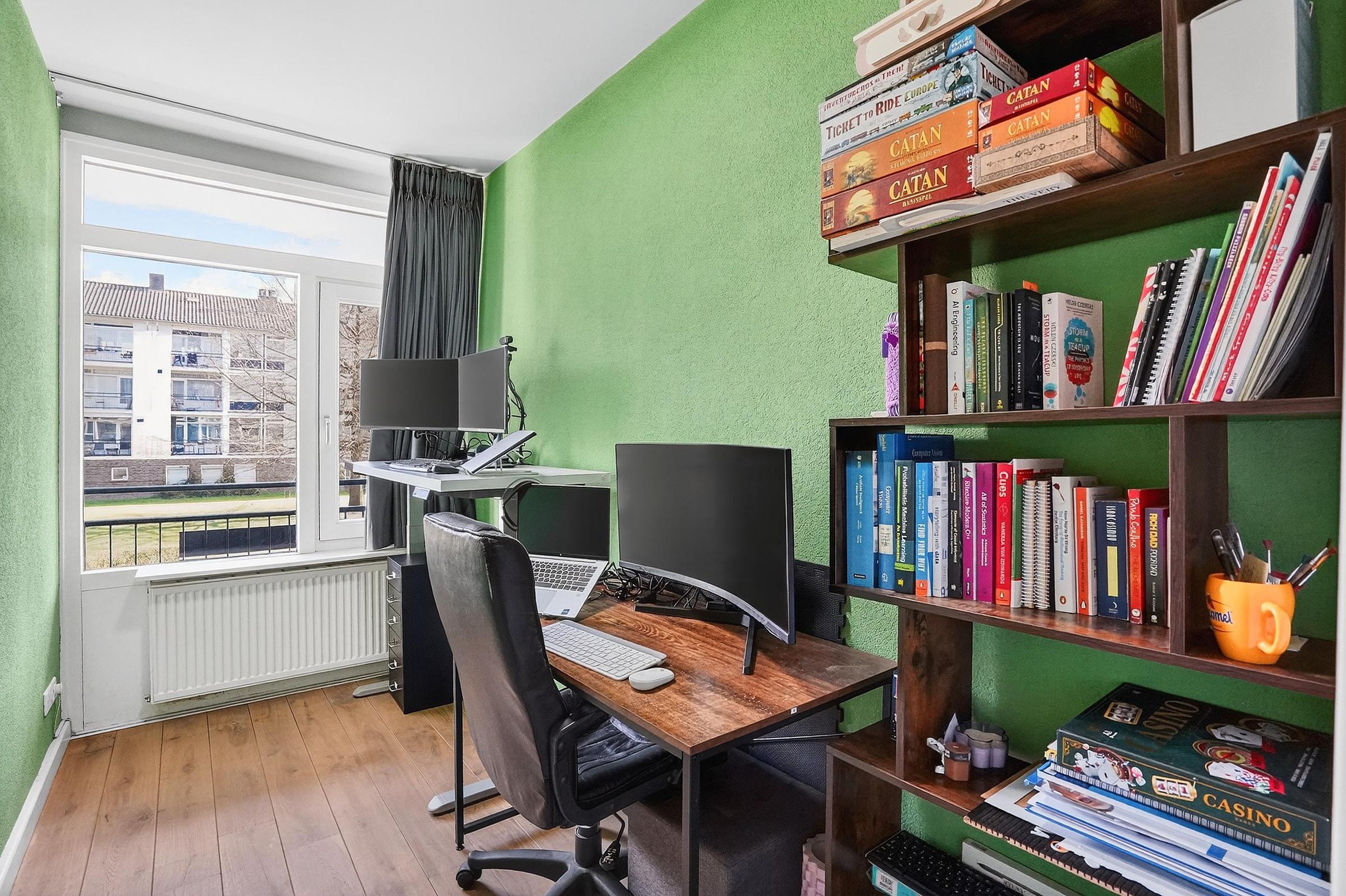De kleine slaapkamer is momenteel in gebruik als werkkamer, maar groot genoeg om een bed te plaatsen.