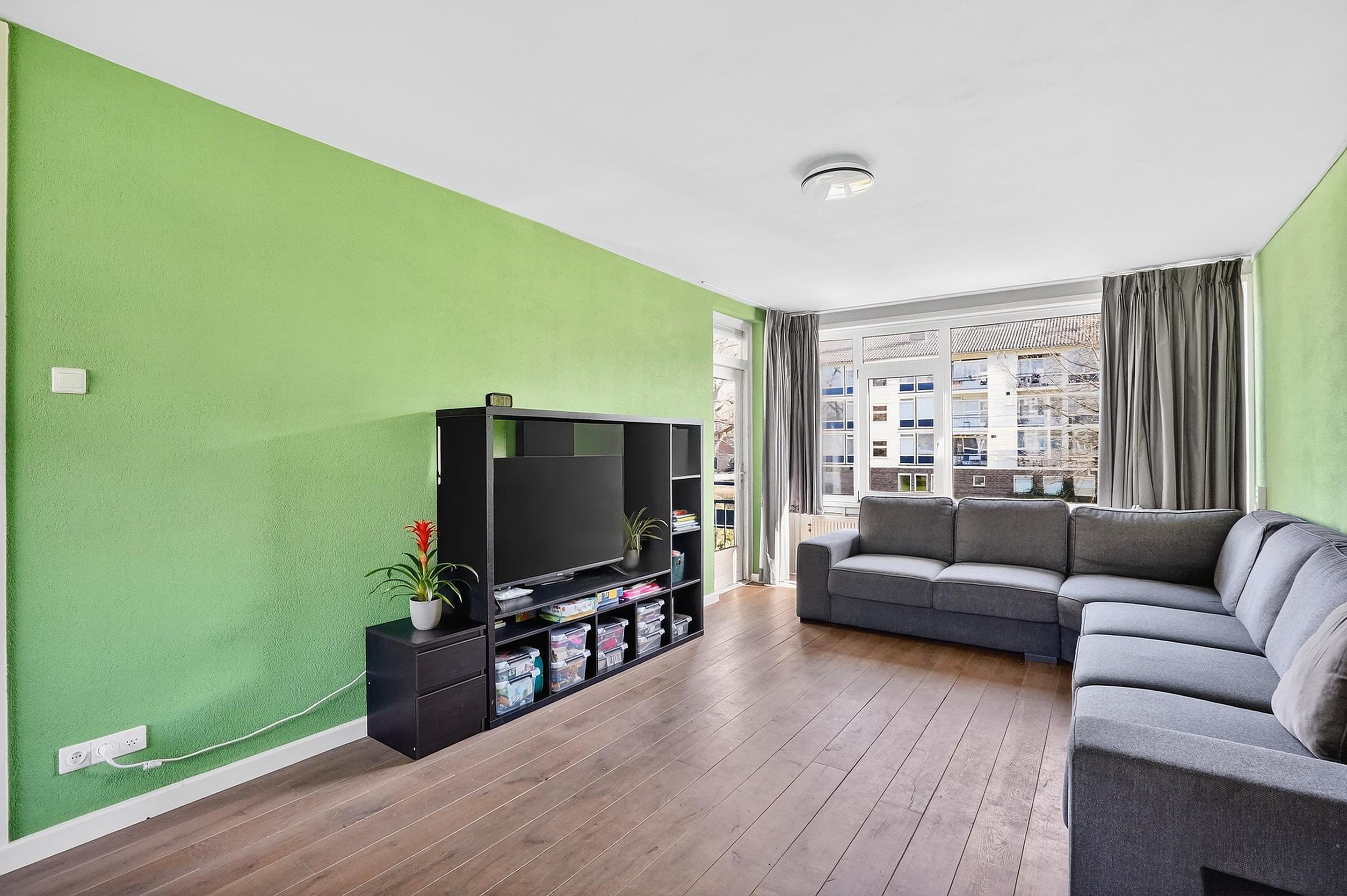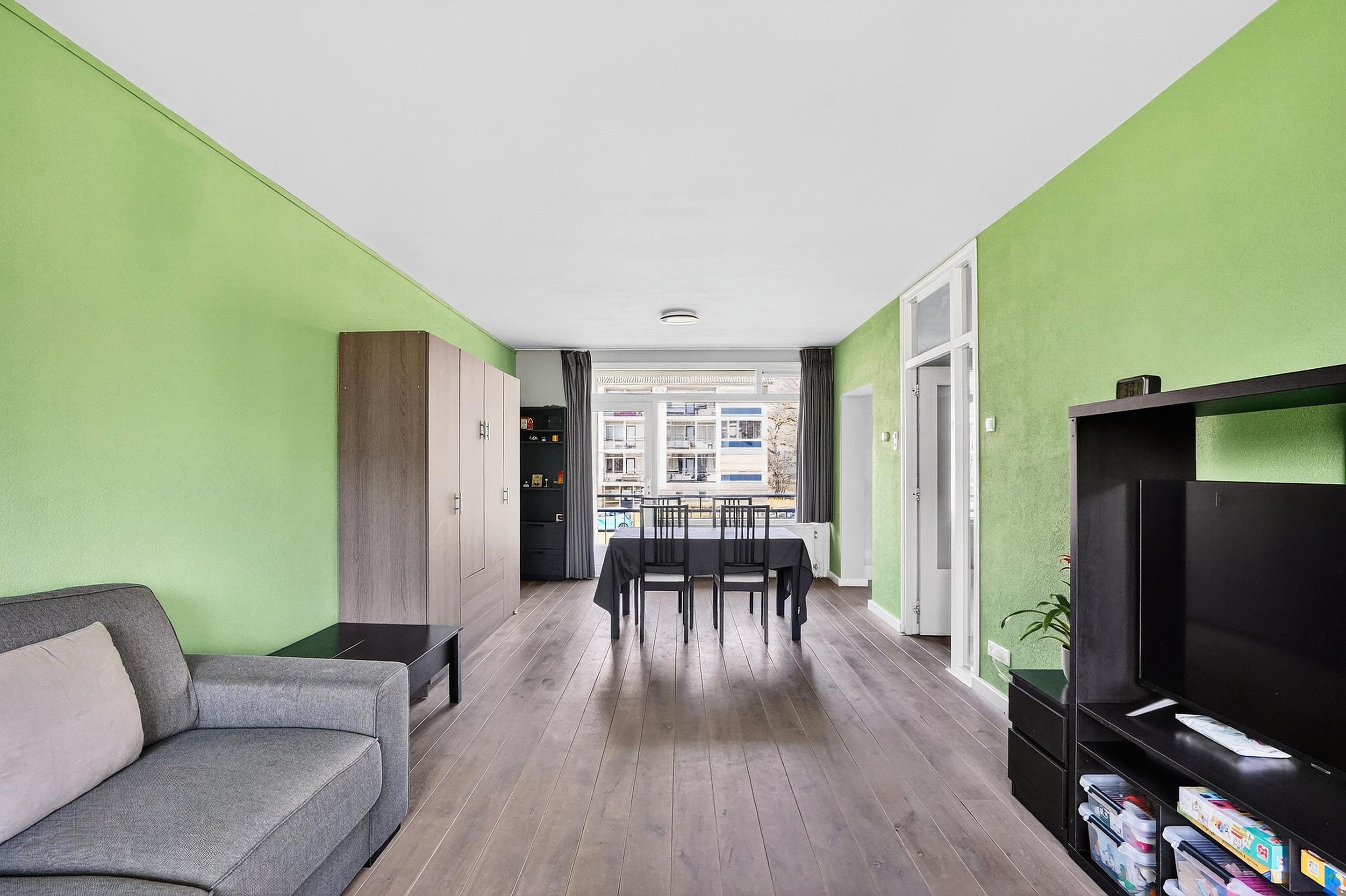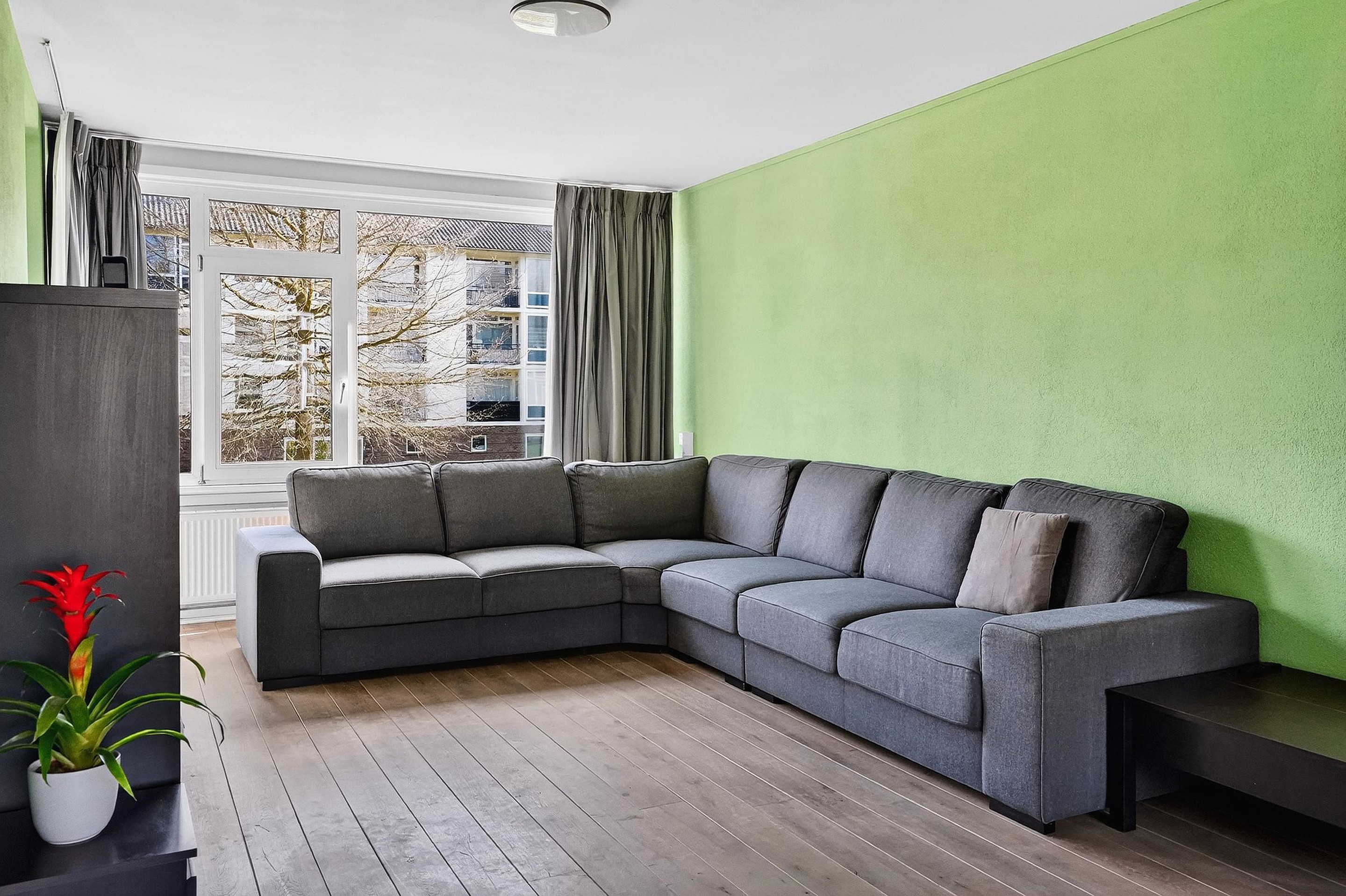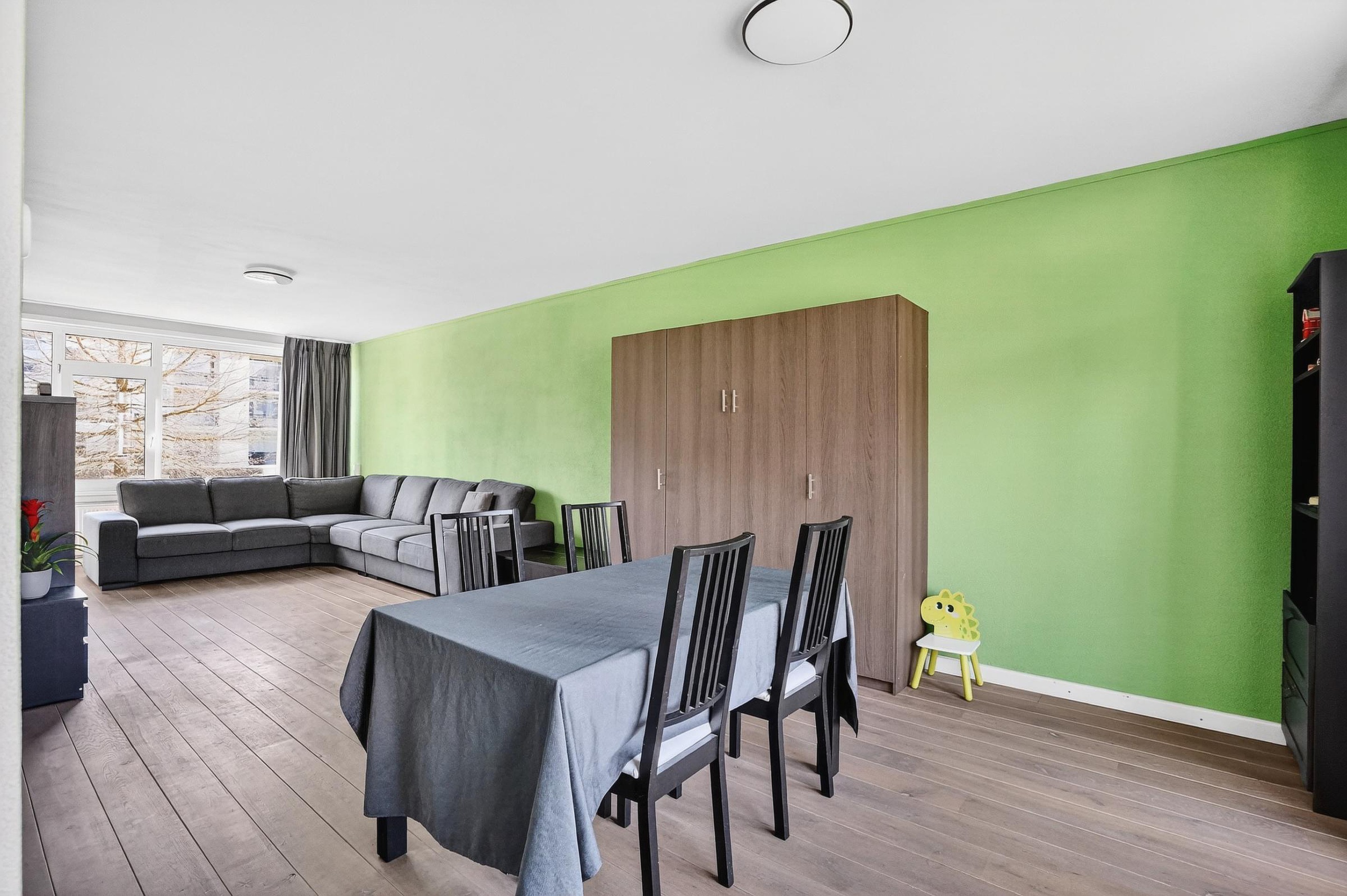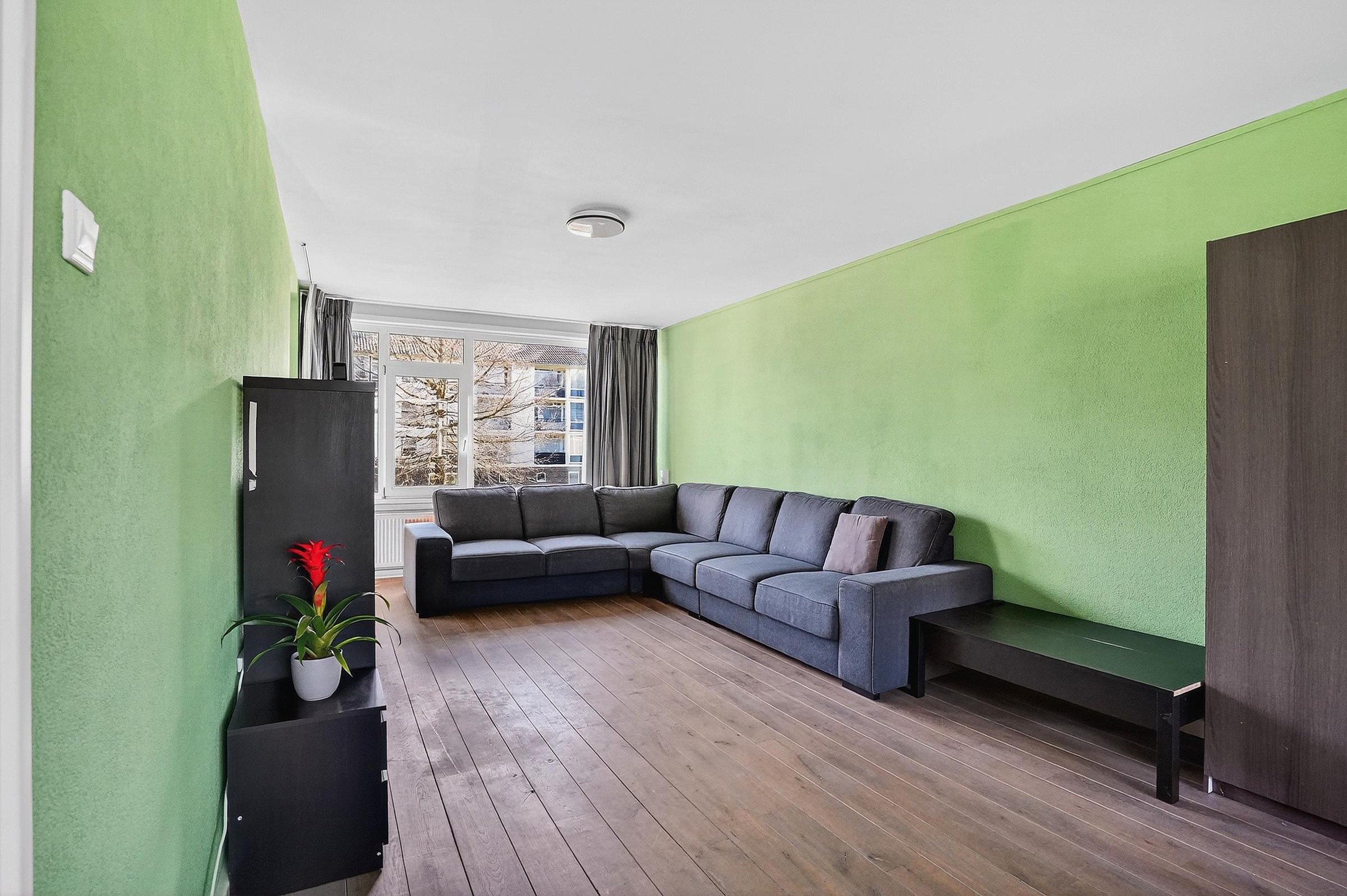 De royale woonkamer is voorzien van een laminaat vloer, stucwerk wanden en dito plafond. Door de grote raampartijen aan weerszijden komt een overvloed aan daglicht binnen. De balkons (noord- en zuid-gericht) zijn beiden toegankelijk vanuit de woonkamer.
