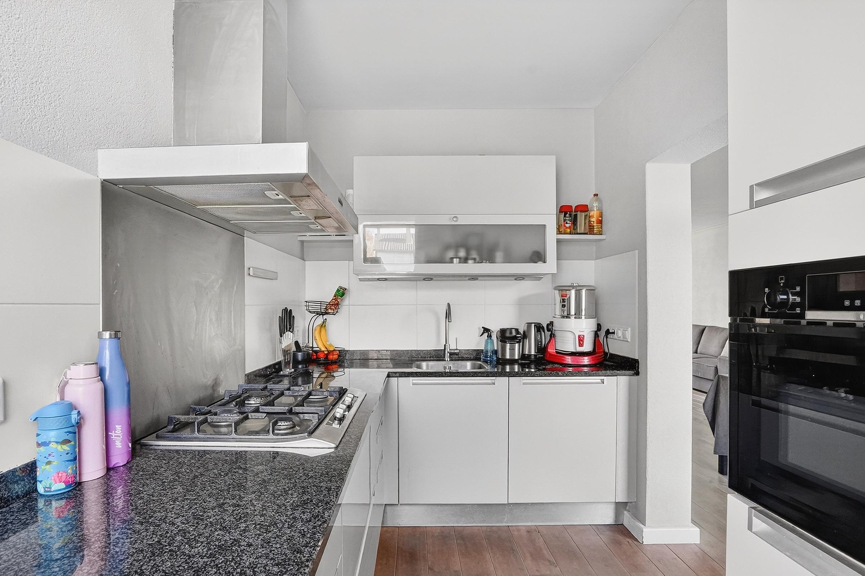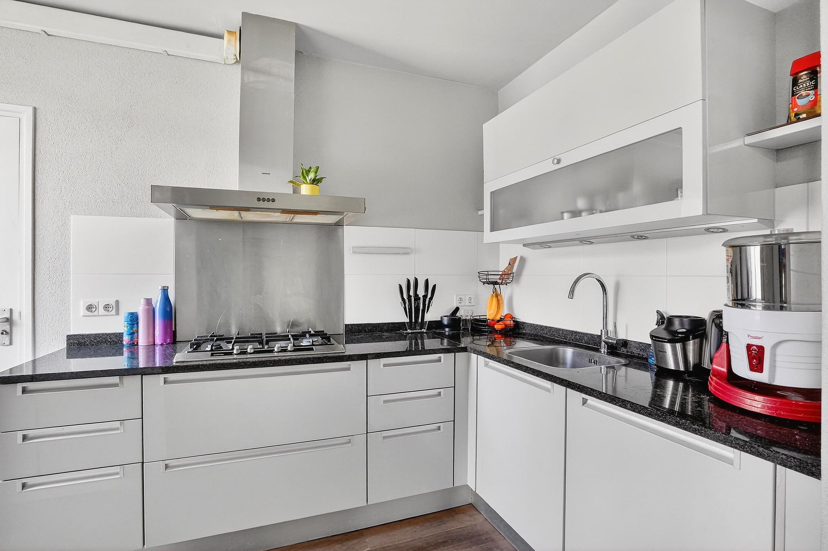 Het betreft een L-opgestelde keuken met granieten blad, voldoende kastruimte, lades, een gaskooktoestel met 4 pitten, een RVS-afzuigschouw en een vaatwasser. Veder is er een rechte keukenopstelling aan de overzijde van de L, met daarin de combioven de koel/vriescombinatie en de nodige kastruimte te vinden.