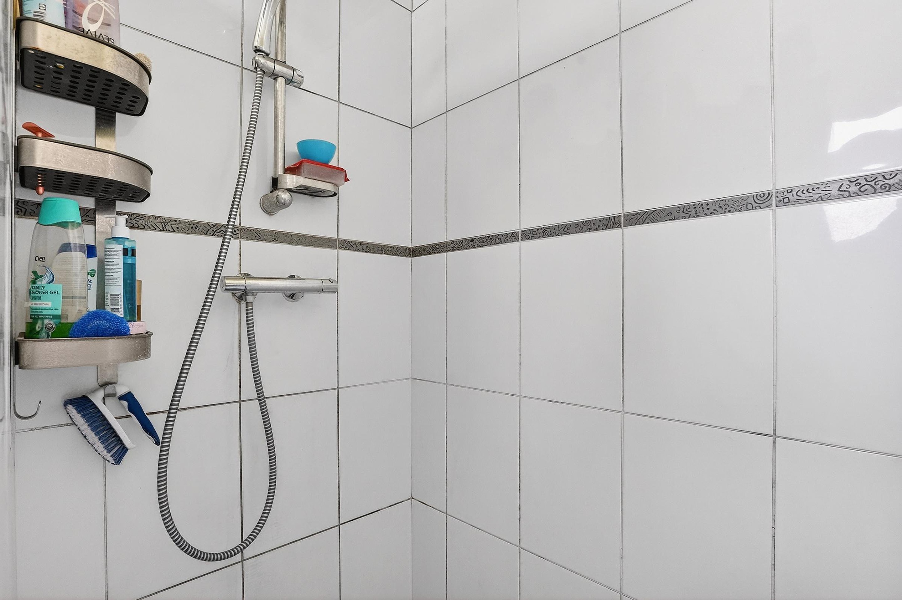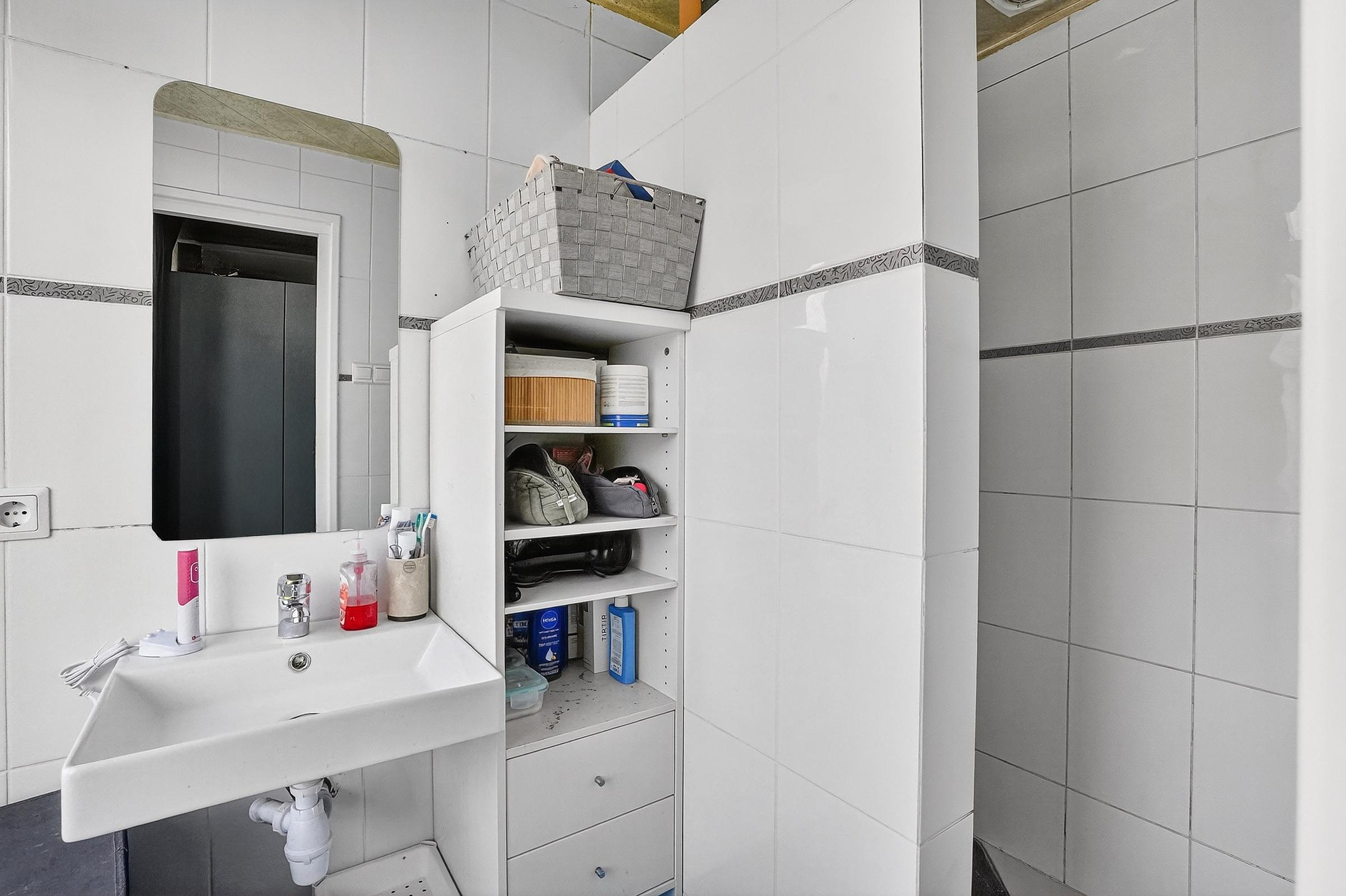 De badkamer is aansluitend aan de keuken bereikbaar. De badkamer is geheel betegeld en bestaat uit een ruime inloopdouche en een vaste wastafel met spiegel.
