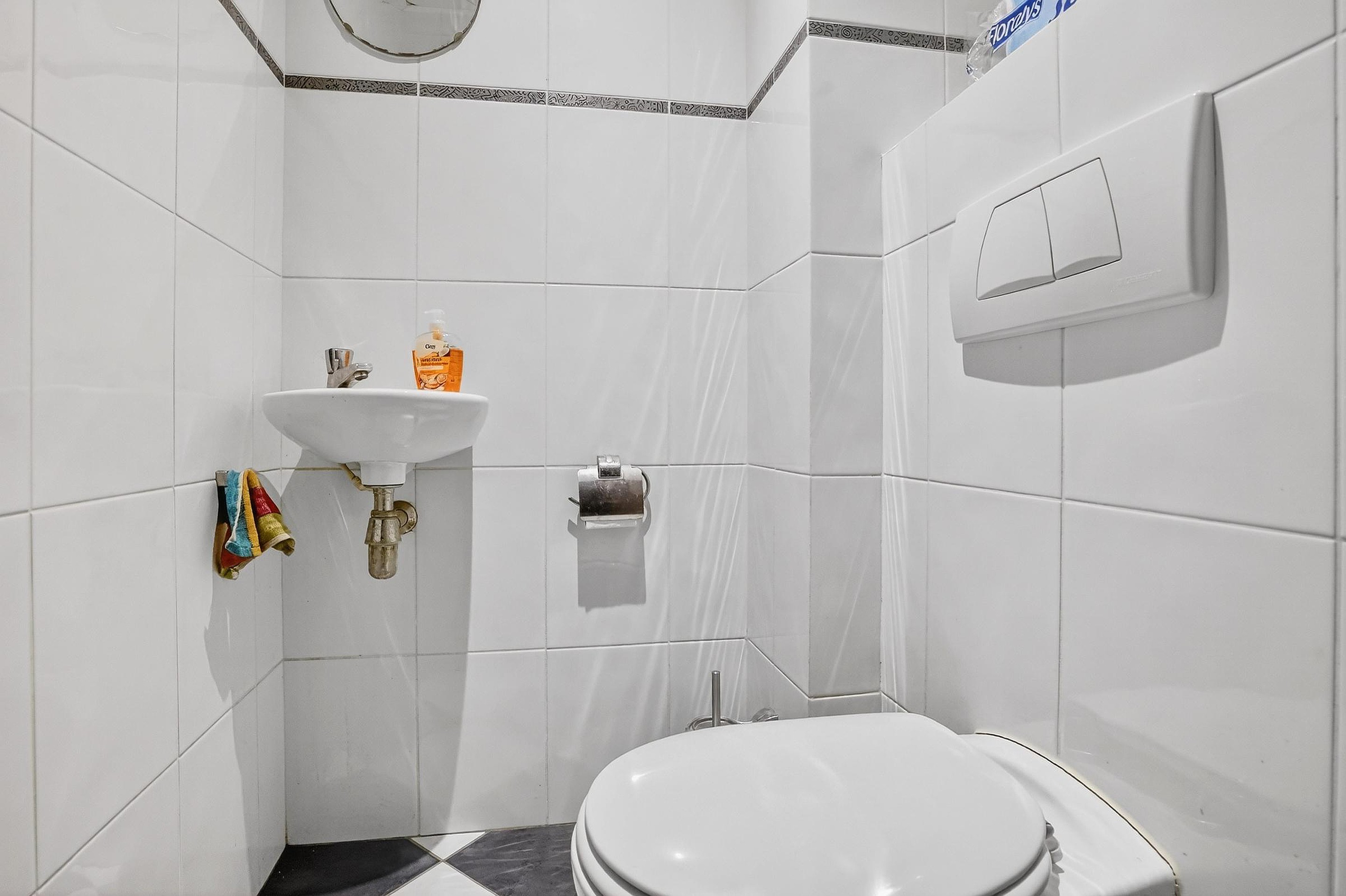 Het toilet is geheel betegeld en beschikt over een wandcloset en een bijpassend fonteintje.