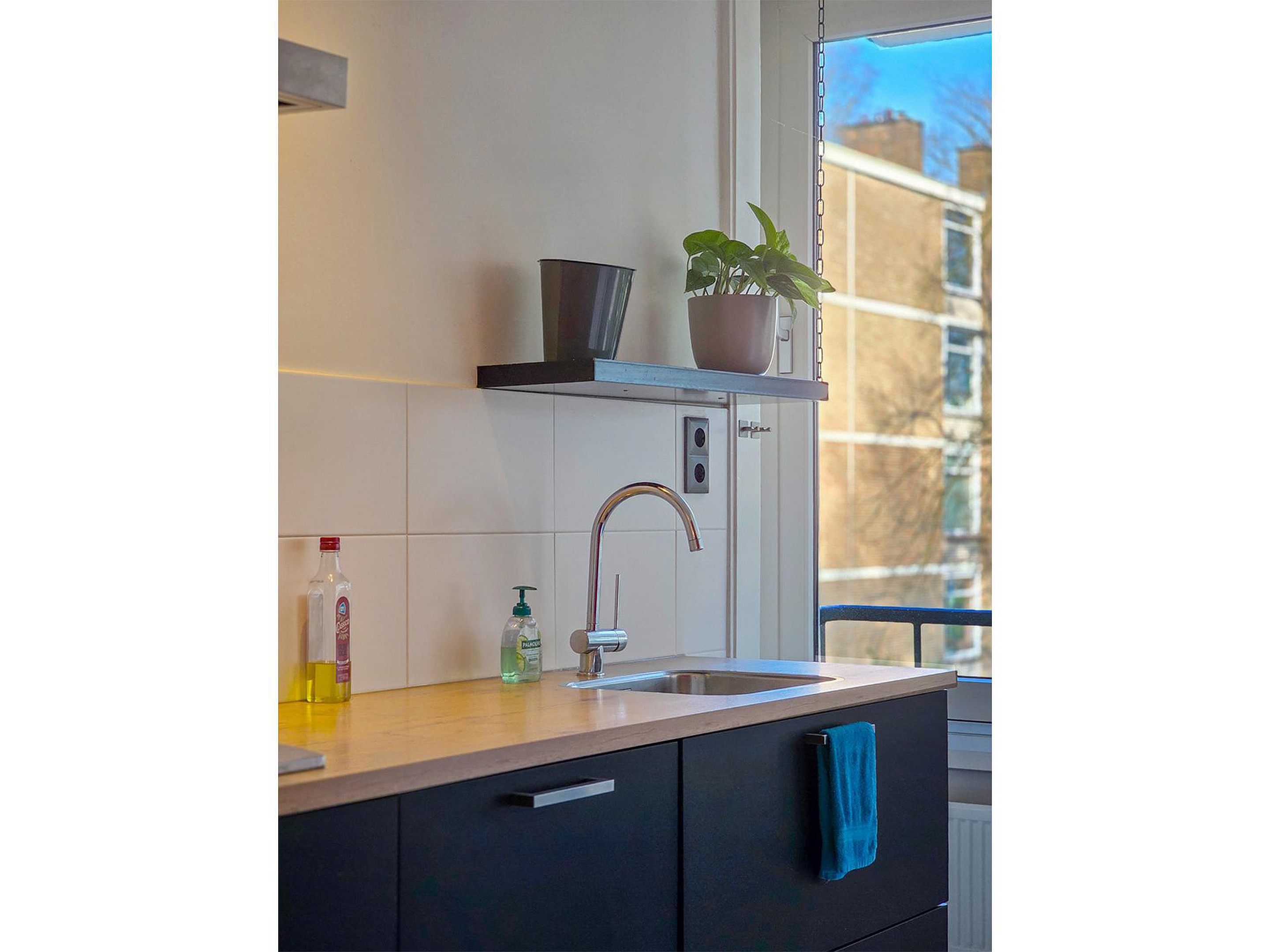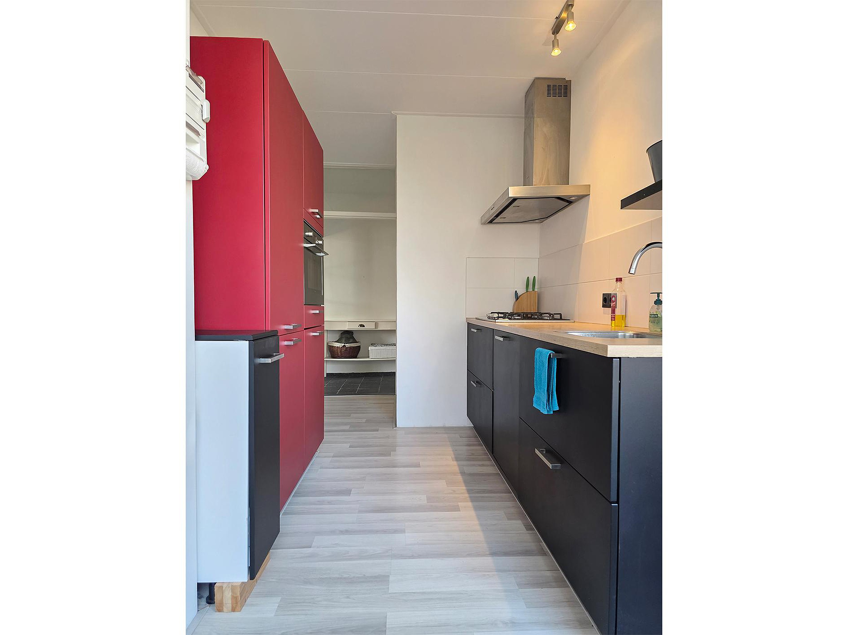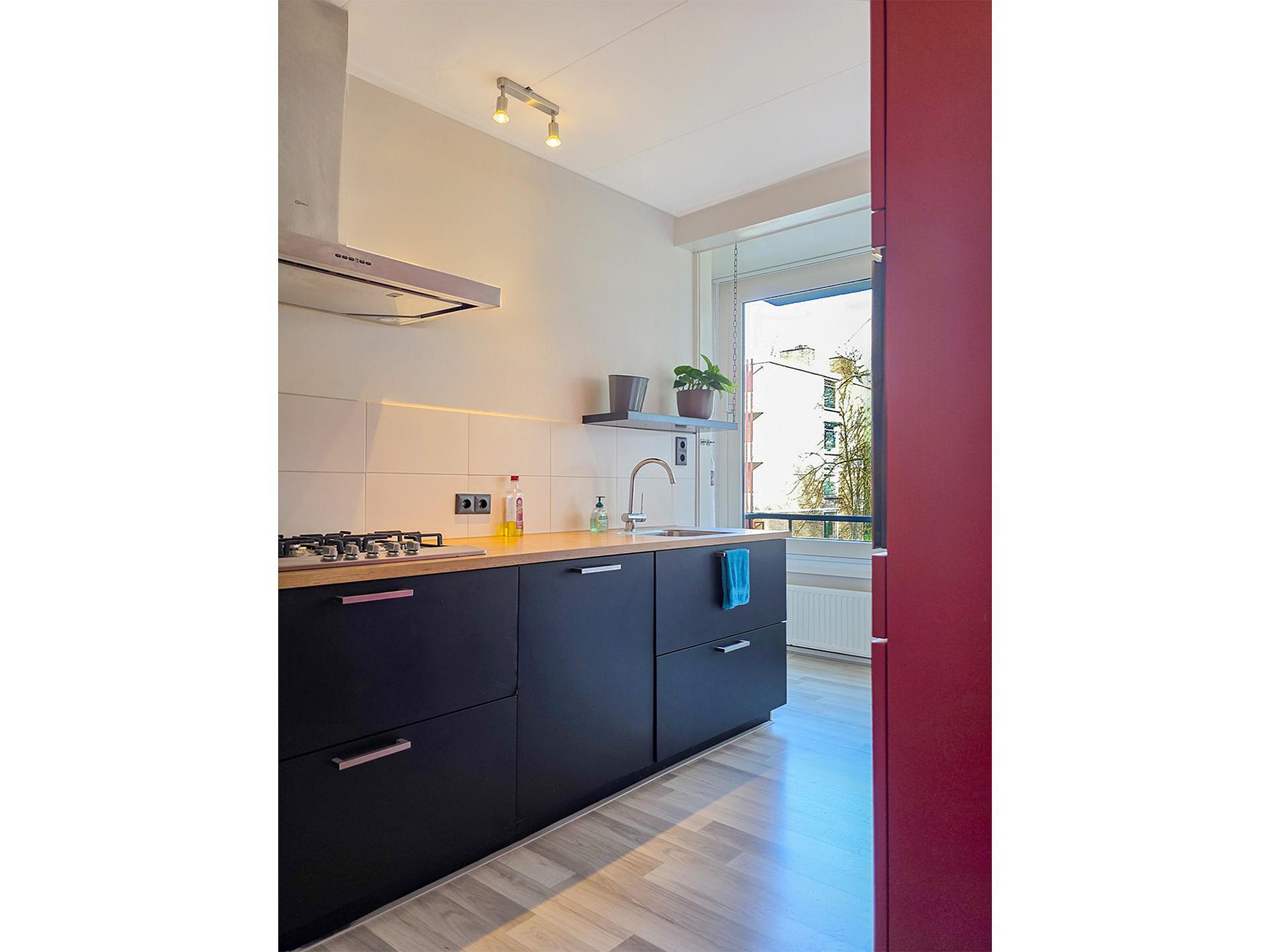 De keuken biedt genoeg kastruimte en is direct verbonden met het balkon. Naast de keuken is een afgesloten ruimte, waarin de Cv installatie, de wasmachine-aansluiting en opbergruimte.