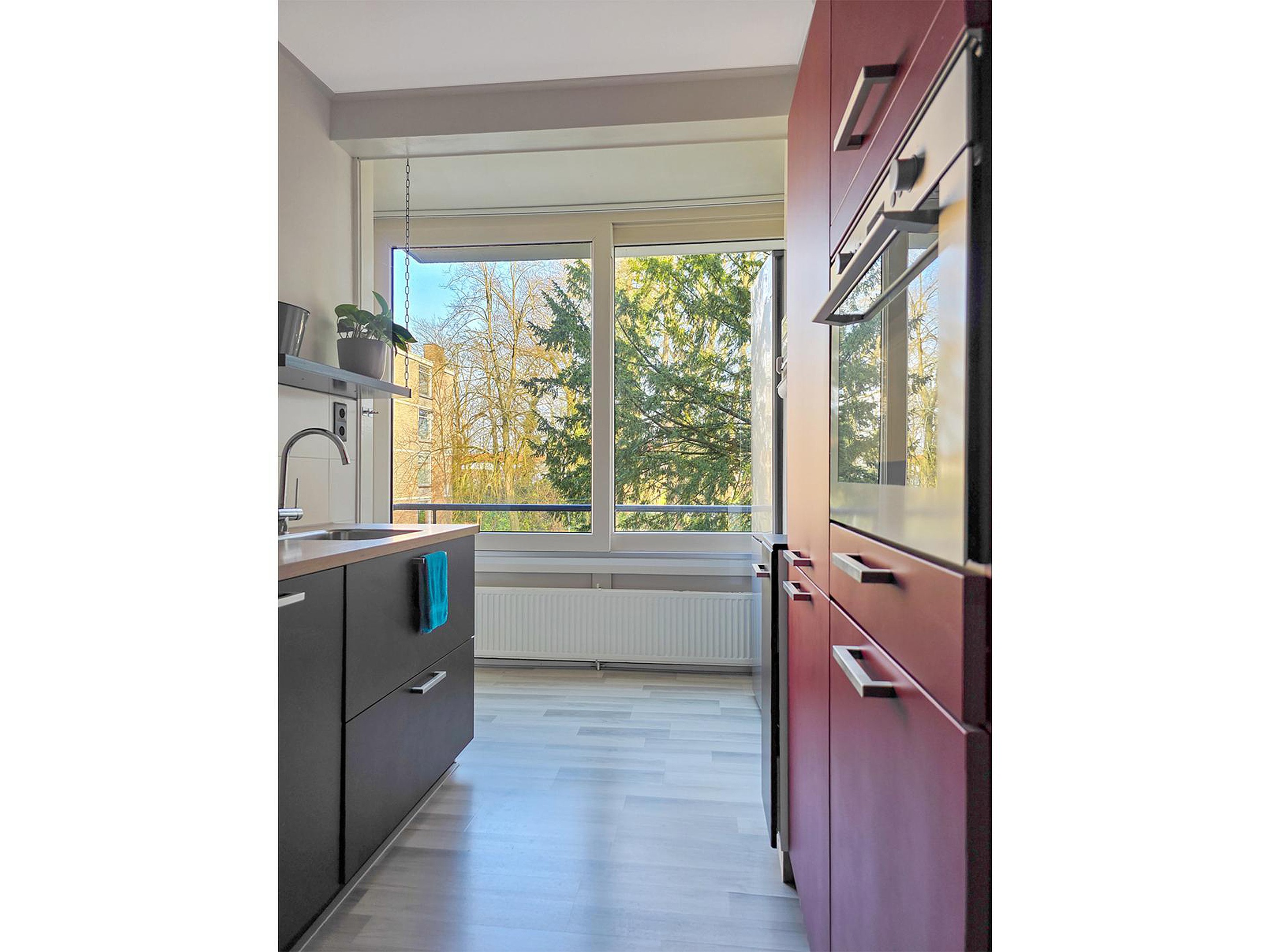 Stap binnen in dit appartement en het eerste wat je opvalt, is het licht. Heel veel licht! Dankzij het extra zijraam geniet je van een doorzonwoonkamer waar het zonnetje altijd wel een plekje vindt.