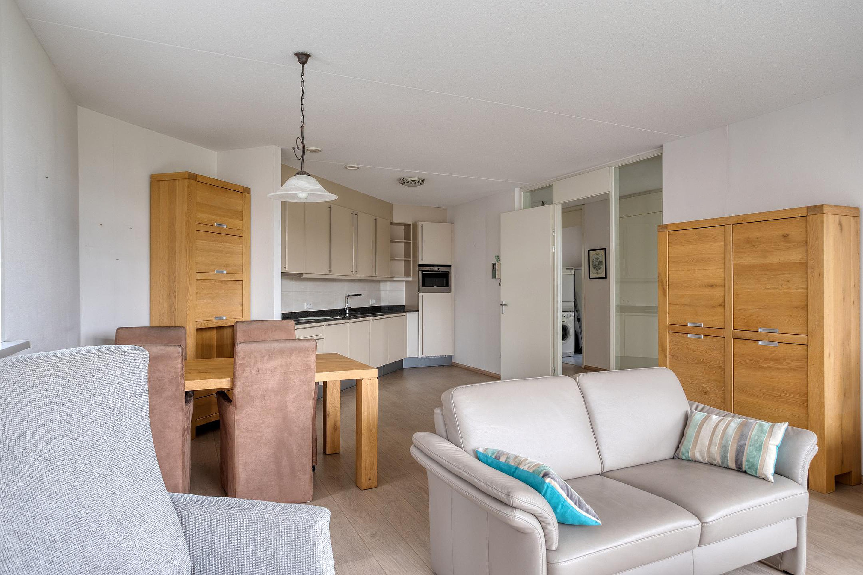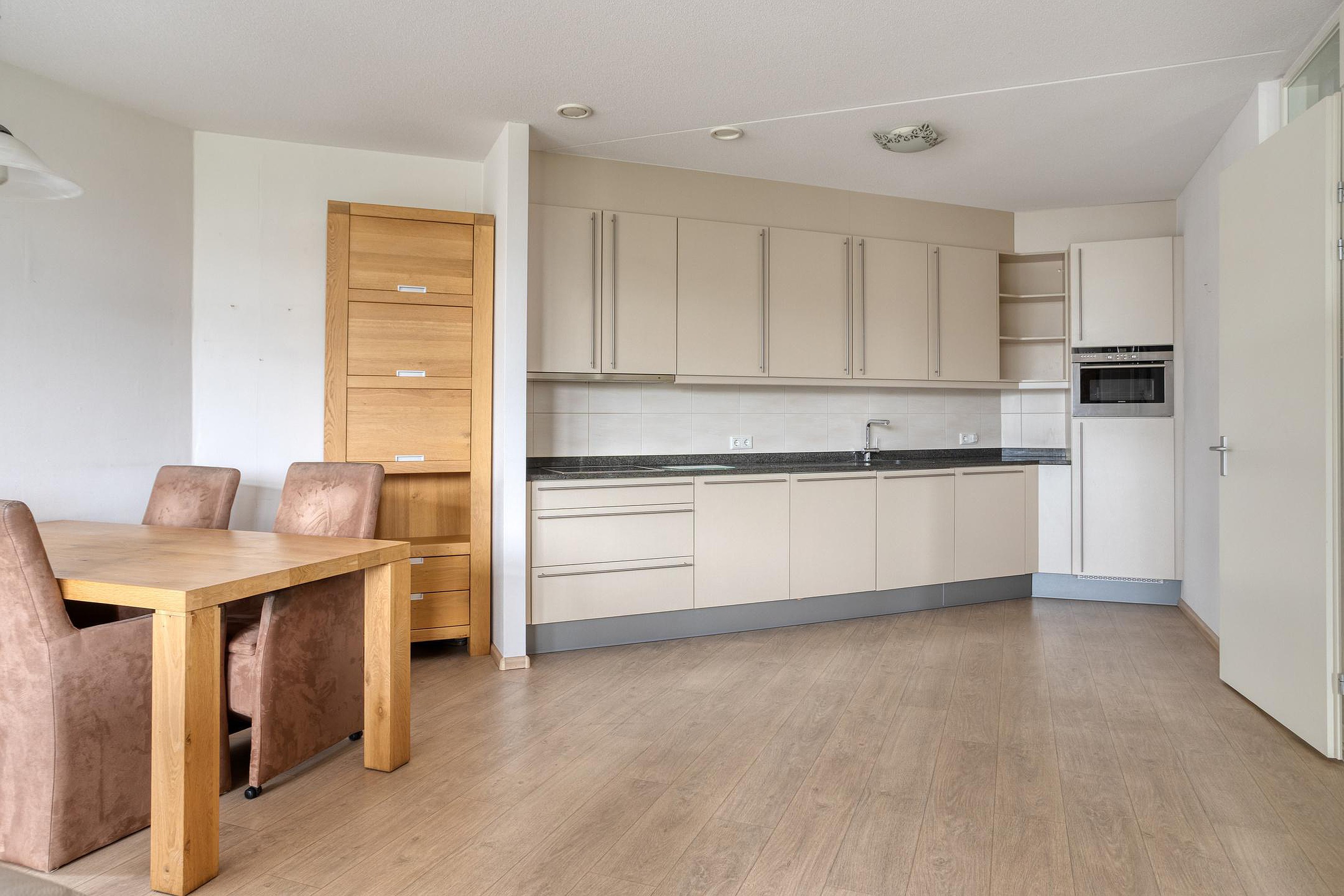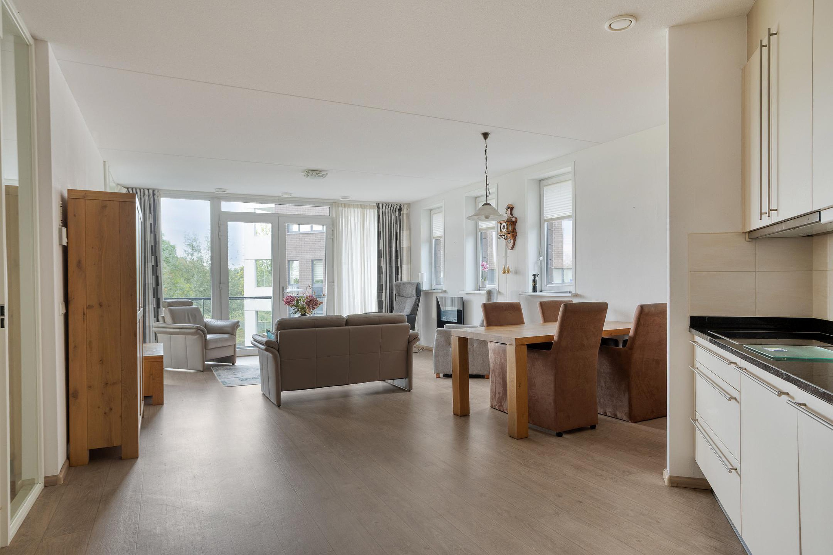 Het woongedeelte is voorzien van een ruime lange hal, moderne meterkast, uitnodigende lichte woonkamer met toegang tot het balkon, open keuken, dubbele balkondeur, twee slaapkamers (waarvan één met toegang tot het balkon), complete badkamer met wastafelmeubel en douche, separaat toilet met fonteintje en een bijkeuken berging technische ruimte met witgoedaansluitingen én Wtw-installatie. De keukeninrichting is praktisch en is voorzien van inbouwapparatuur (inductie kookplaat, combi-oven/magnetron, vaatwasser, koelkast en afzuigunit).