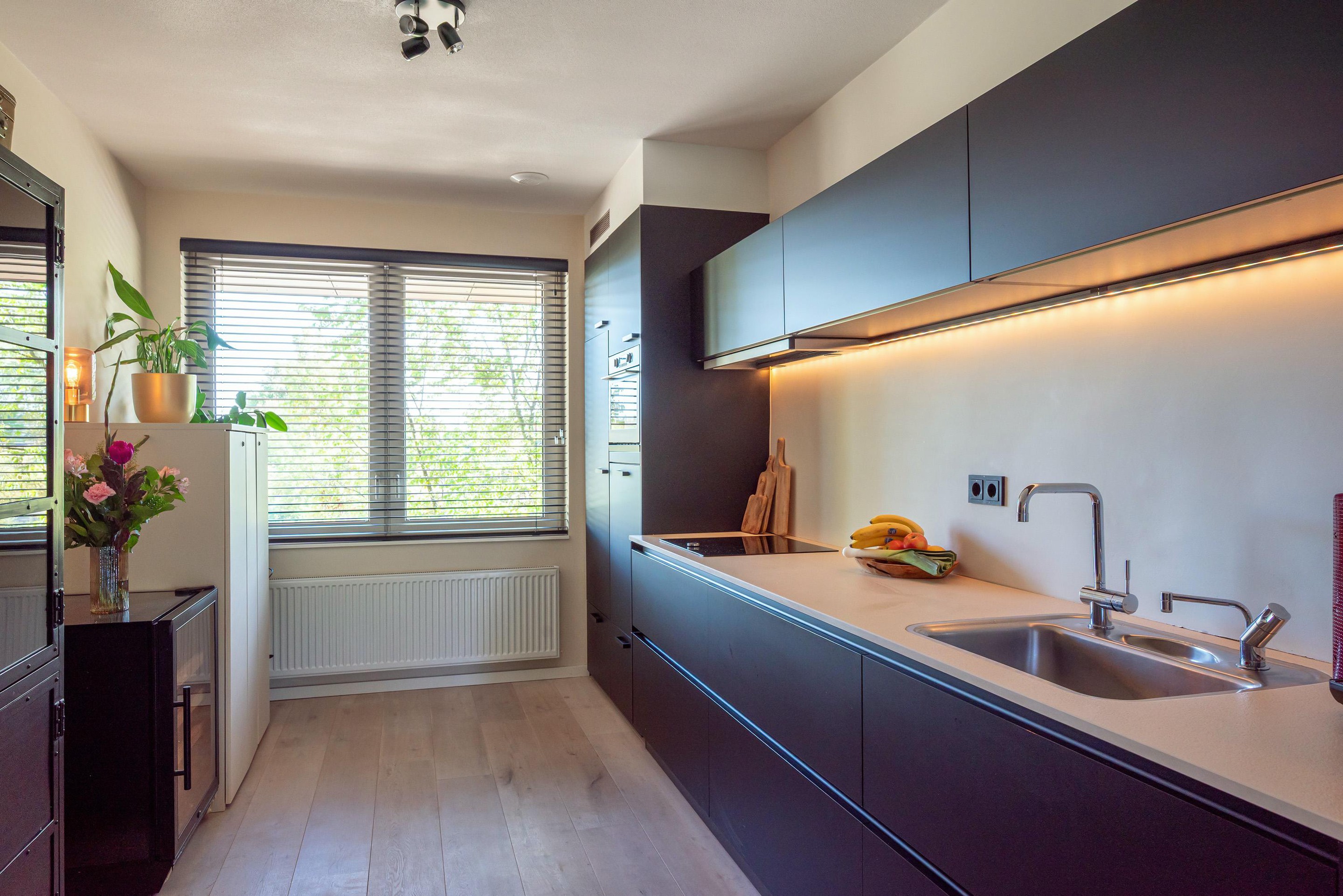 Begane grond Via de lift of trap kom je bij je eigen toegangshal. De heerlijke ruime woonkamer is strak afgewerkt en heeft een chique uitstraling. De woonkamer heeft een goed formaat en heeft een deur naar het waanzinnig ruime en fijne dakterras van ca 20 m2 op het westen gelegen. De open keuken is voorzien van inbouwapparatuur en een inductiekookplaat. De twee slaapkamers hebben ook allebei een goed formaat, genoeg ruimte voor een kledingkast en zijn netjes afgewerkt. De luxe badkamer heeft een lekkere inloopdouche, vakjes voor de handdoeken, een handdoekenradiator en een wastafelmeubel. Daarnaast is er op de woonetage nog een technische ruimte voor de wasmachine, de droger en de cv-installatie.