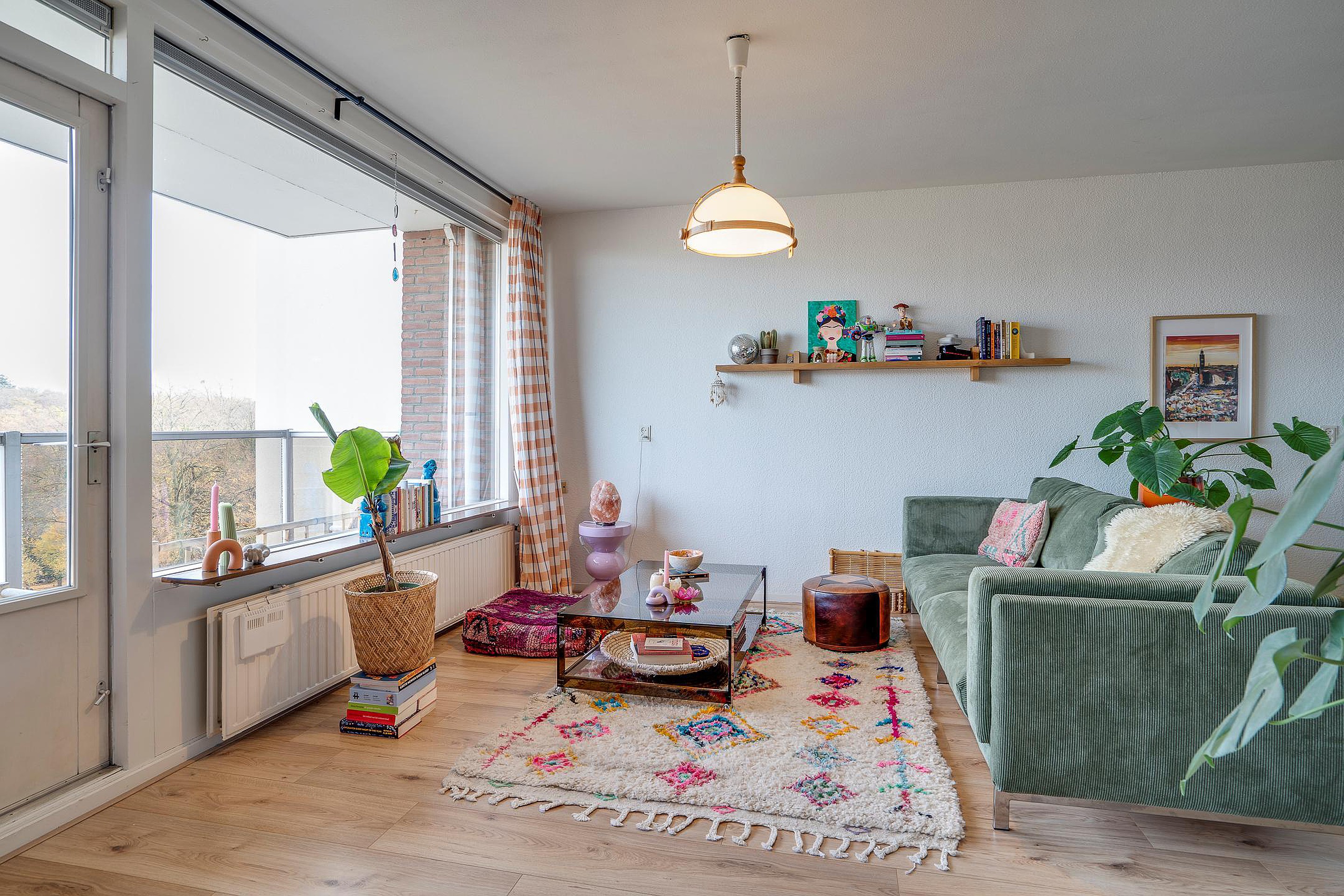 De woonkamer voelt licht en ruim aan en geeft direct toegang tot het balkon.