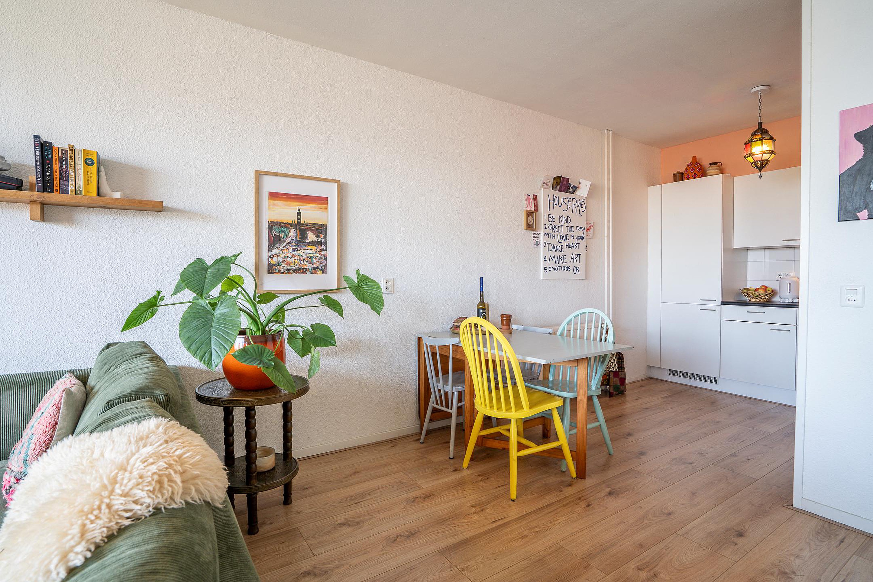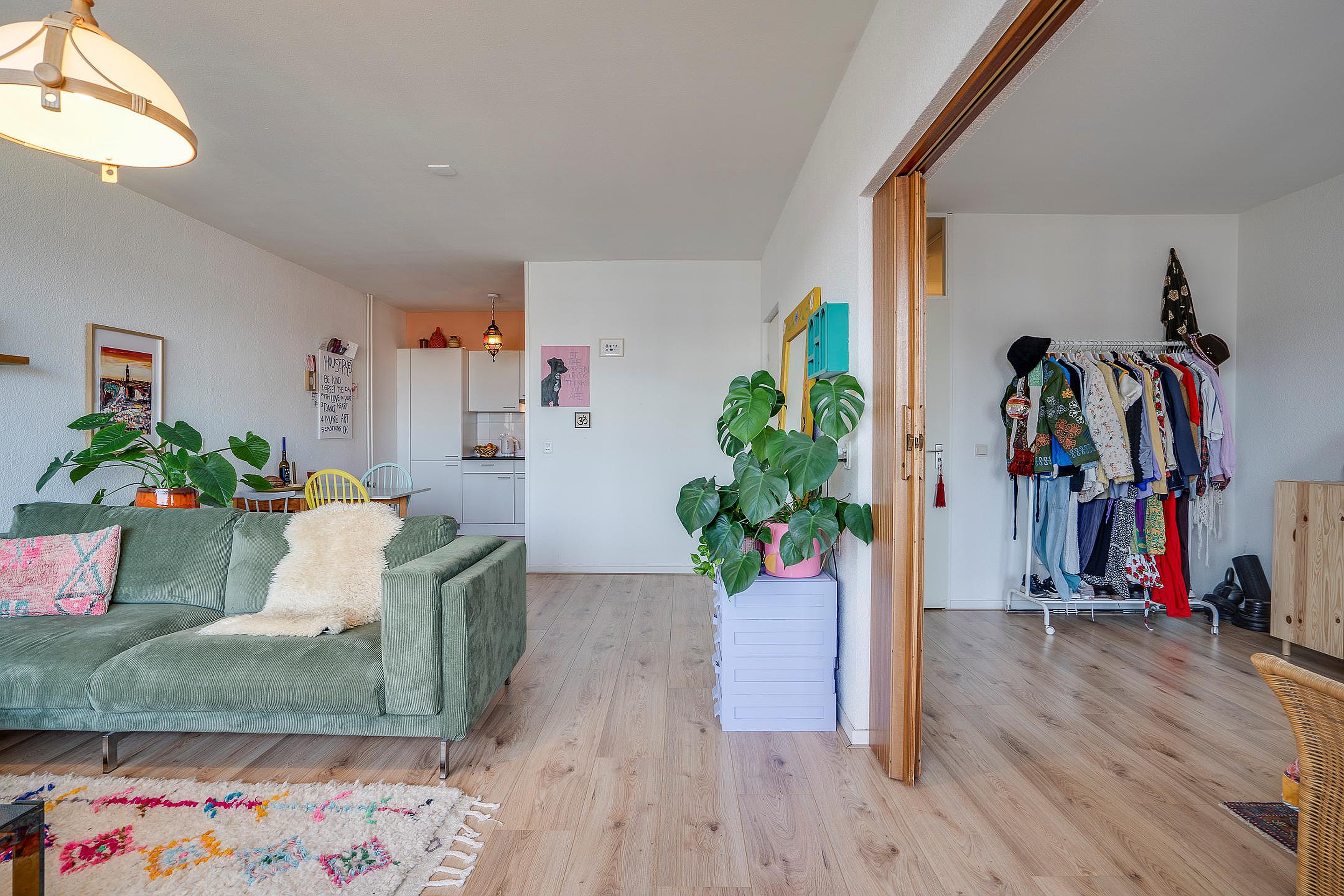 De slaapkamer ligt aan de rustige achterzijde van het appartement. Via een vouwwand staat deze ruimte in verbinding met de woonkamer. Je kunt de slaapkamer openlaten voor een ruimtelijk effect of afsluiten voor meer privacy.