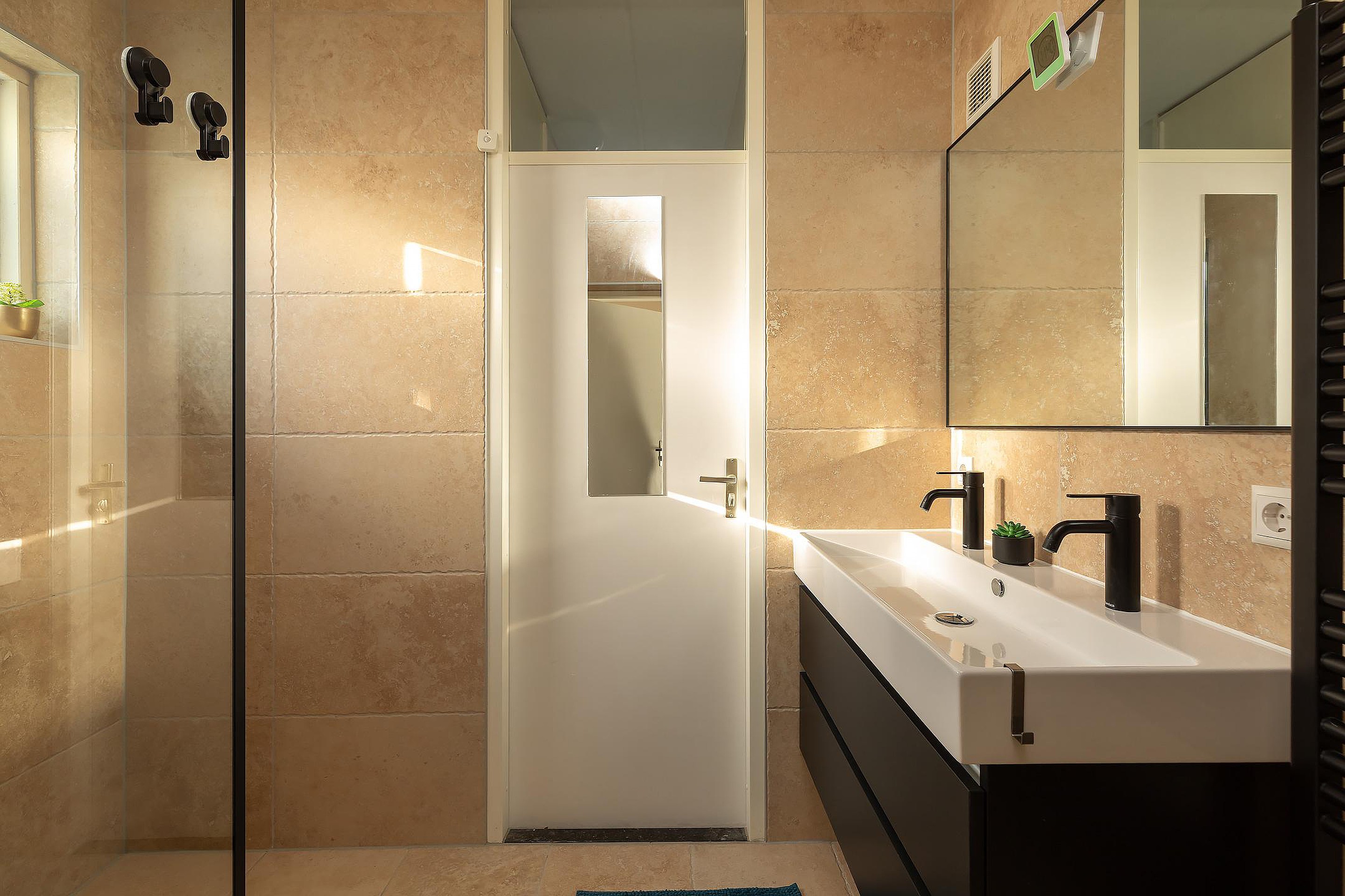 Centraal in de woning bevinden zich de sanitaire voorzieningen. Het toilet is vanuit de hal toegankelijk, wat praktisch is voor zowel bewoners als gasten. De badkamer is verzorgd en comfortabel ingedeeld, met een ruime douche en een wastafelmeubel met dubbele kraan. De rustige en nette afwerking sluit mooi aan bij de rest van het appartement en draagt bij aan het instapklare karakter.