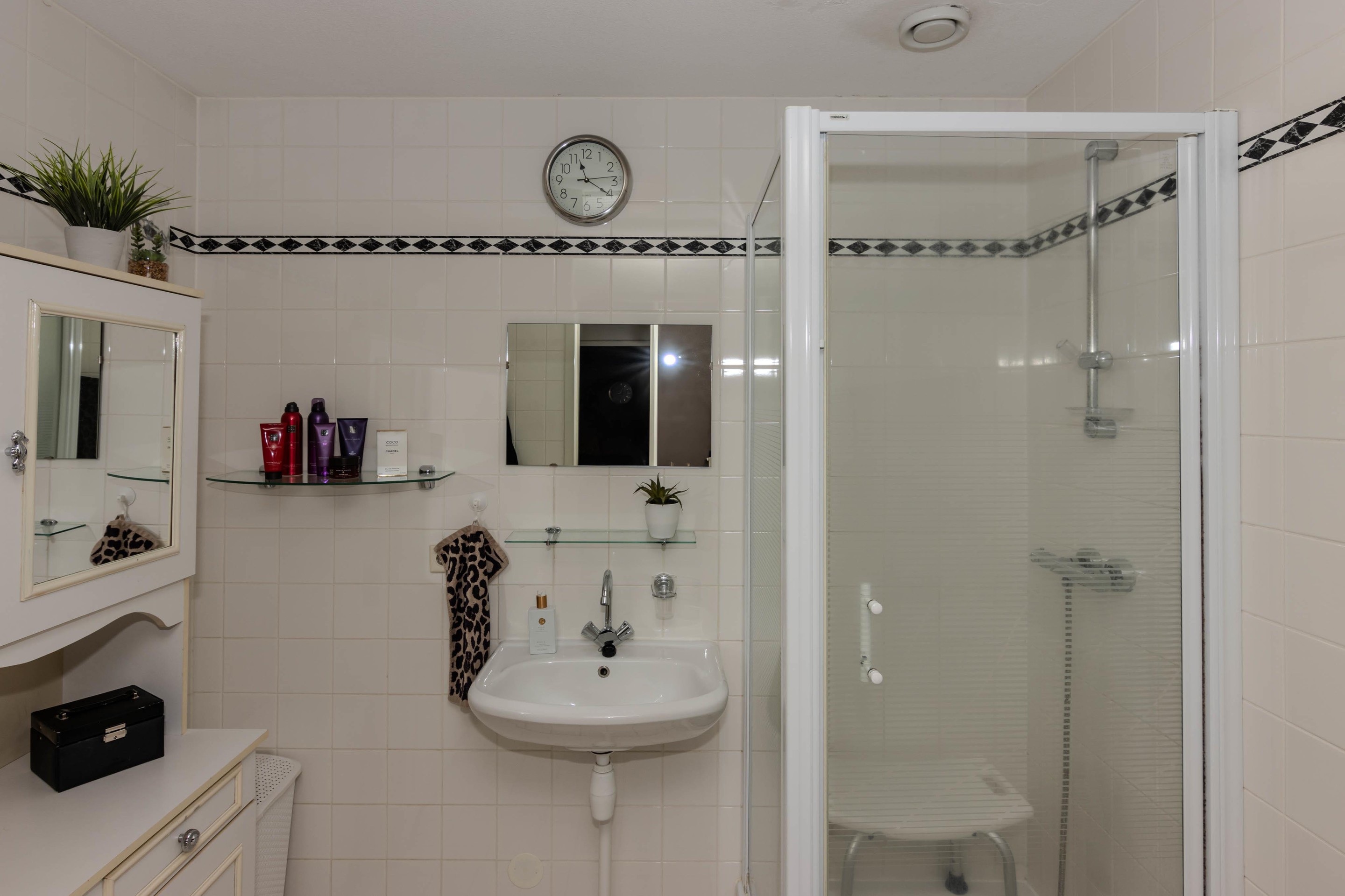 De badkamer is volledig betegeld en is voorzien van een douchecabine, een wastafel en een radiator.
