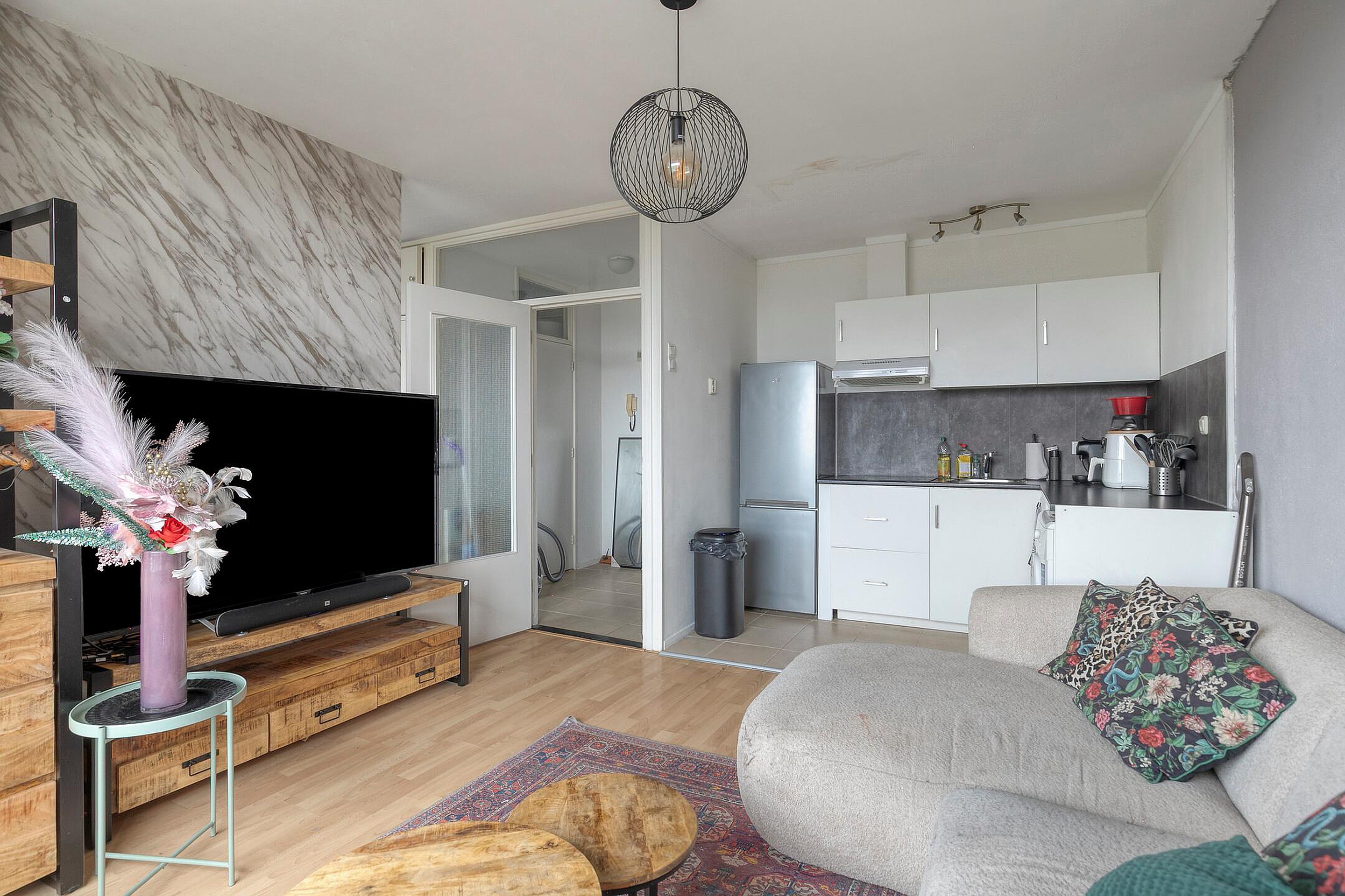 Entree woning met meterkast (2023) en intercominstallatie. Lichte woon-/slaapkamer met vaste kast en een moderne open keuken (2023) o.a. voorzien van een inductiekookplaat, afzuigkap, vrijstaande koel/vriescombinatie, tegelvloer en een wasmachineaansluiting. Separate slaapruimte. Fijne balkon (NO) met levendig, groen en vrij uitzicht. De woon-/slaapkamer is afgewerkt met een laminaat vloer. De badkamer beschikt over een wastafel, doucheruimte en een toilet.