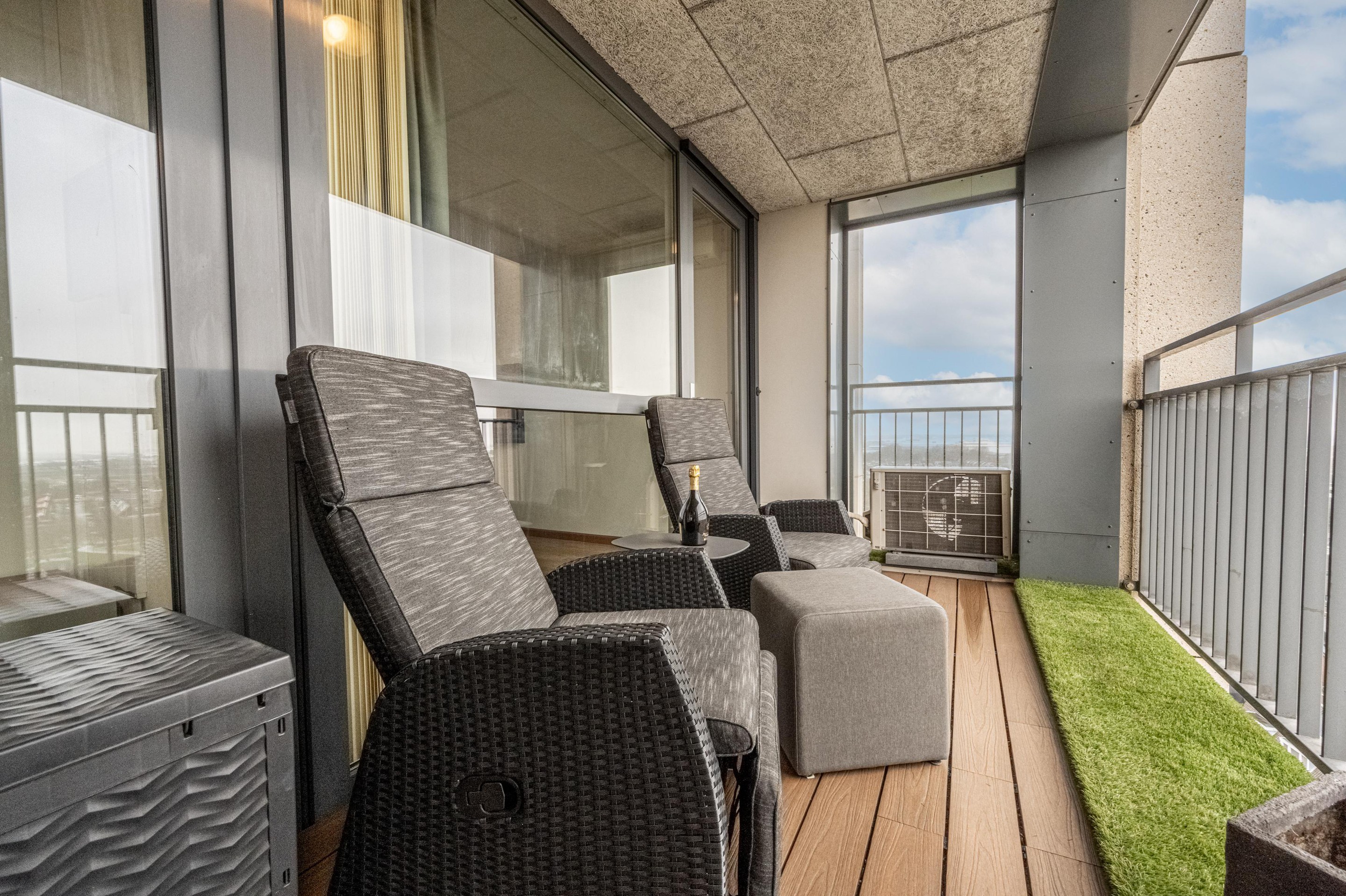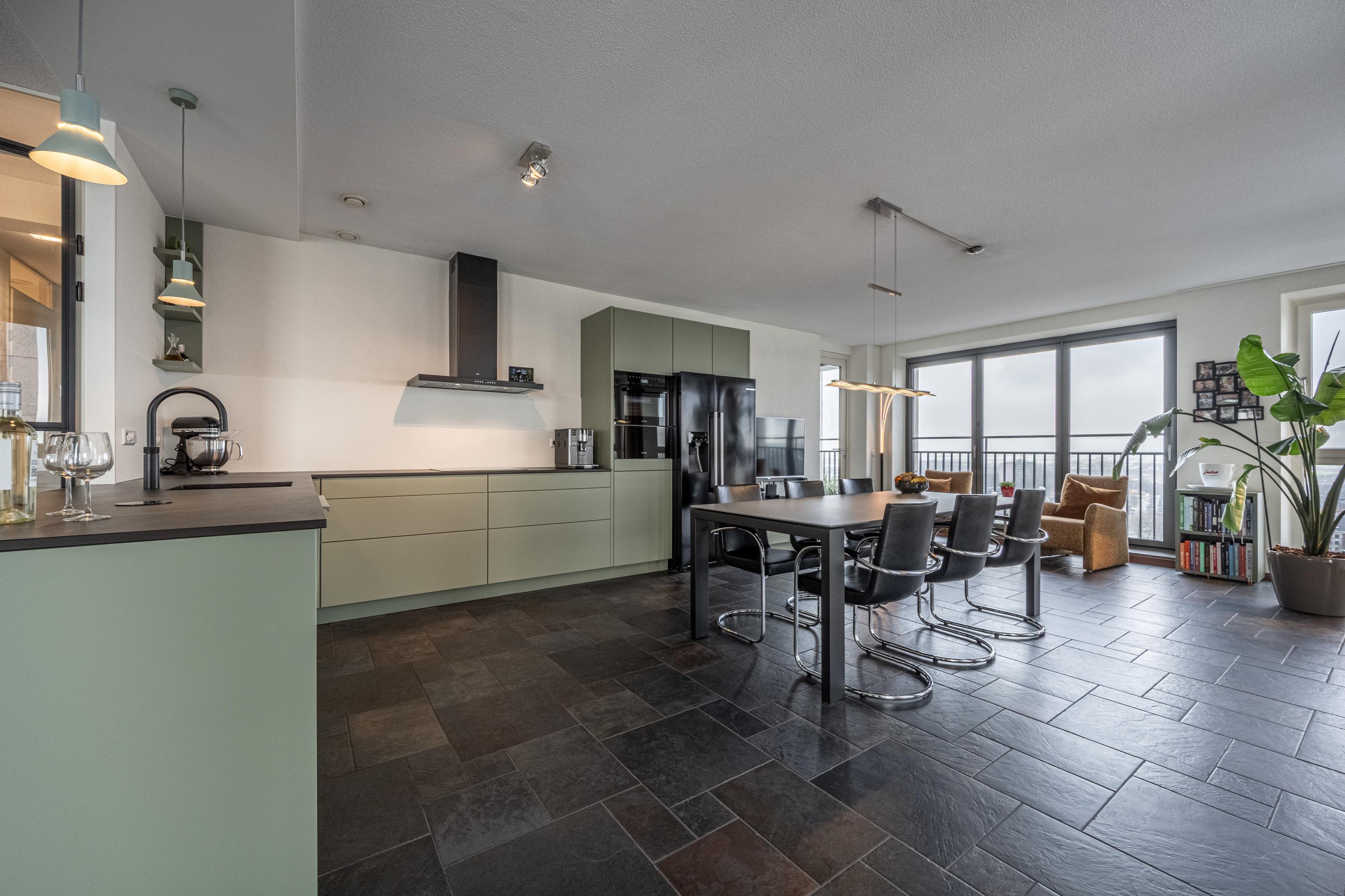 Vanuit de woonkeuken heb je toegang tot het balkon op het noordwesten. Dankzij de glazen zijpui kun je hier – zelfs op grote hoogte heerlijk beschut buiten zitten. Frisse lucht en uitzicht.