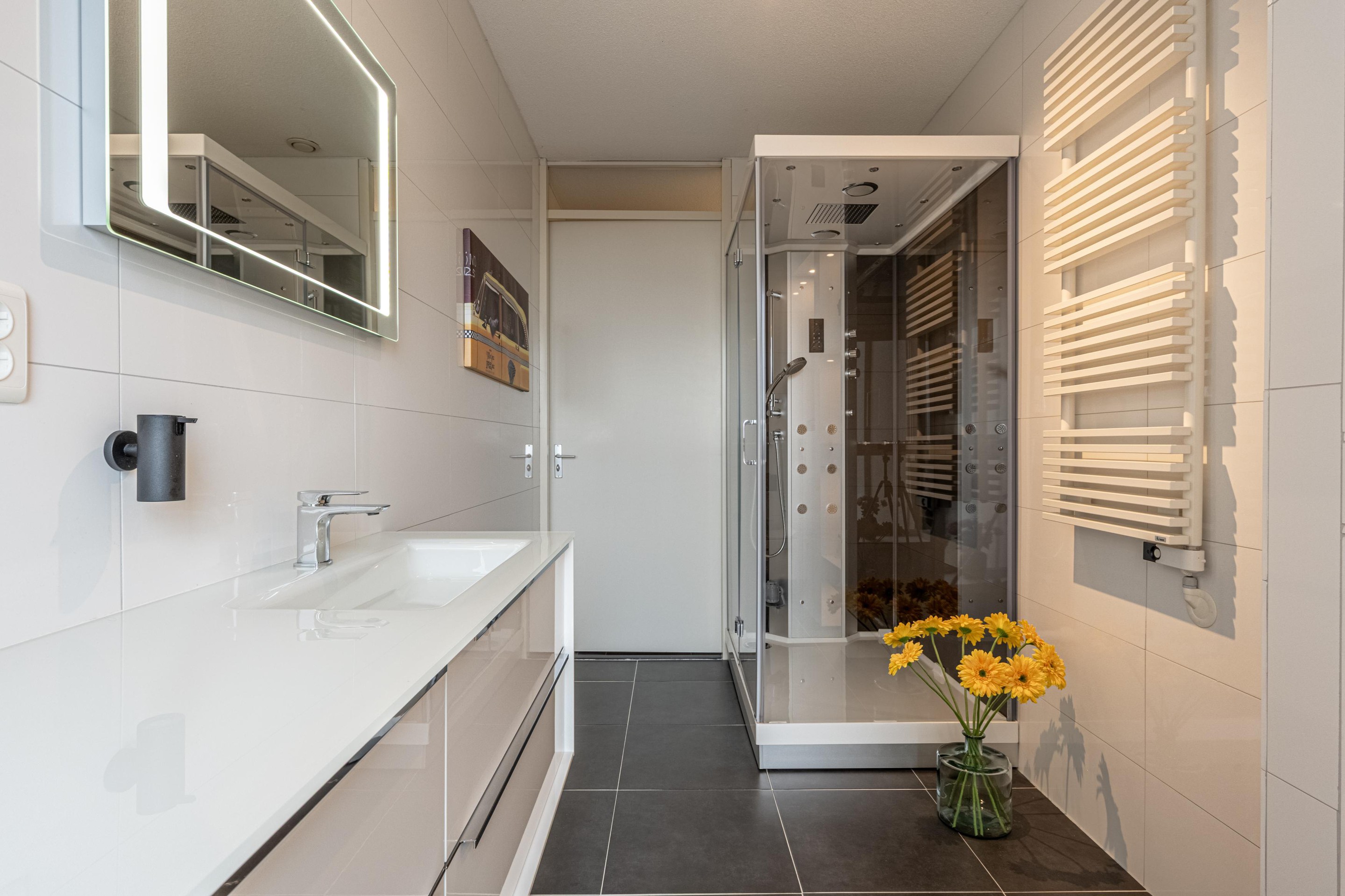 De badkamer is ruim en luxe uitgevoerd met vloerverwarming, een stoomcabine, wastafelmeubel en een toilet met sanibroyeur.