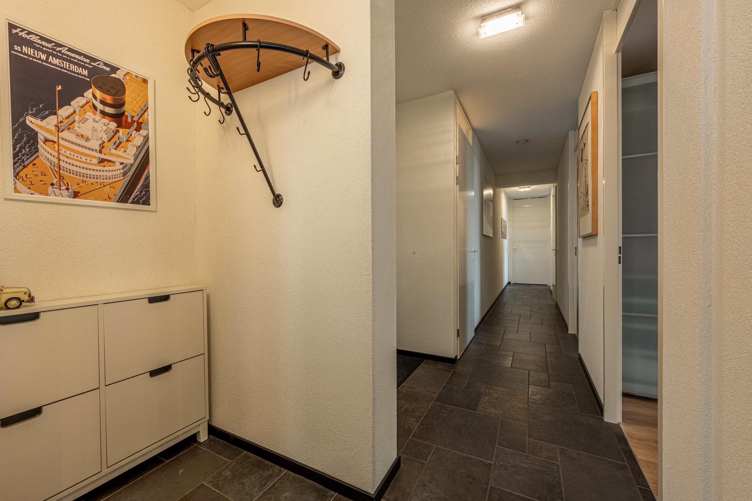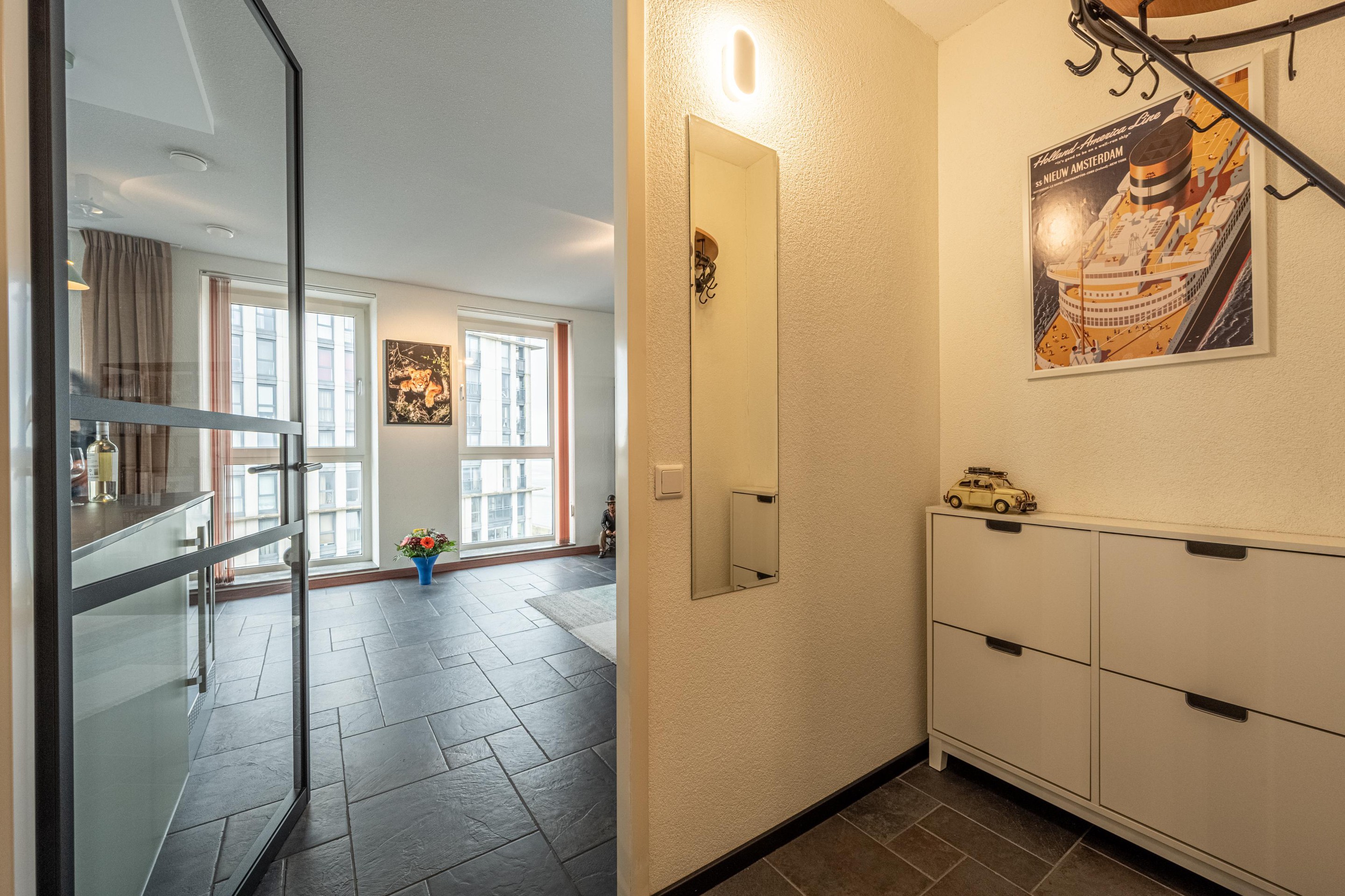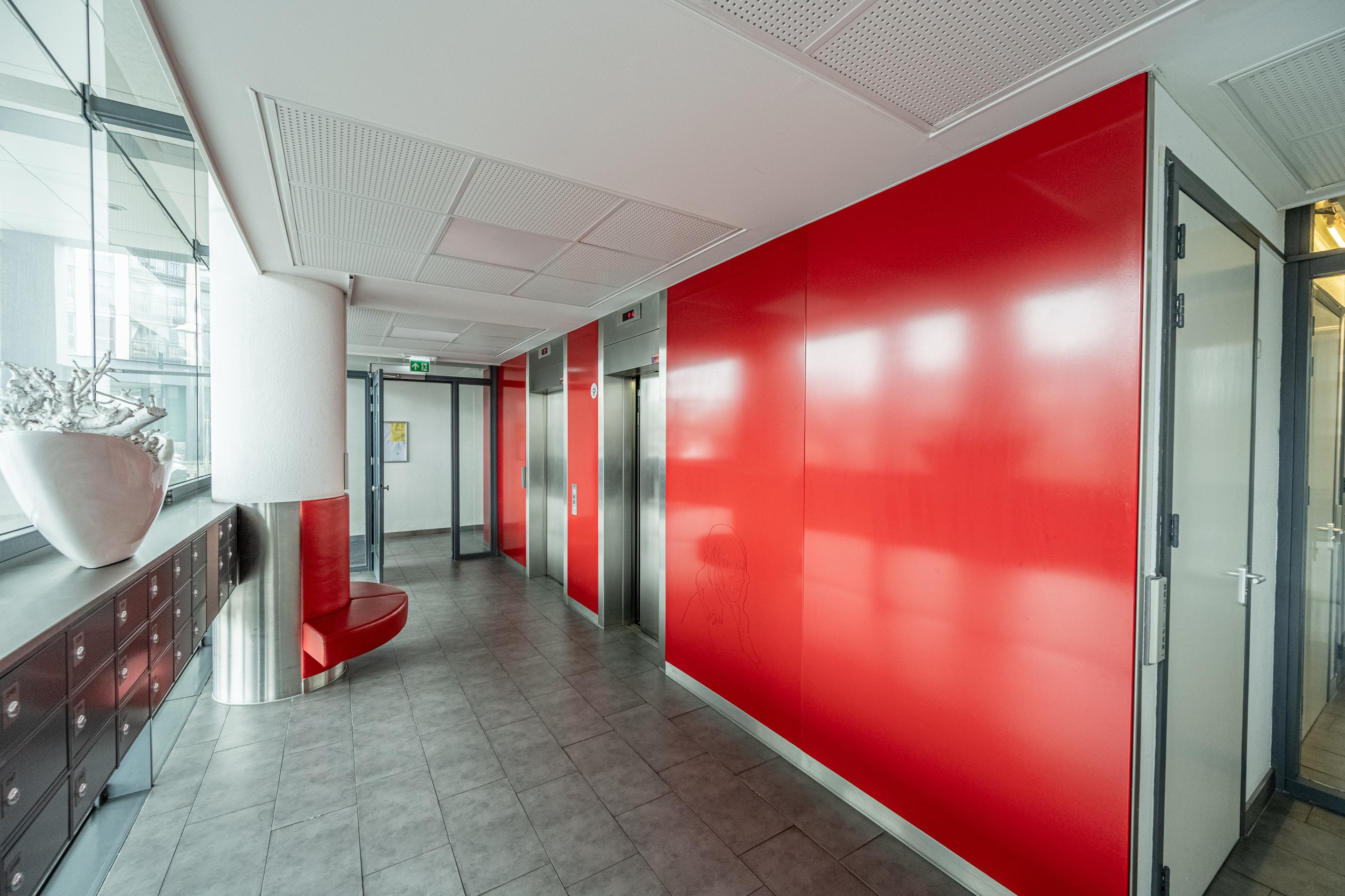 Met de lift bereik je de 13e verdieping, waar je binnenkomt in een brede, rustige hal met toegang tot slechts twee appartementen.