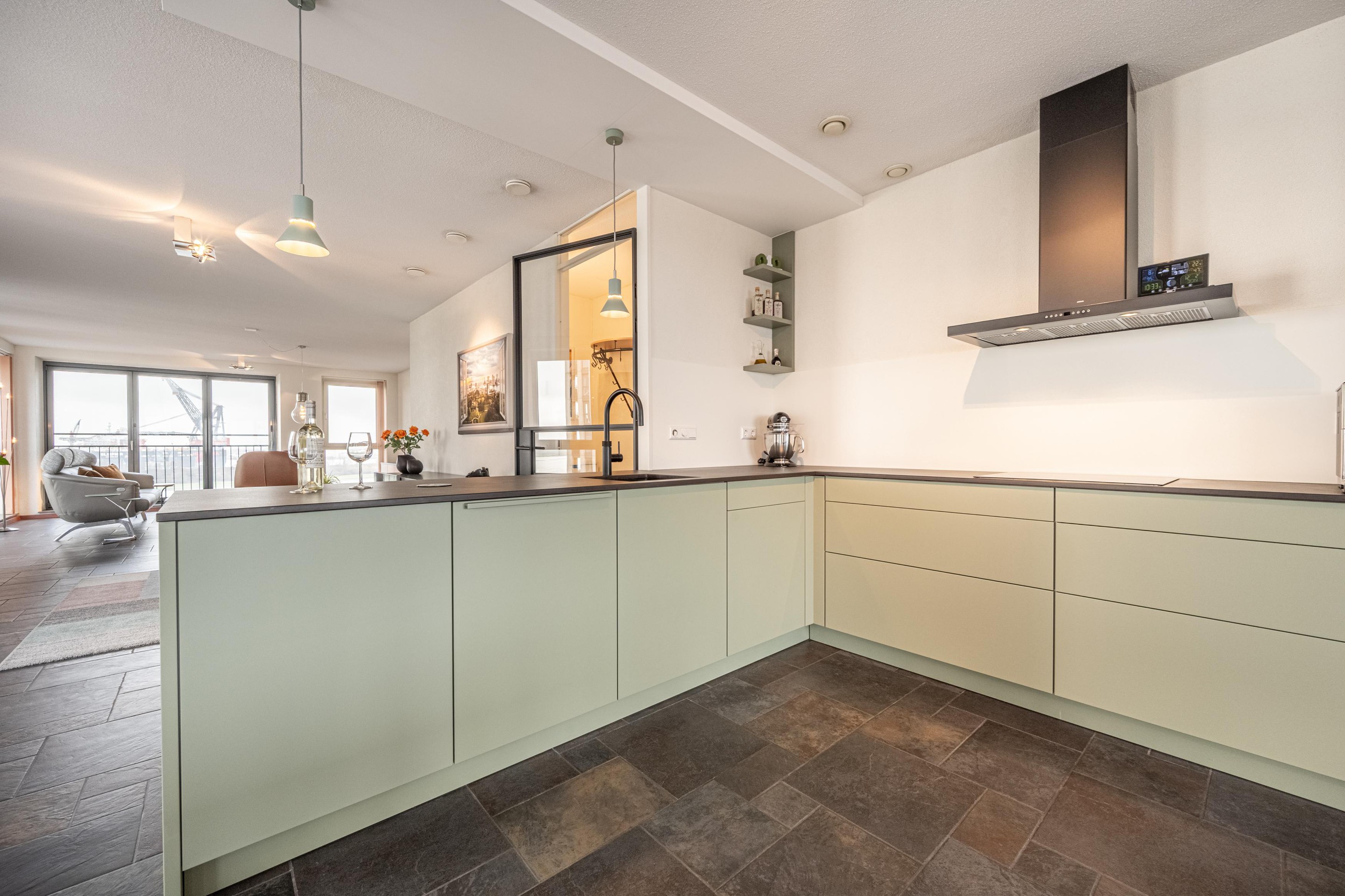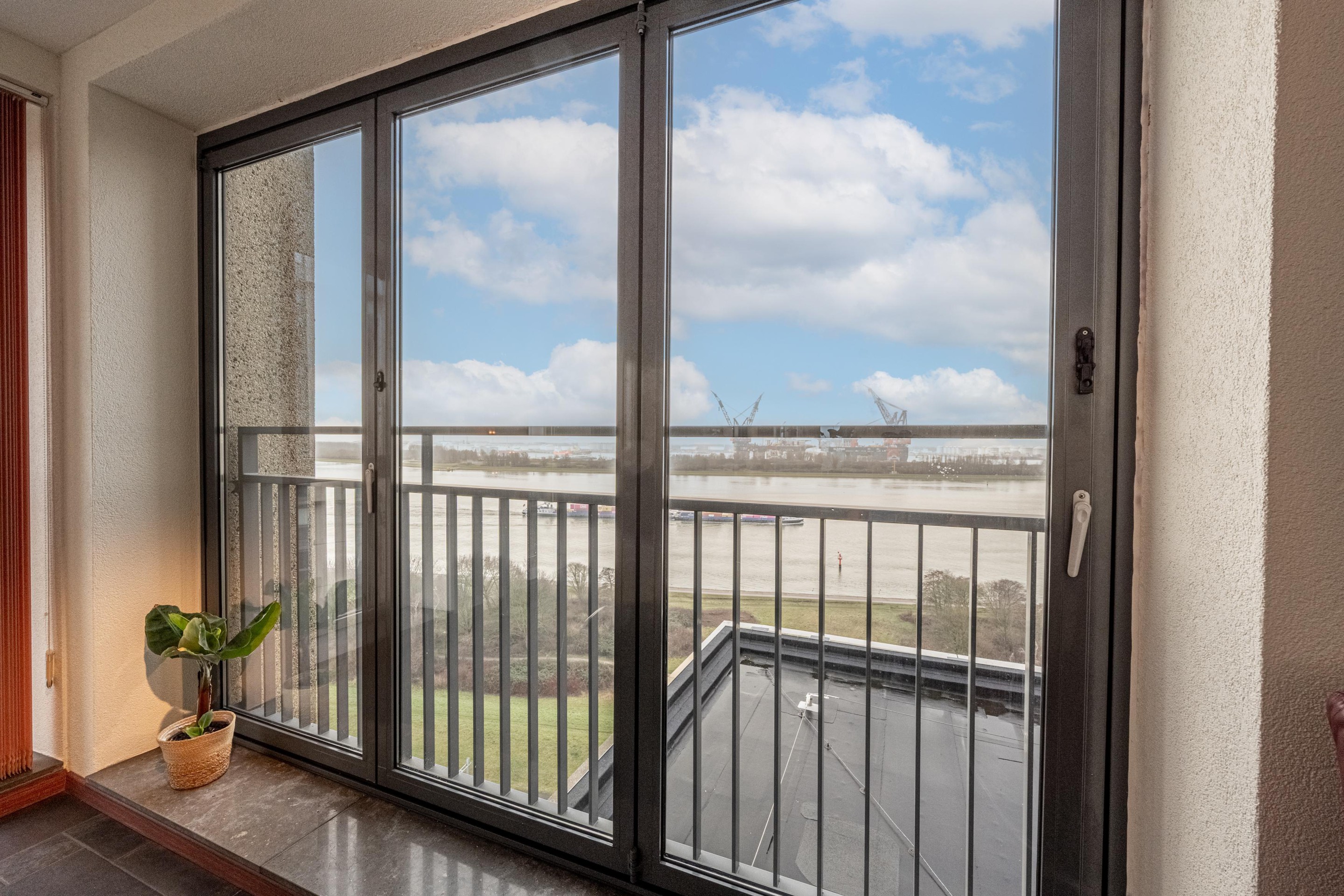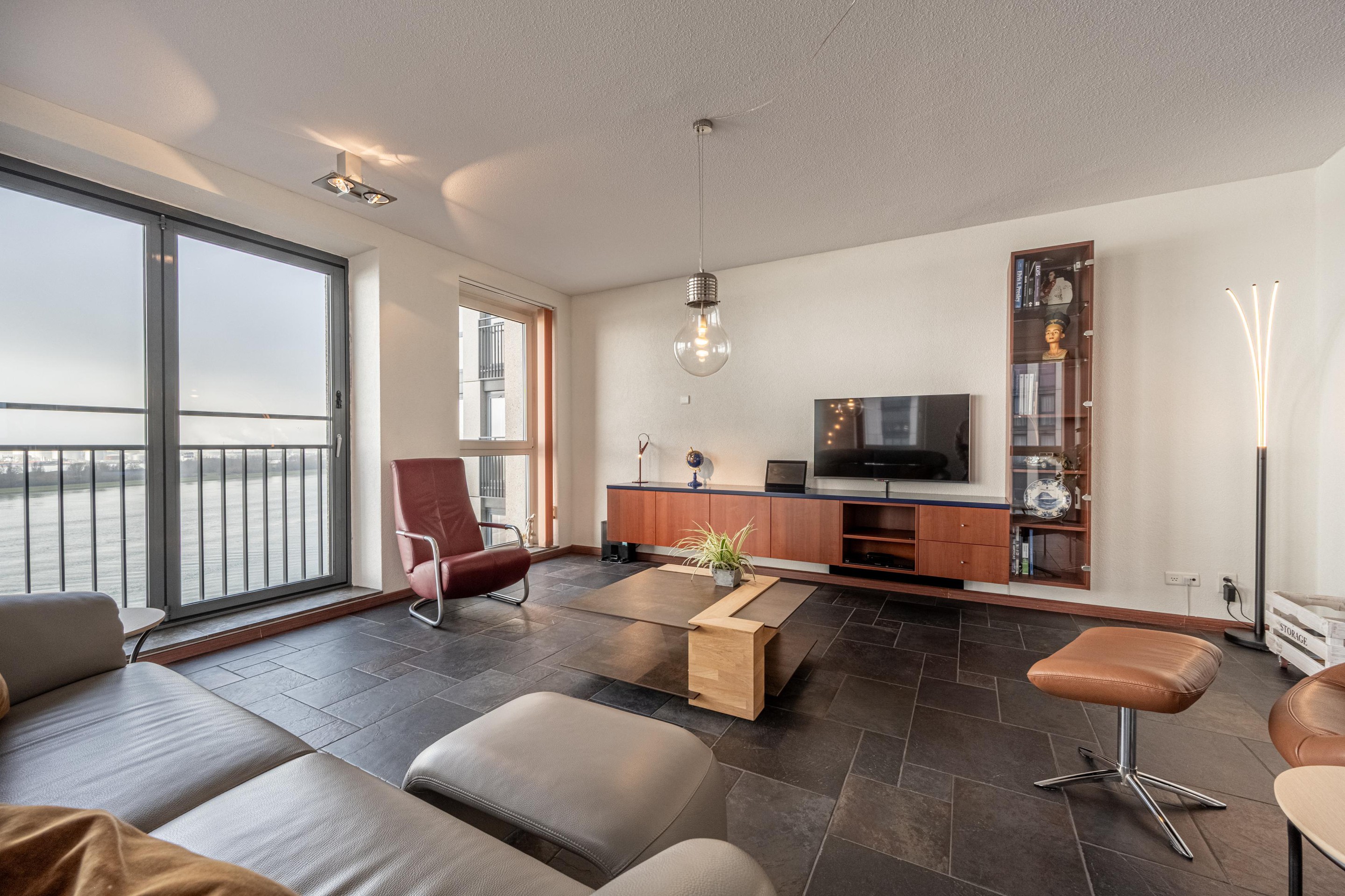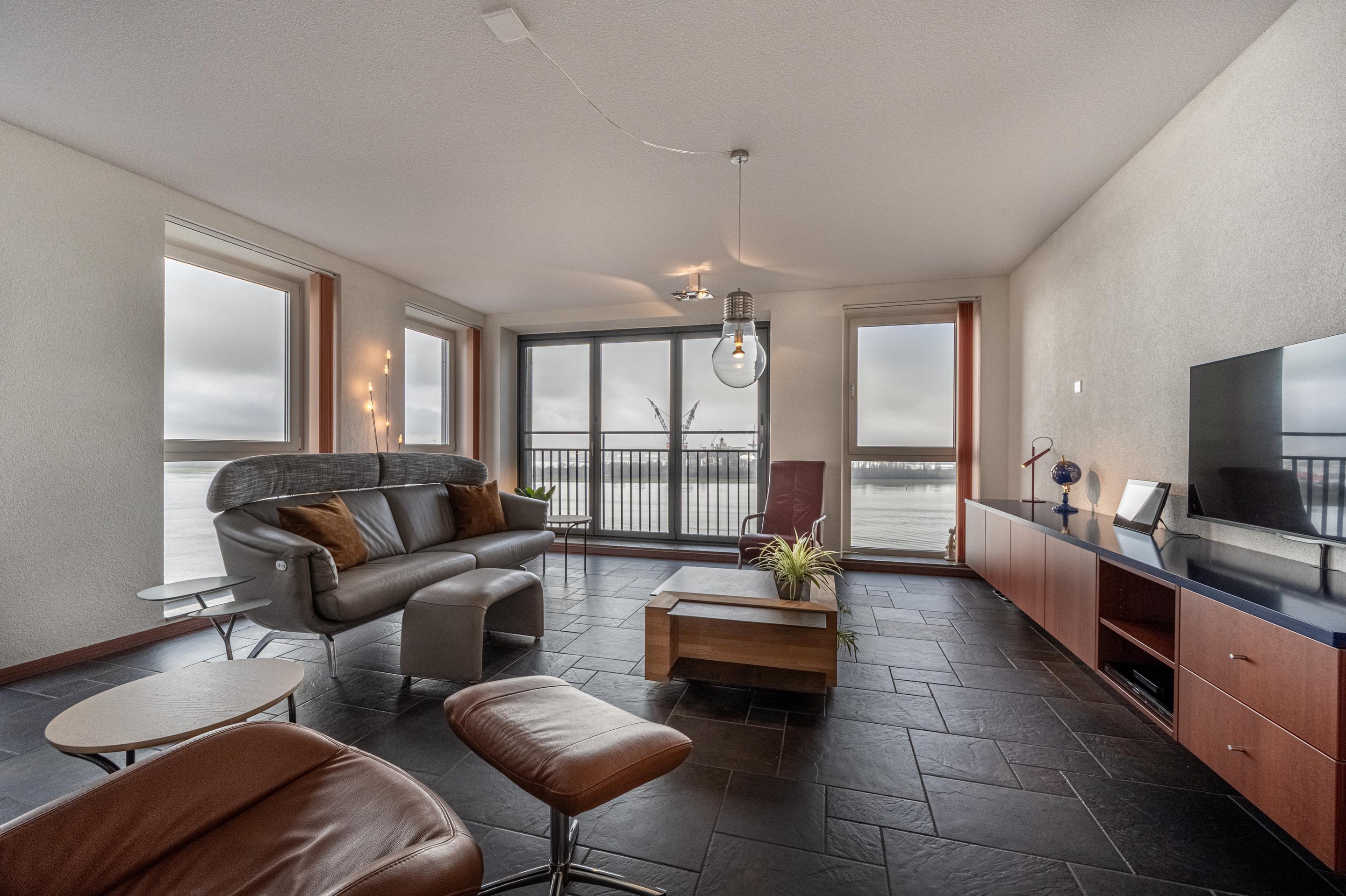 Deze woonkamer is het toonbeeld van comfort en beleving. Dankzij de royale raampartijen baadt de ruimte in licht en – misschien nog wel belangrijker in een adembenemend uitzicht over de Waterweg. Dit uitzicht is werkelijk uniek: levendig, weids en altijd in beweging. Cruiseschepen, vrachtschepen, licht, lucht… het verveelt geen moment.