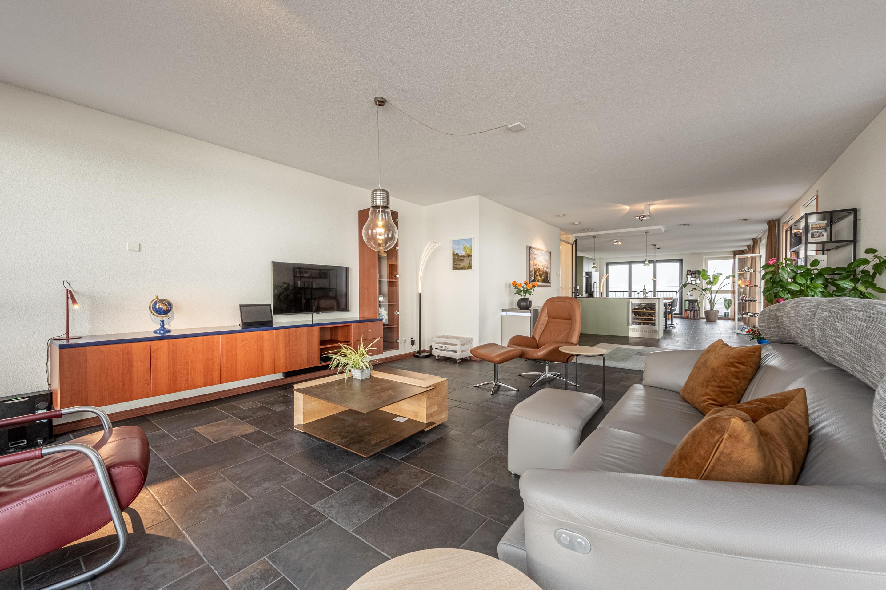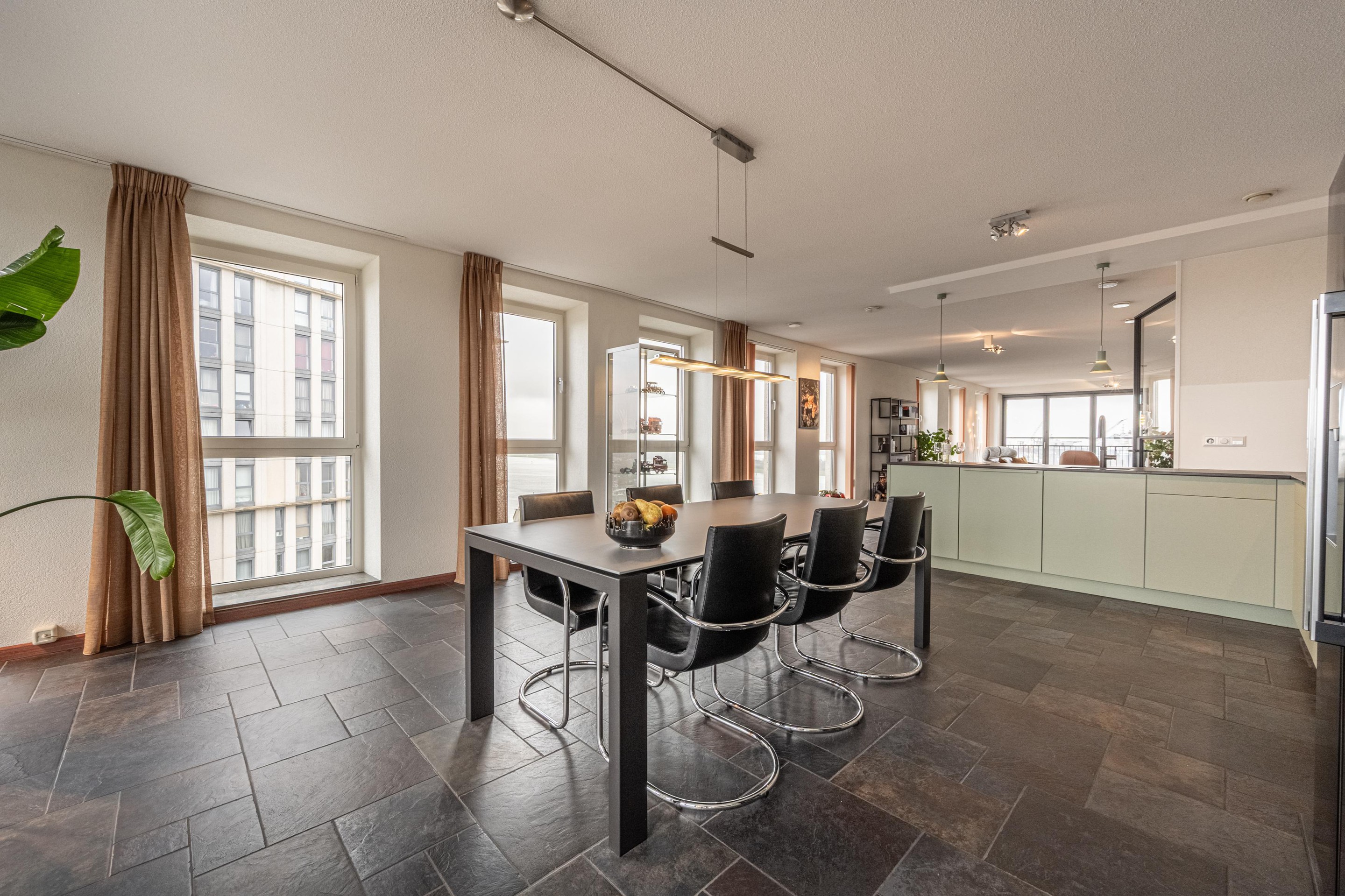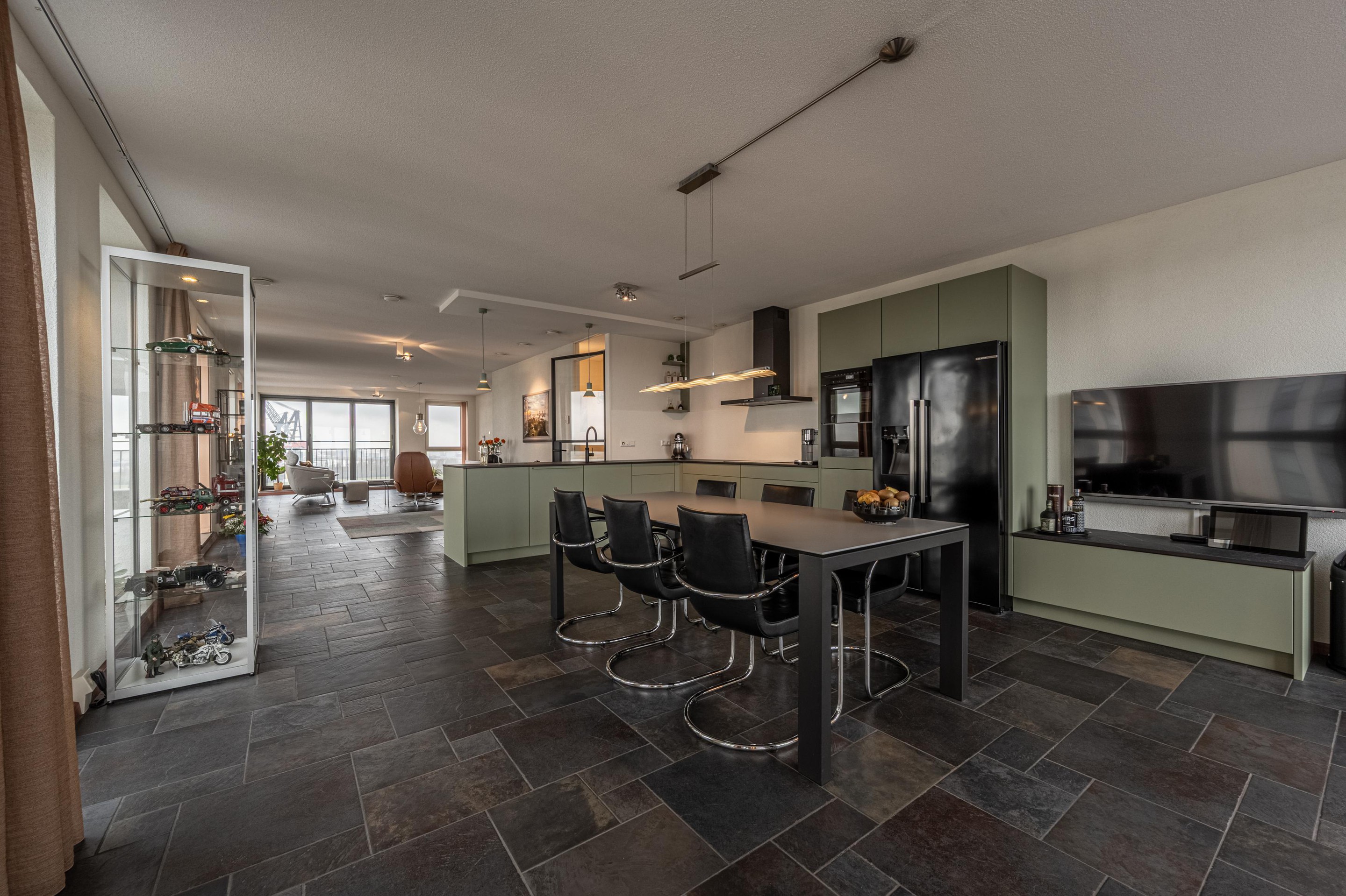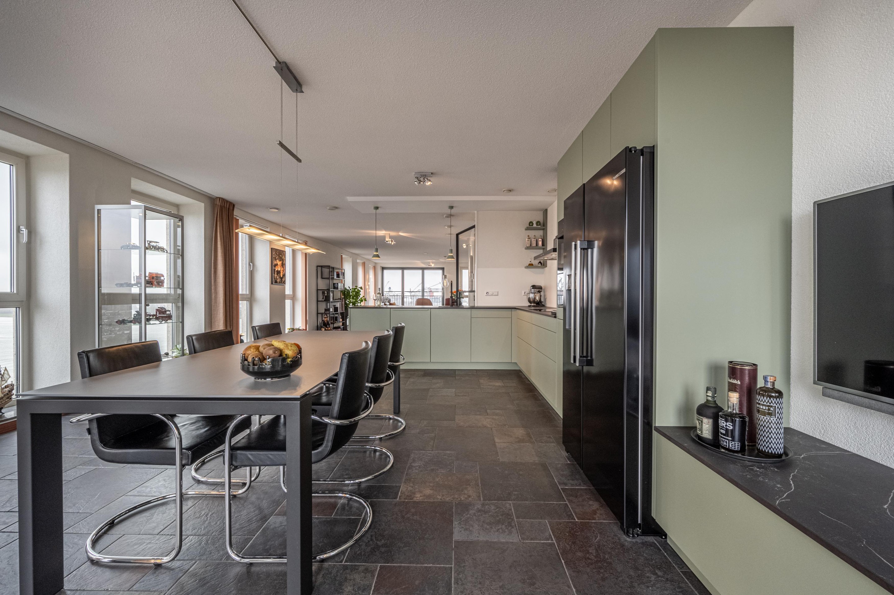Deze woonkamer is het toonbeeld van comfort en beleving. Dankzij de royale raampartijen baadt de ruimte in licht en – misschien nog wel belangrijker in een adembenemend uitzicht over de Waterweg. Dit uitzicht is werkelijk uniek: levendig, weids en altijd in beweging. Cruiseschepen, vrachtschepen, licht, lucht… het verveelt geen moment.