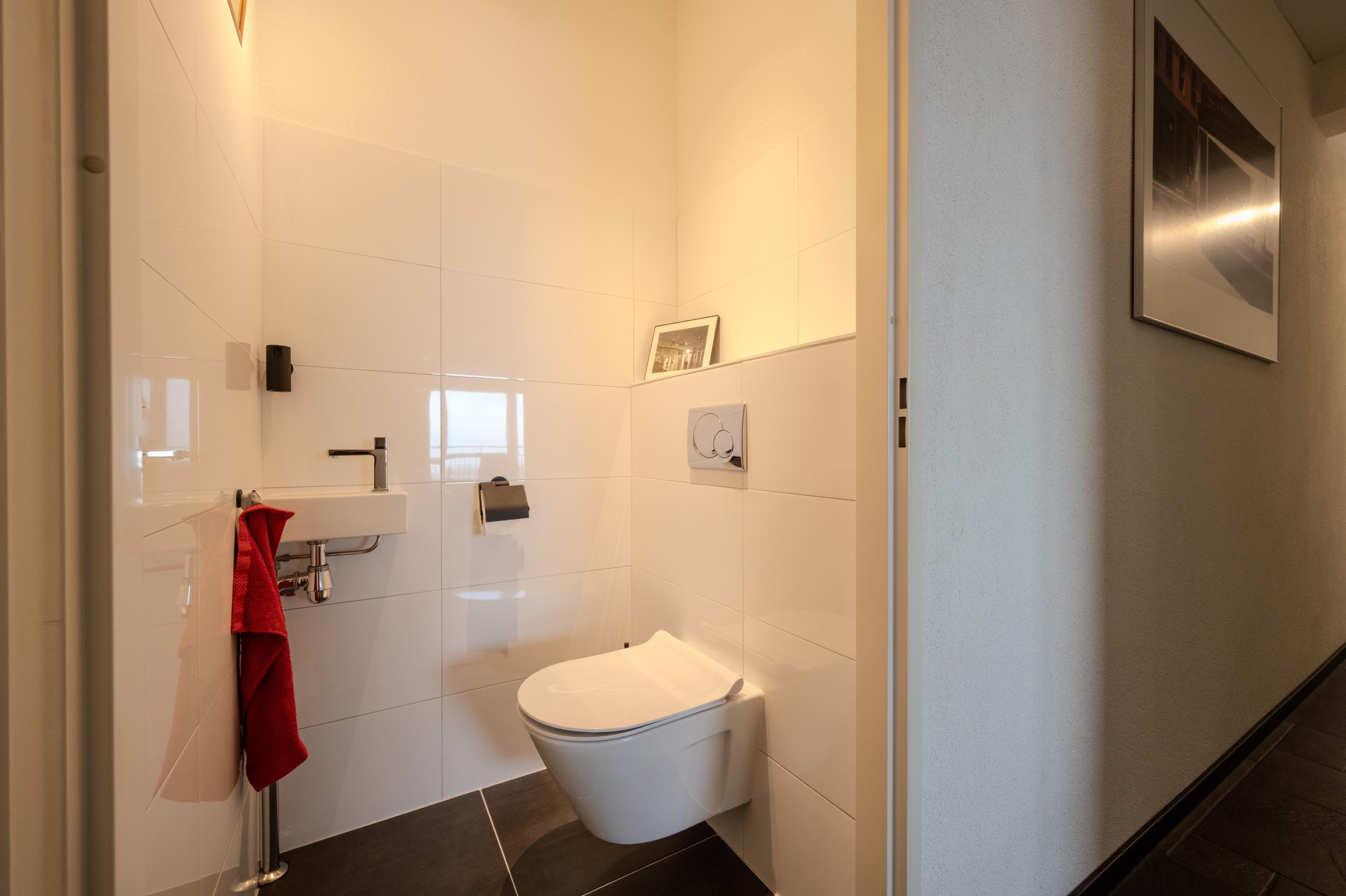 Daarnaast beschikt het appartement over een tweede toilet, half betegeld en voorzien van een fonteintje – praktisch en comfortabel voor gasten.