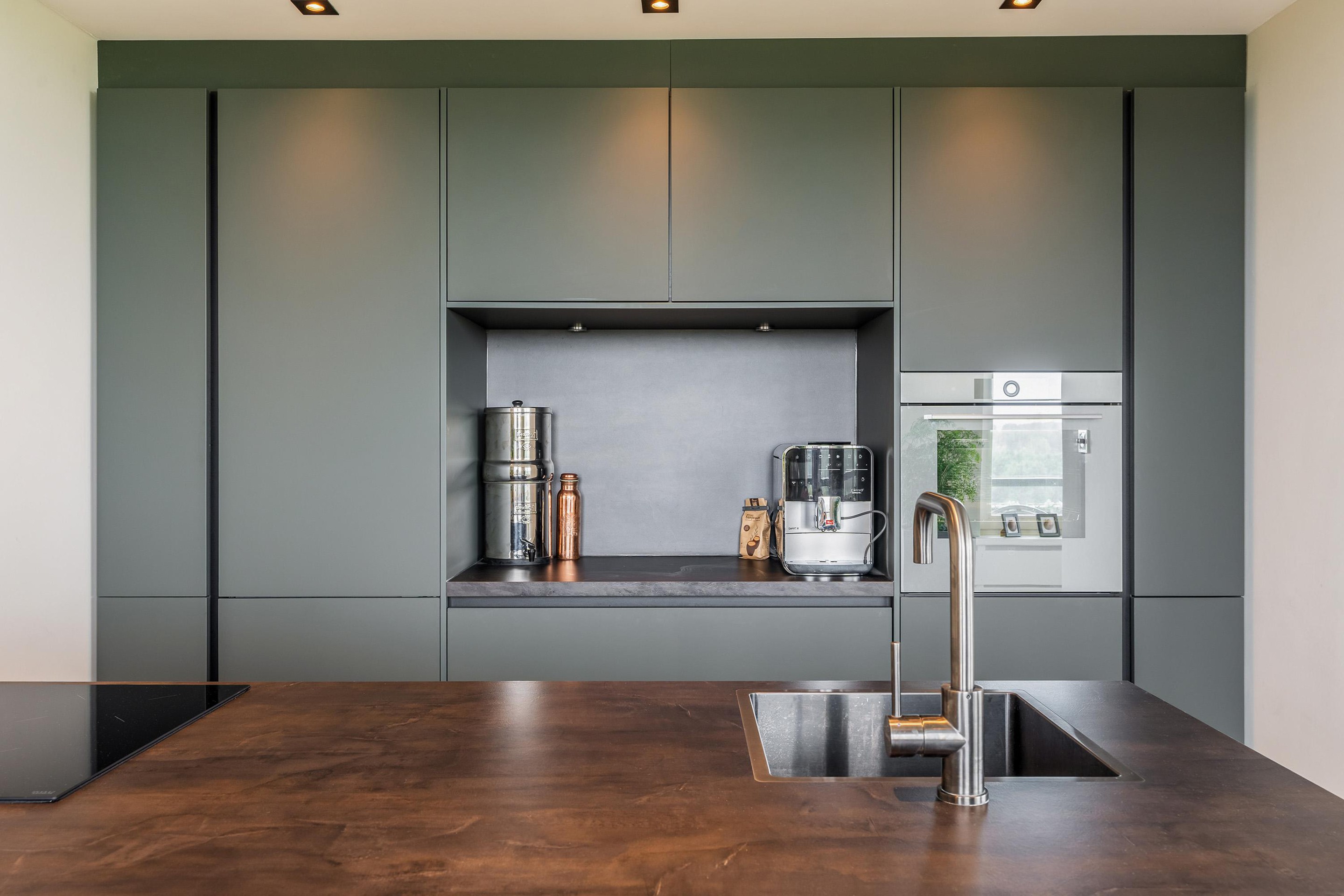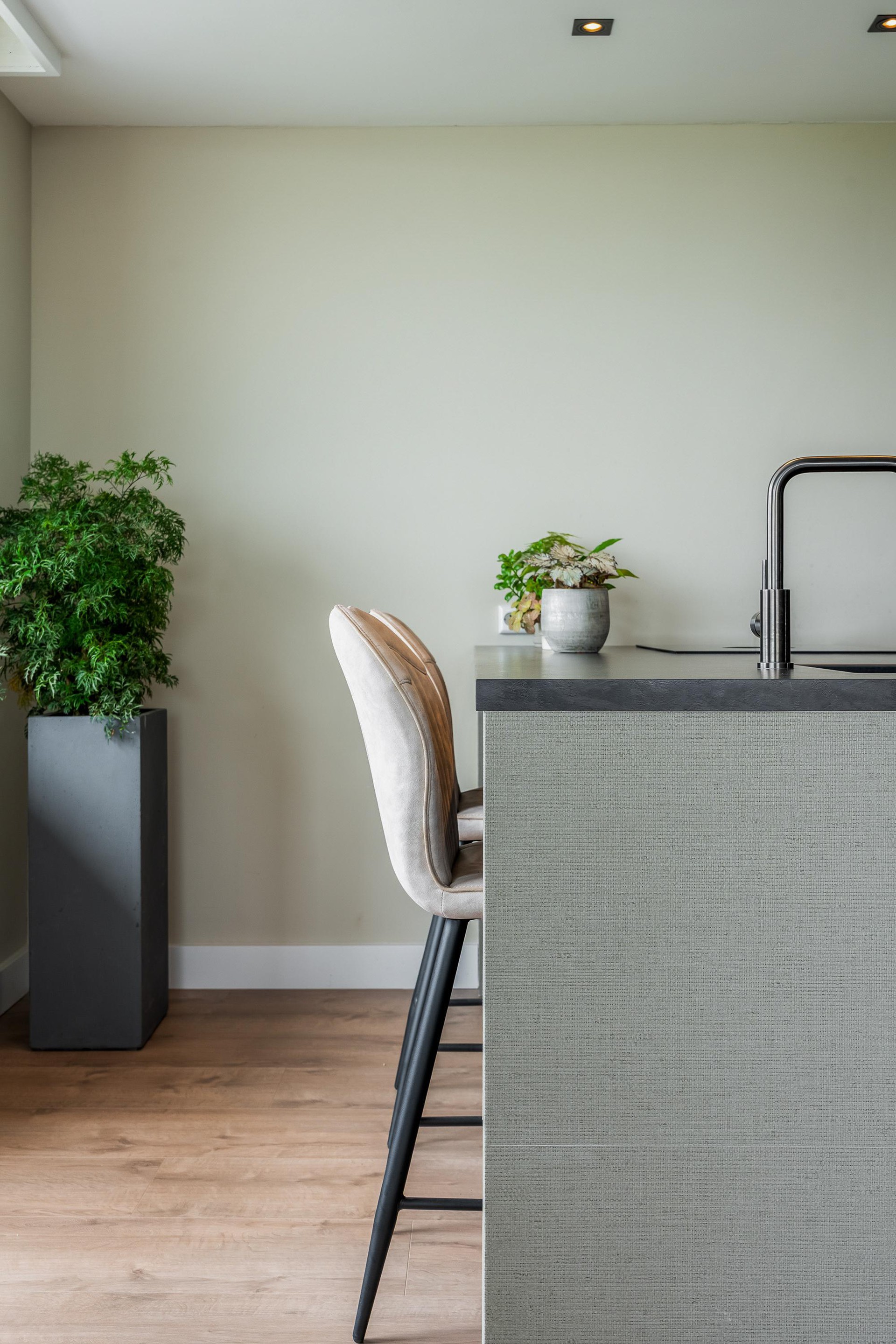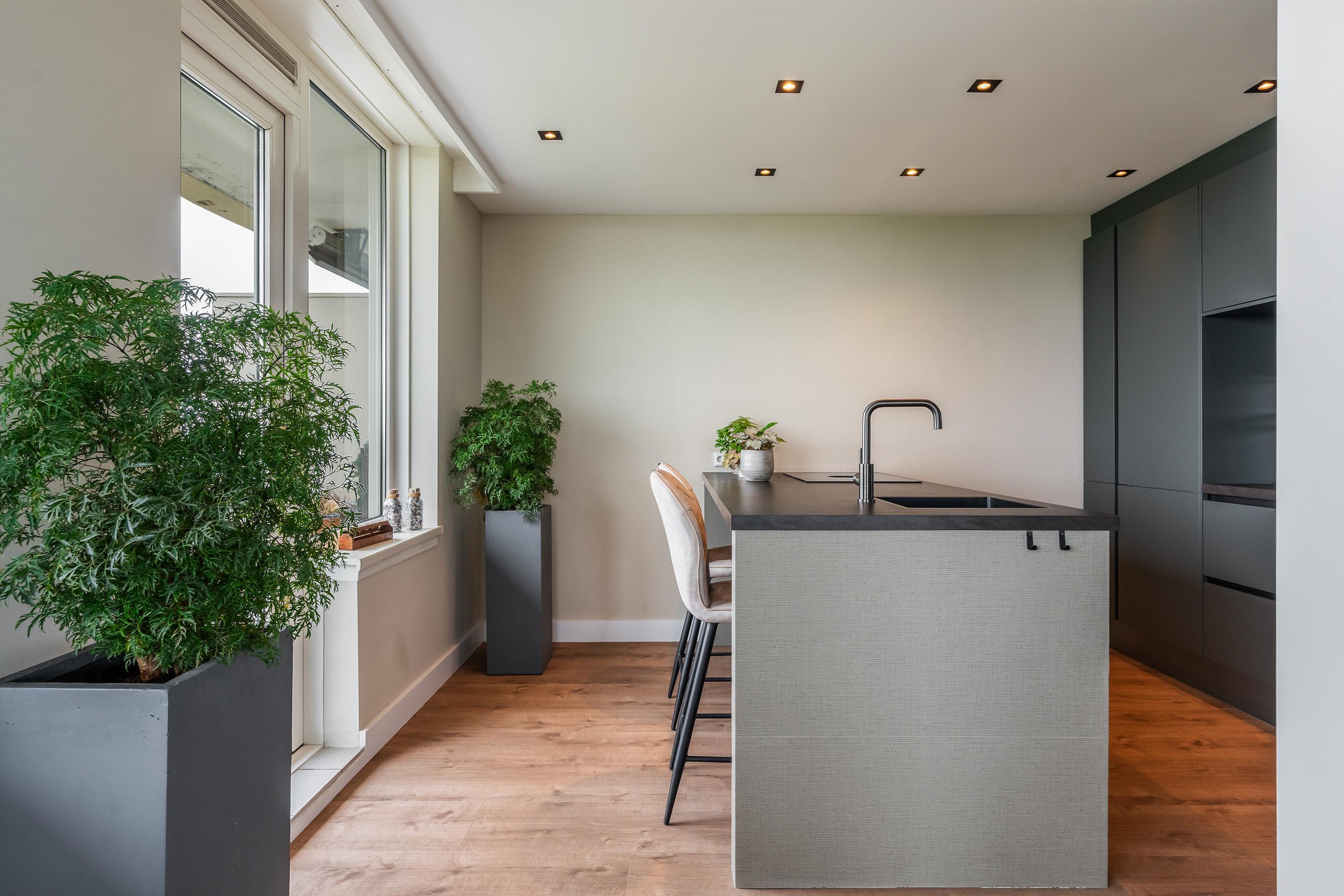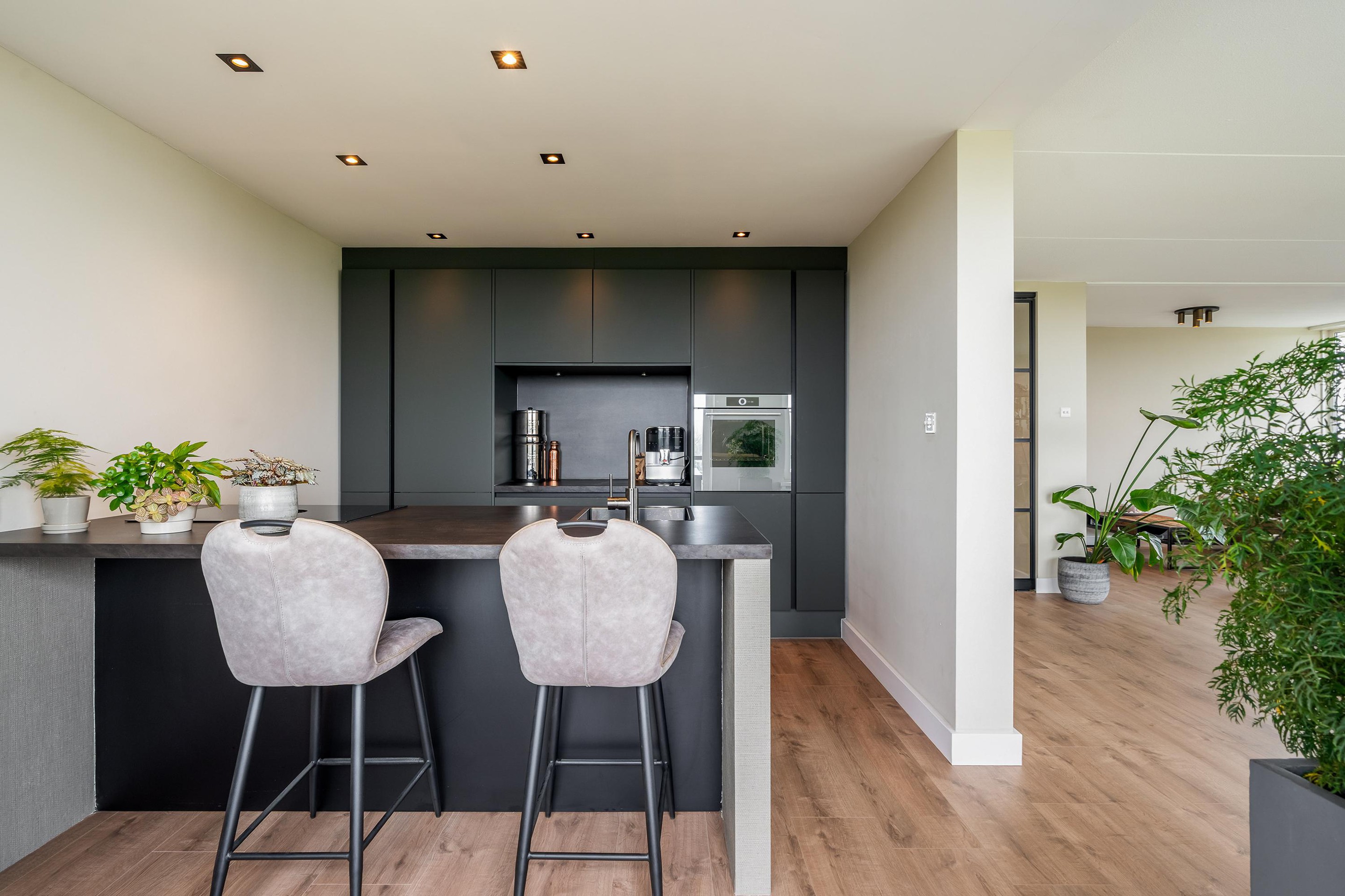 De ruime woonkamer grenst aan een fraaie eetkeuken, dé plek waar culinair genieten centraal staat. De smaakvolle keuken is van alle denkbare gemakken voorzien: een inductie kookplaat met geïntegreerde afzuiging (Bora Bora), zodat kook- en geurexplosies netjes binnenboord blijven. Verder tref je een apothekerskast voor al je kruiden en voorraad, een royaal koffie- en thee-eiland – ideaal voor een goed gesprek met een warme mok in de hand – plus hoogwaardige inbouwapparatuur zoals een koelkast, losse vriezer, vaatwasser en oven met grillfunctie. Zo wordt koken elke dag opnieuw een feestje.