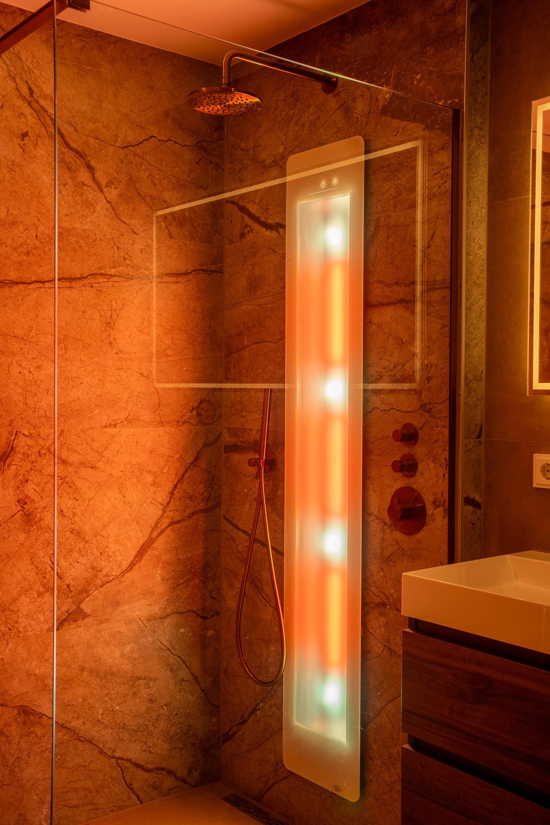 De badkamer is, als kers op de taart, uitgerust met een inloopdouche waar je heerlijk onder stapt. Wil je meer dan alleen wassen? Dan biedt de sunshower mét infraroodfunctie precies wat je nodig hebt voor een ontspannen moment.