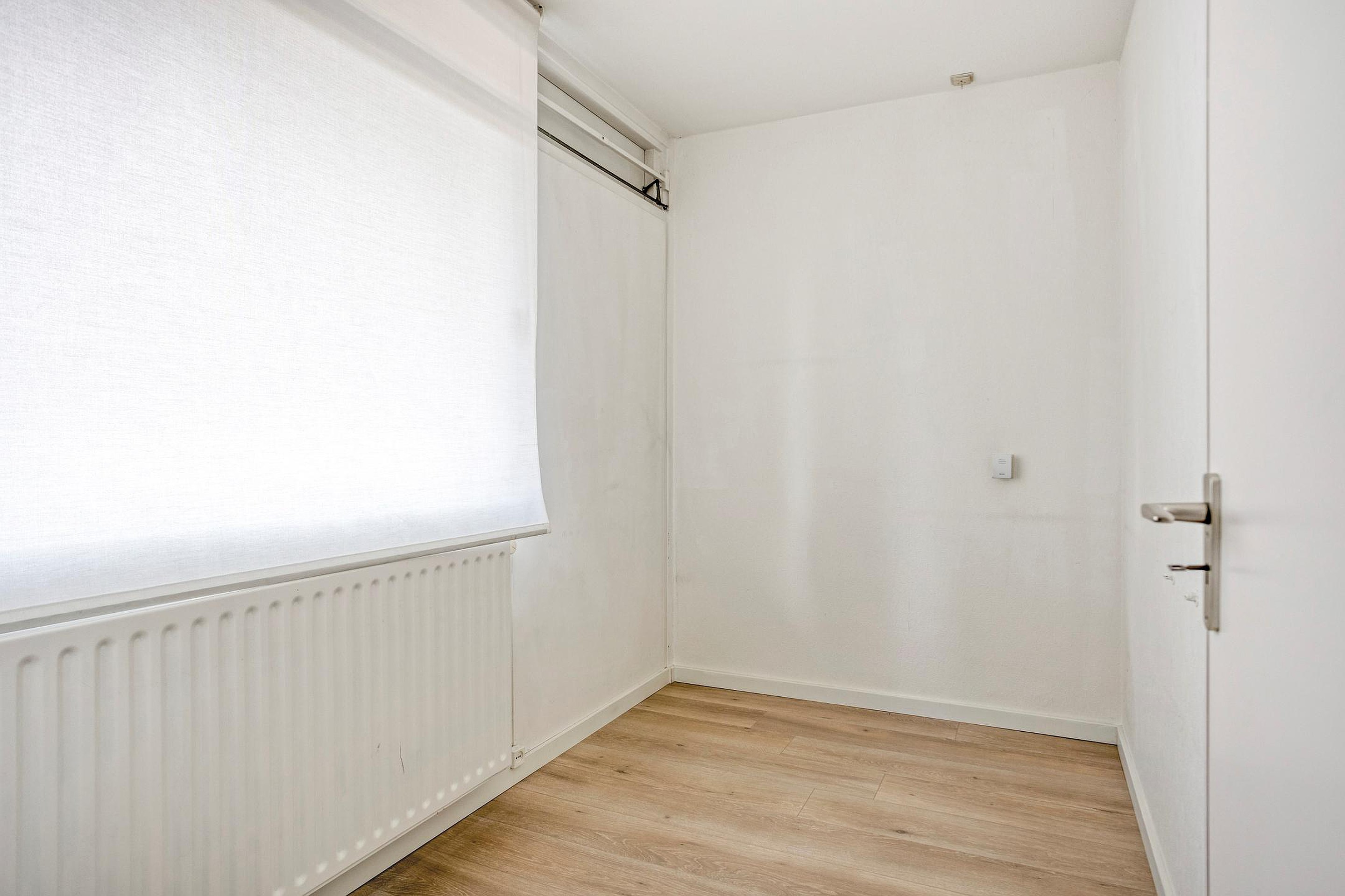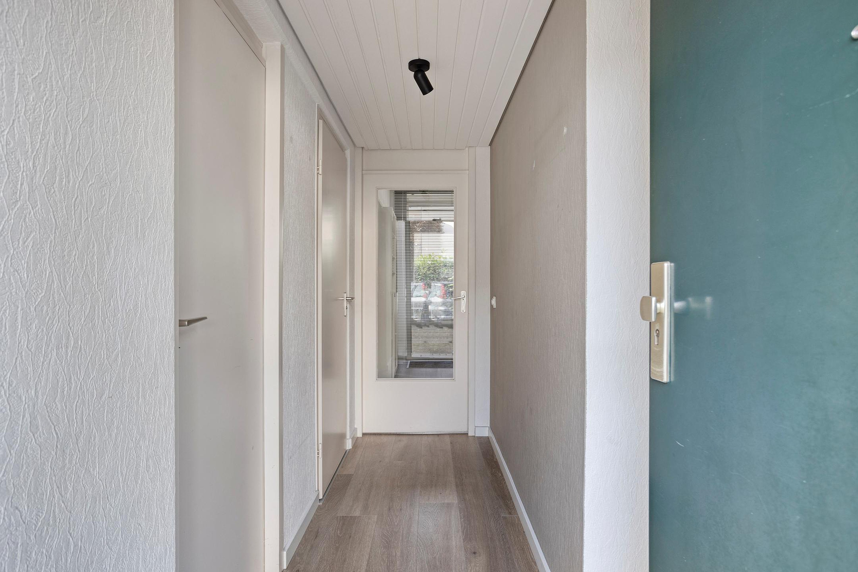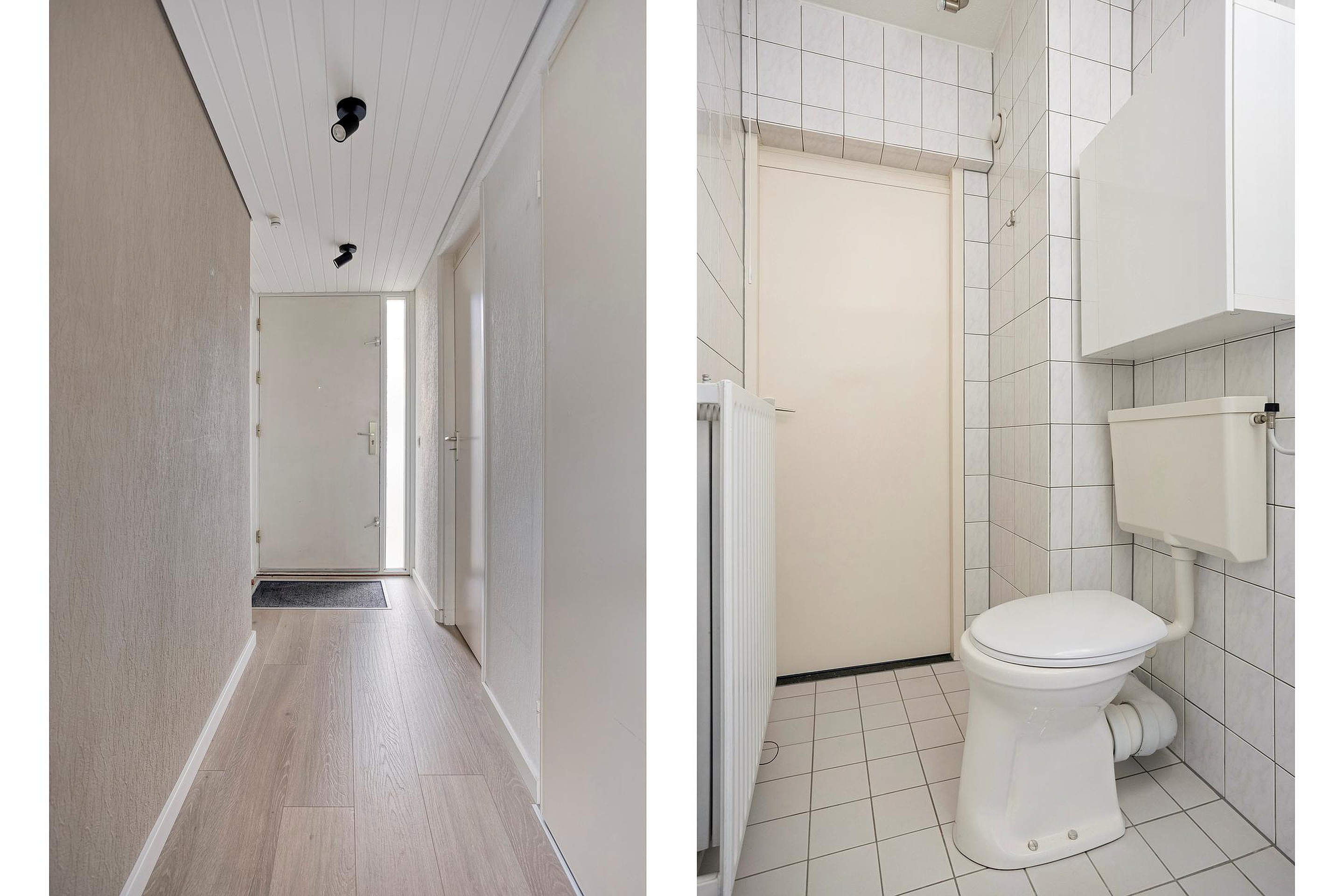 De entree geeft toegang tot een centrale hal, van waaruit alle vertrekken bereikbaar zijn. Direct aan de linkerzijde bevindt zich de eerste slaapkamer (6m2), ideaal als logeerkamer, werkplek of hobbyruimte en voorzien van een praktische op maat gemaakte kast. Aan de rechterzijde van de hal is een inpandige berging (3m2) voorzien van de aansluitpunten voor het witgoed en opstelling van de boiler. Deze ruimte biedt volop opbergmogelijkheden.