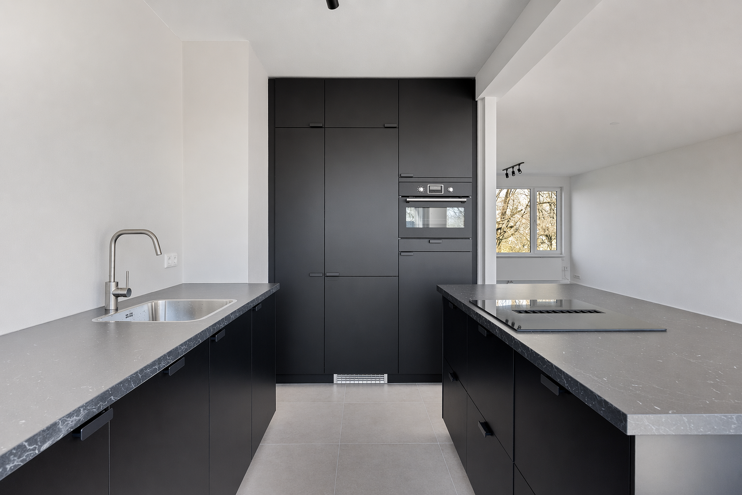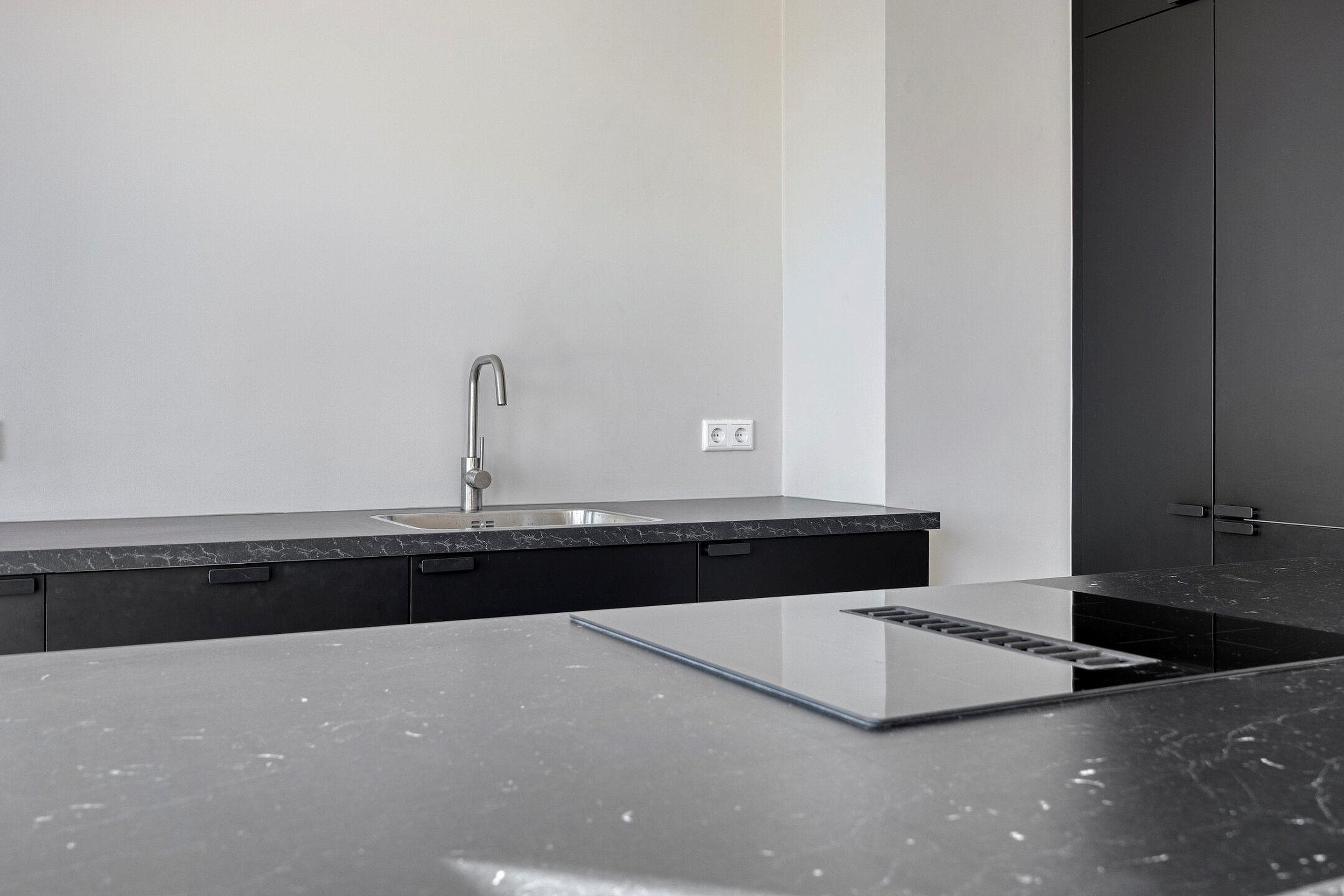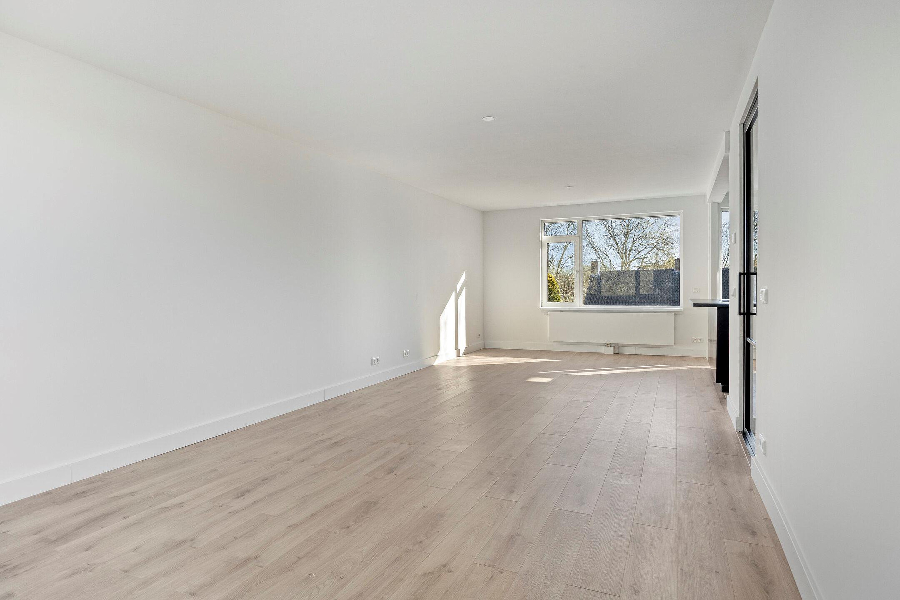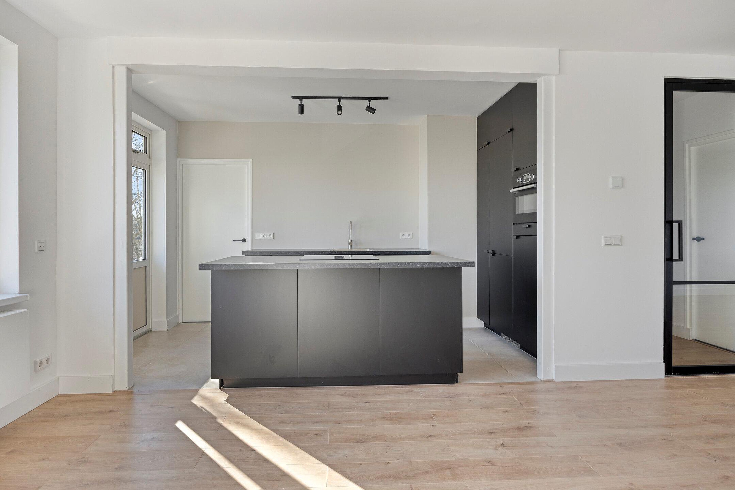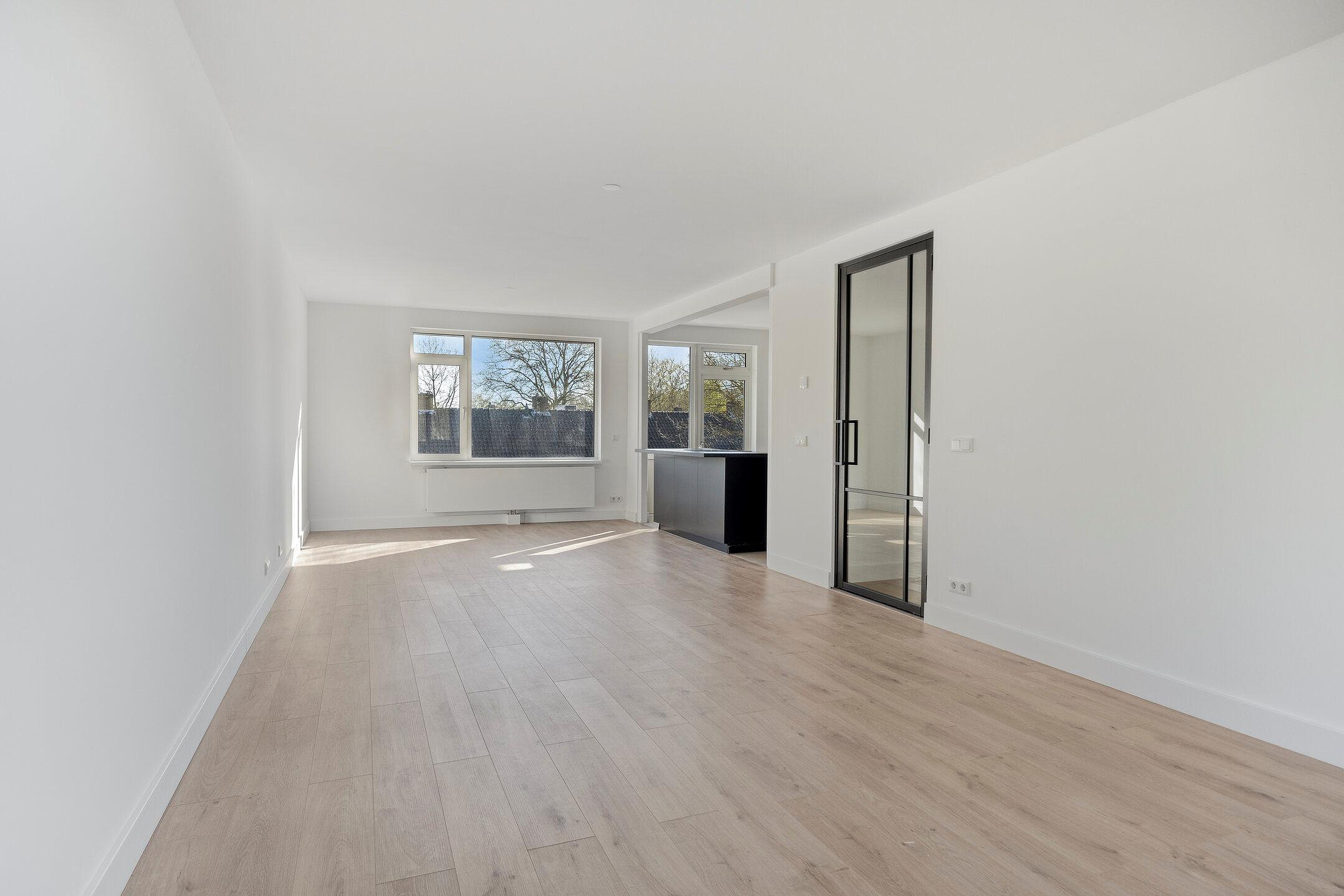 De woonkamer is royaal opgezet en heeft dankzij de doorzonindeling een prettige lichtinval. De open keuken vormt een echte eyecatcher en is uitgevoerd met een kookeiland voorzien van een inductiekookplaat met geïntegreerde afzuiging. De strak afgewerkte kastenwand beschikt over een koelkast, vriezer en combi-oven. Daarnaast is er een vaatwasser aanwezig en is er meer dan voldoende opbergruimte.