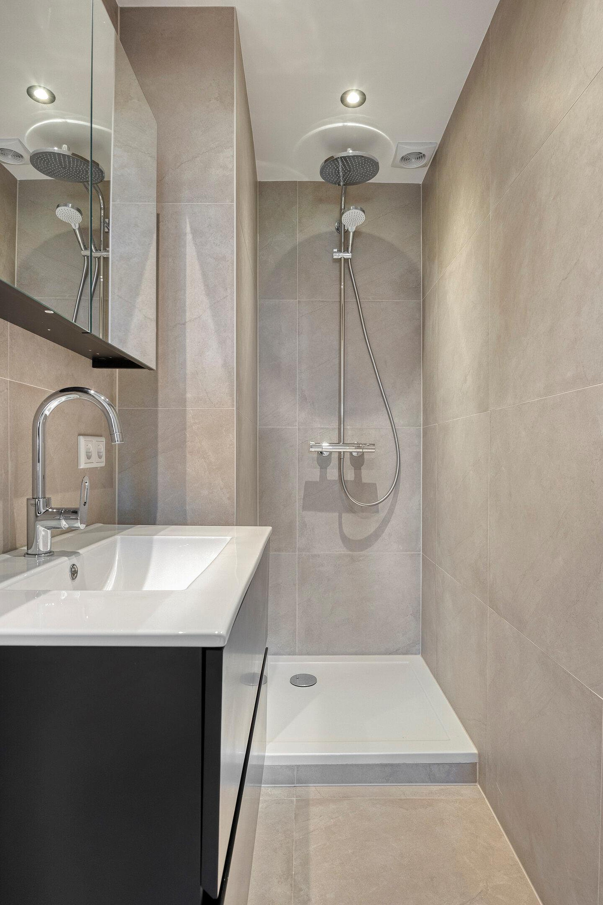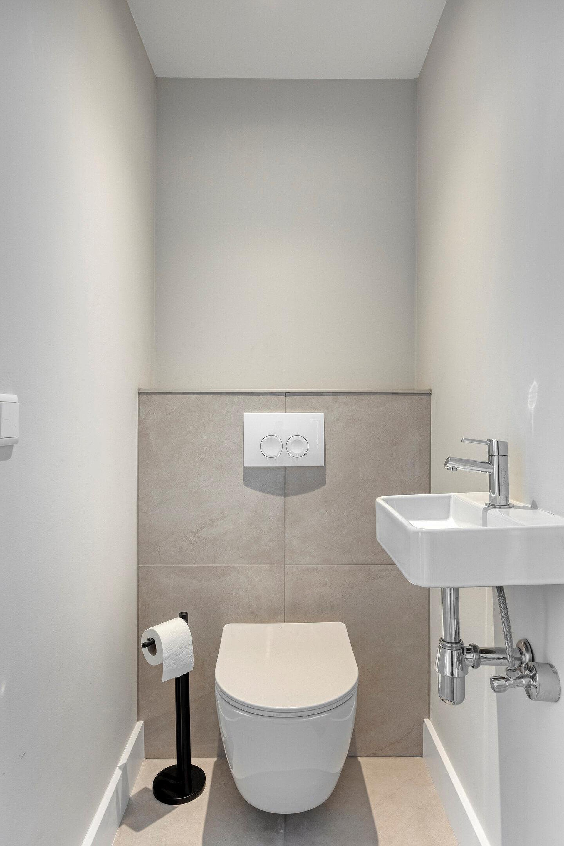 De badkamer en het toilet zijn recent gerenoveerd en modern afgewerkt. De badkamer is voorzien van een inloopdouche met regendouche en een wastafelmeubel. Het separate toilet beschikt over een fonteintje.
