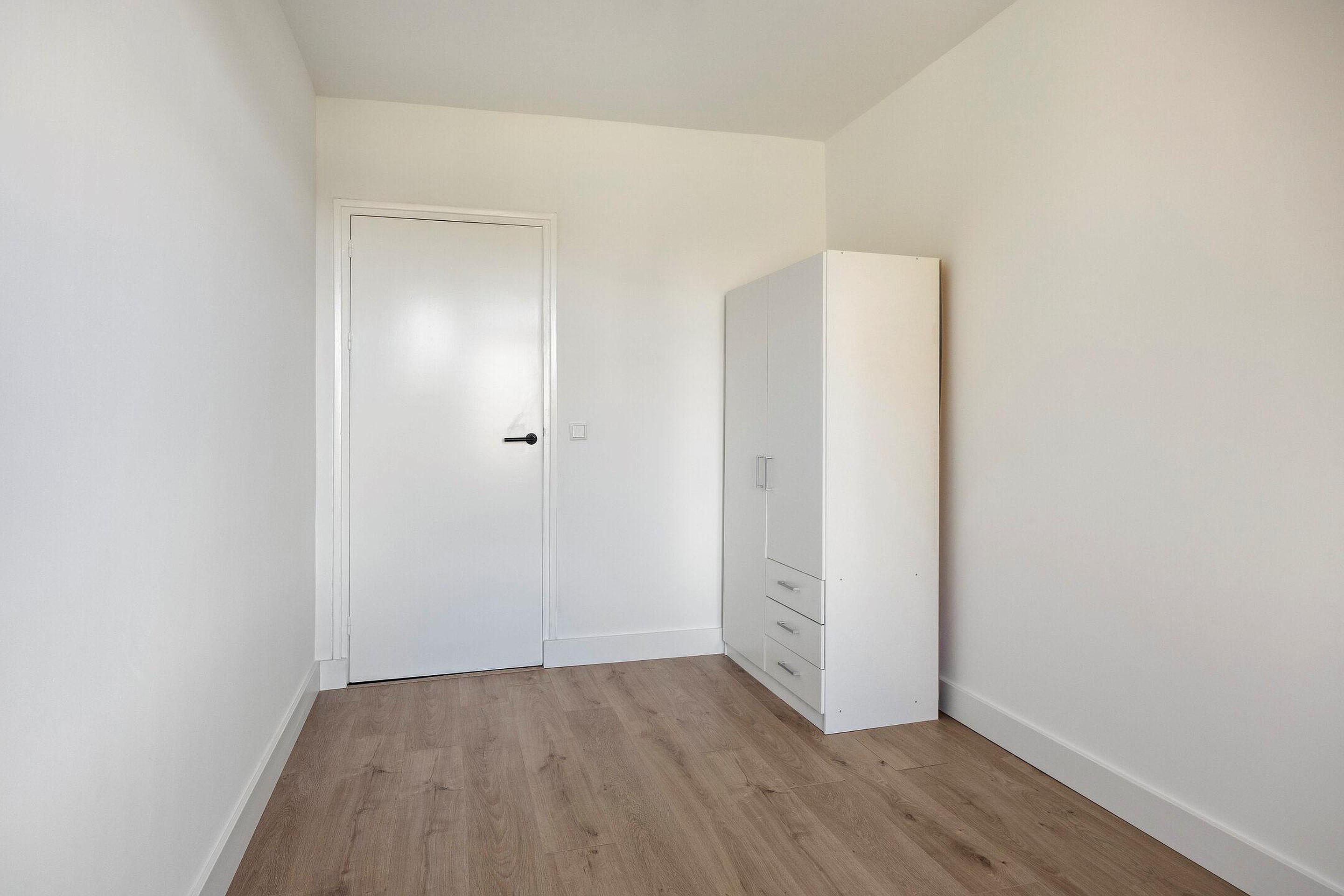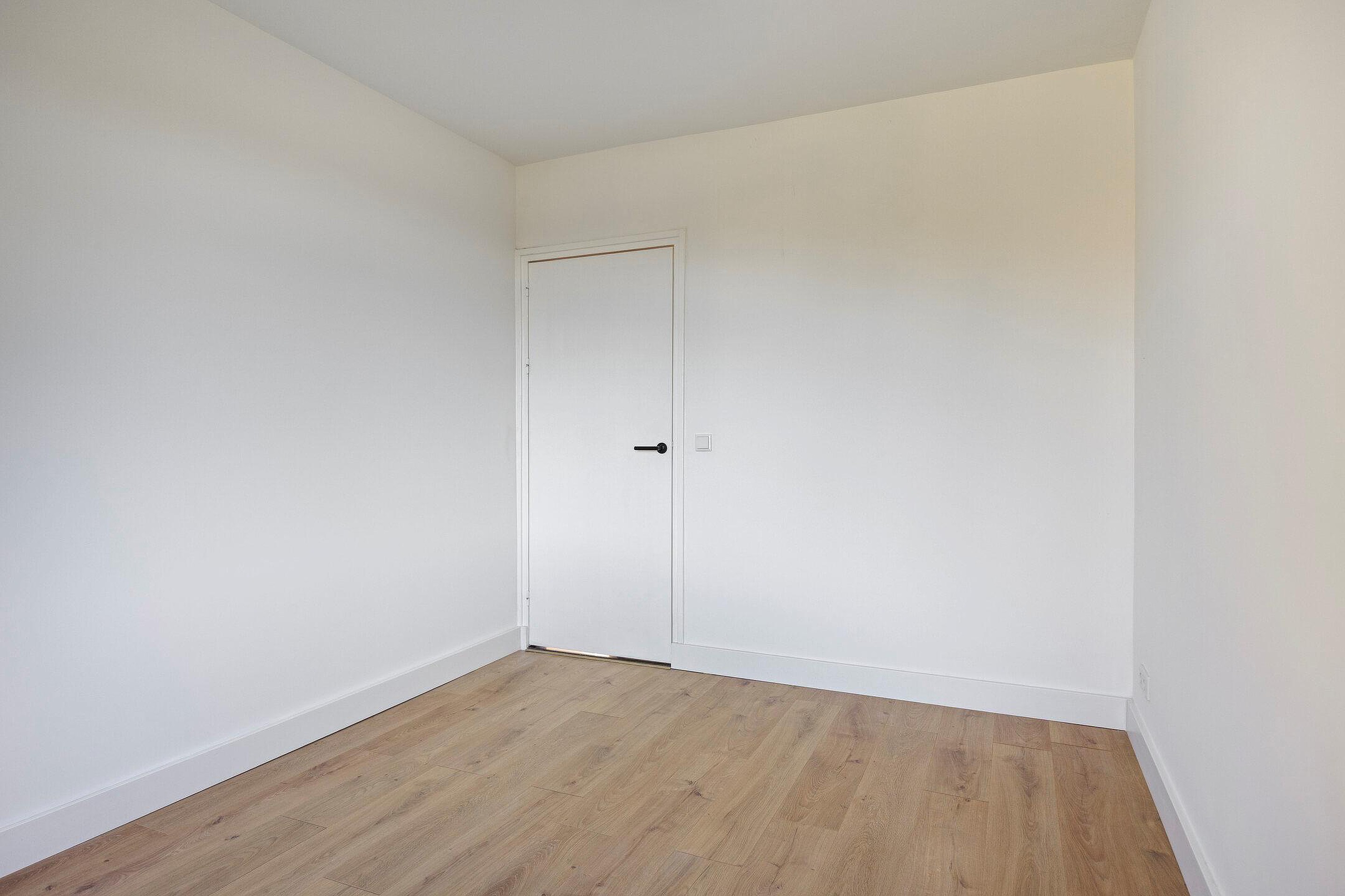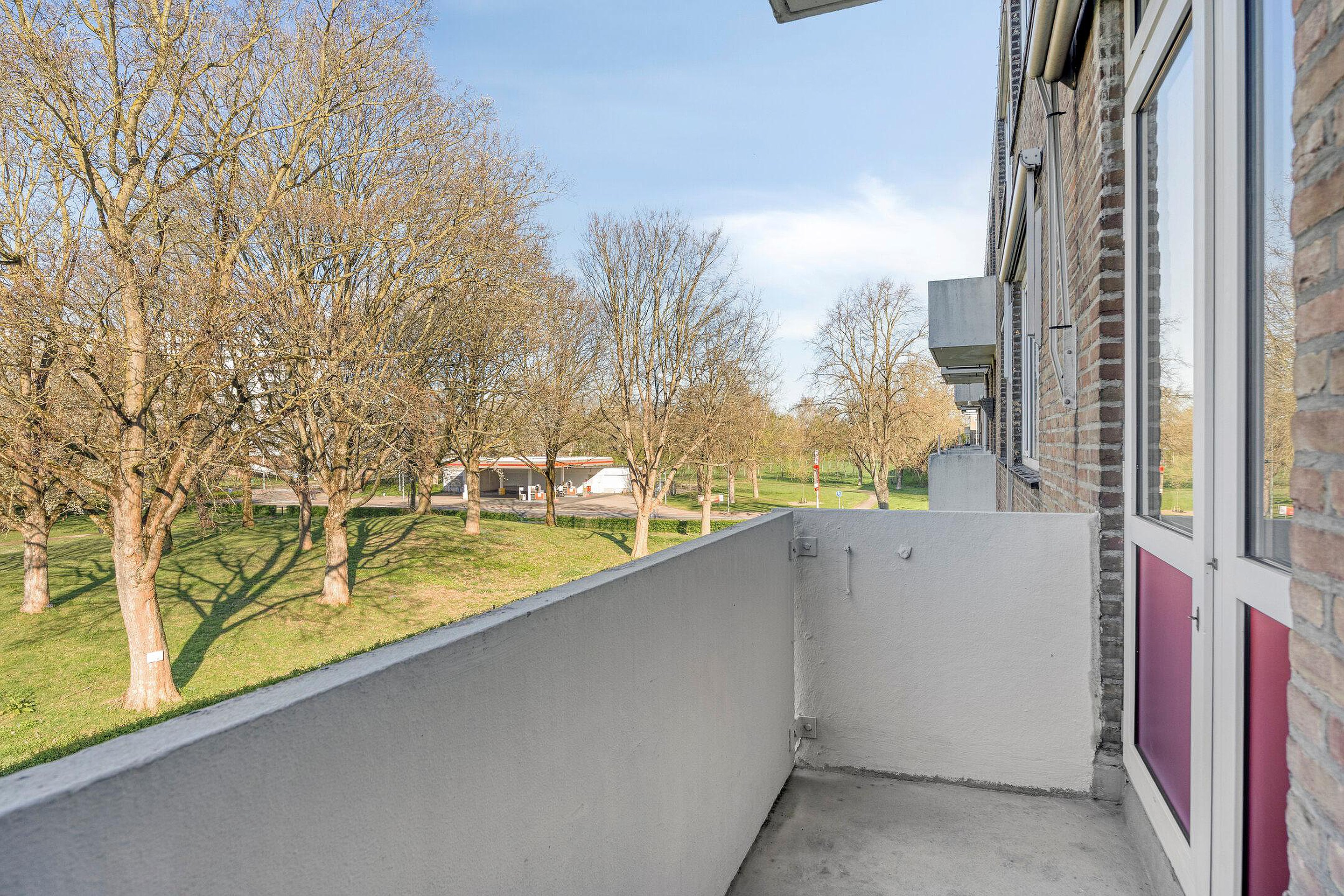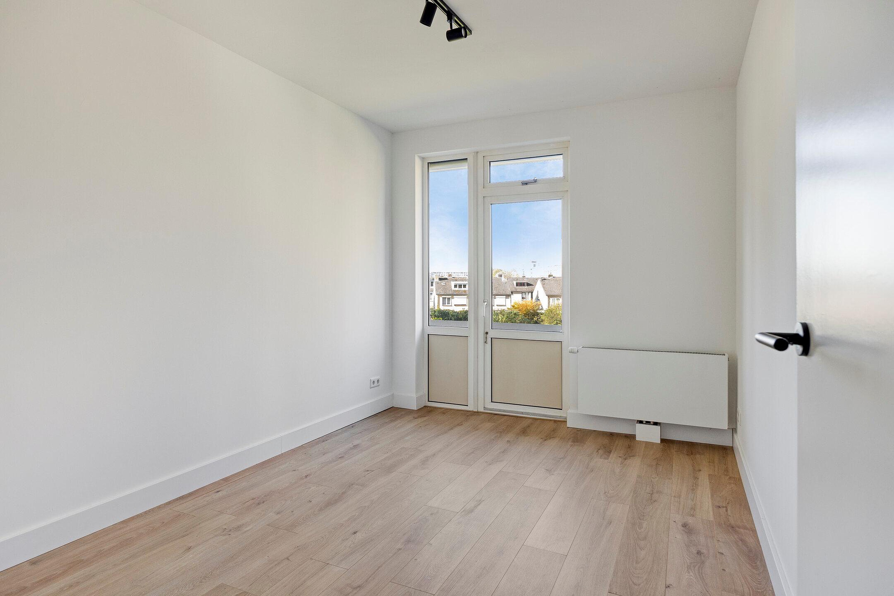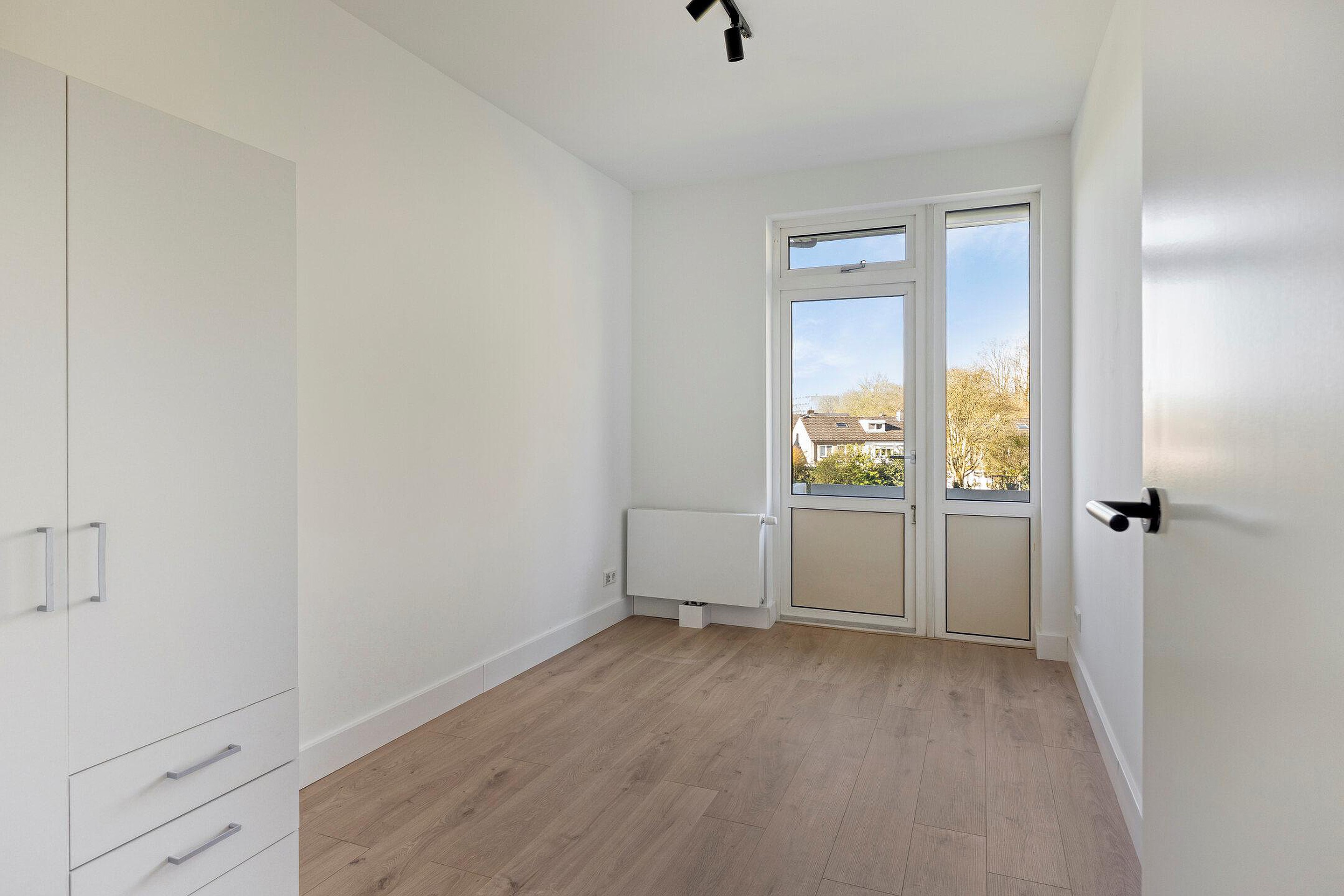 Aan de achterzijde van de woning bevinden zich twee slaapkamers, beide met toegang tot het tweede royale balkon. Vanuit hier heeft u een vrij uitzicht over een groene weide, wat zorgt voor een rustige en prettige woonbeleving.