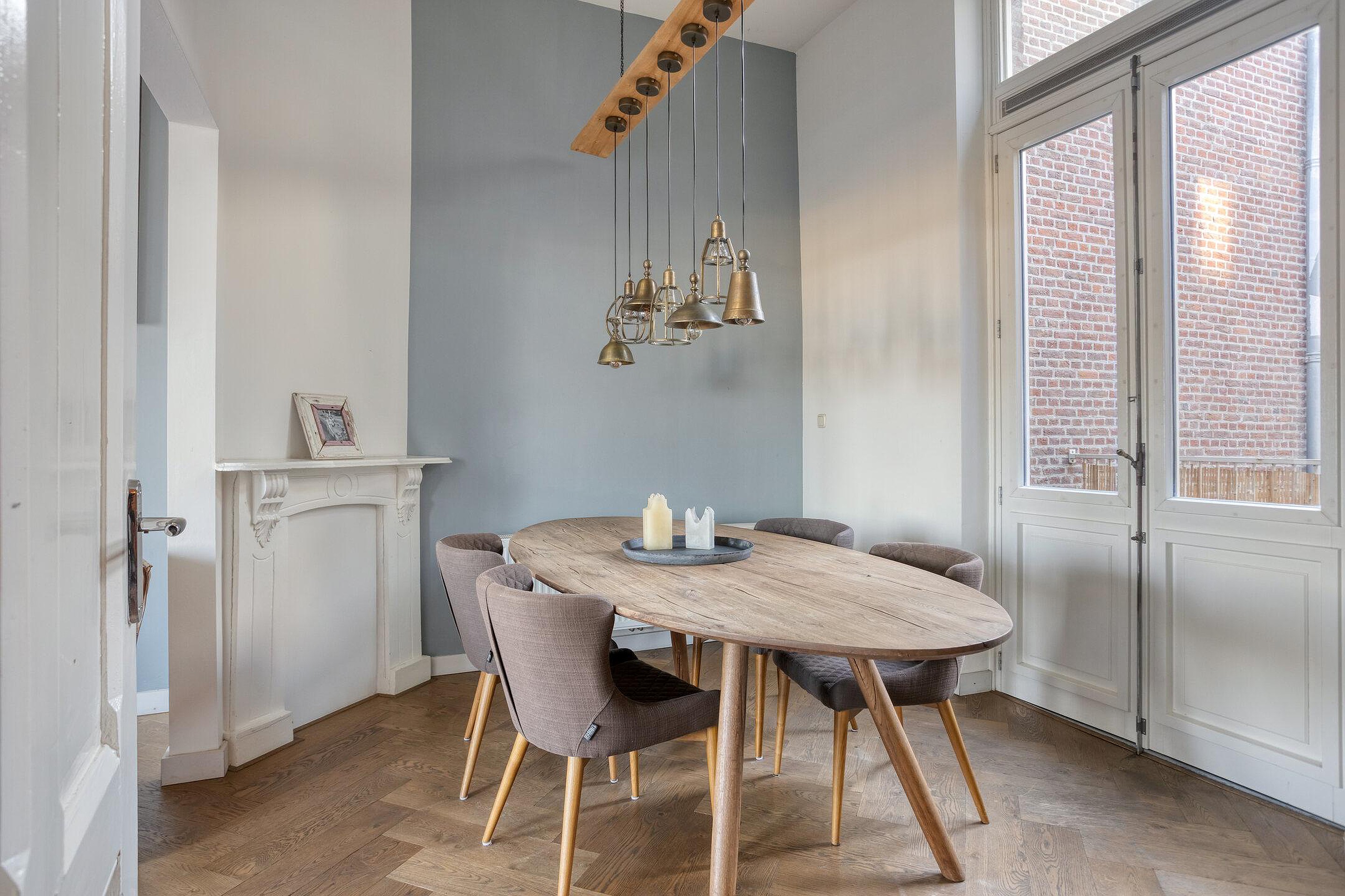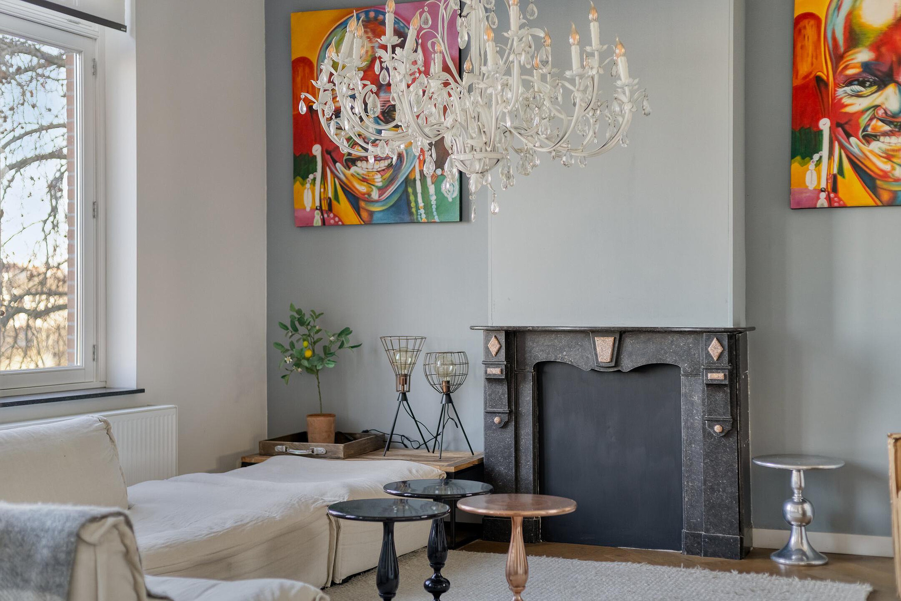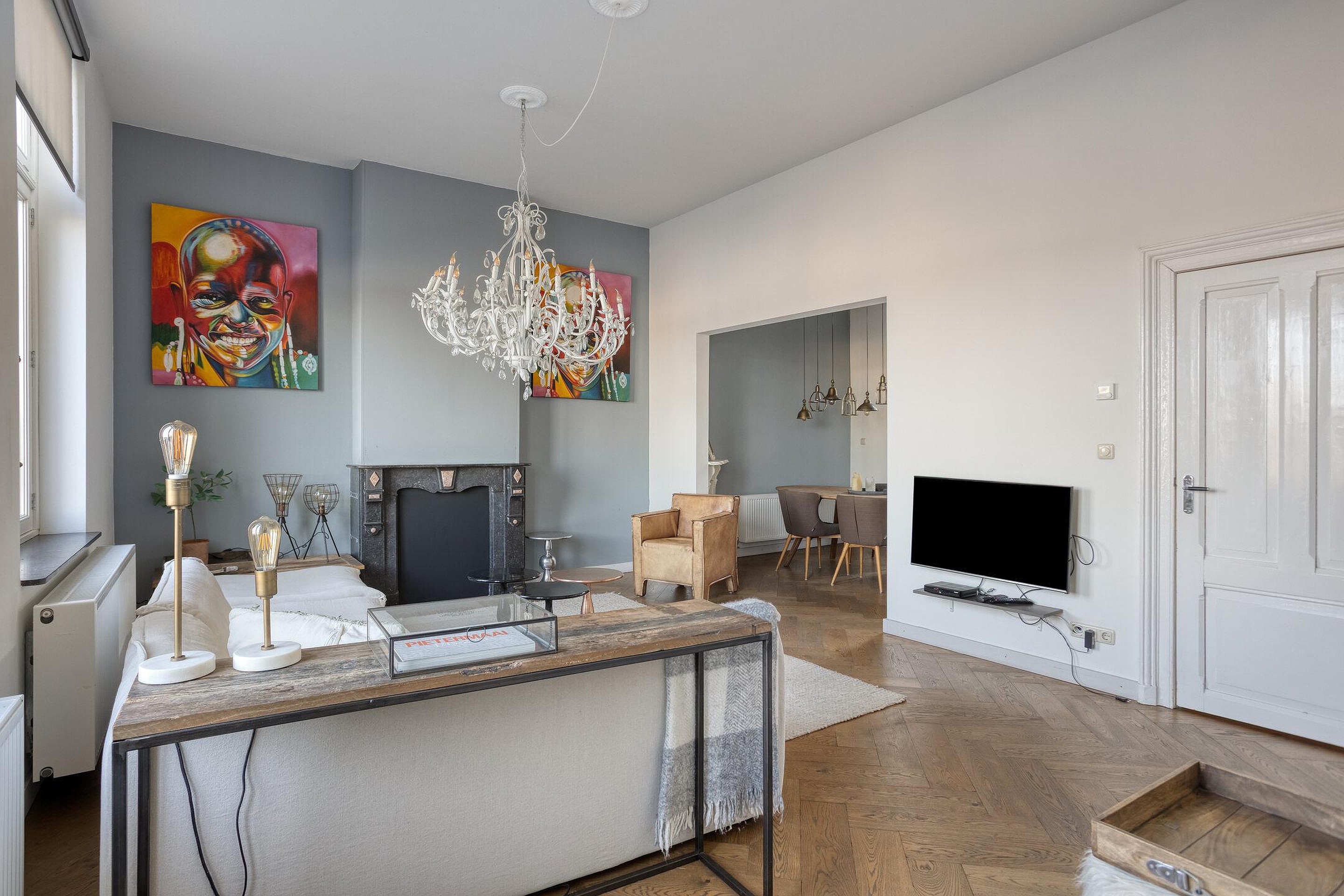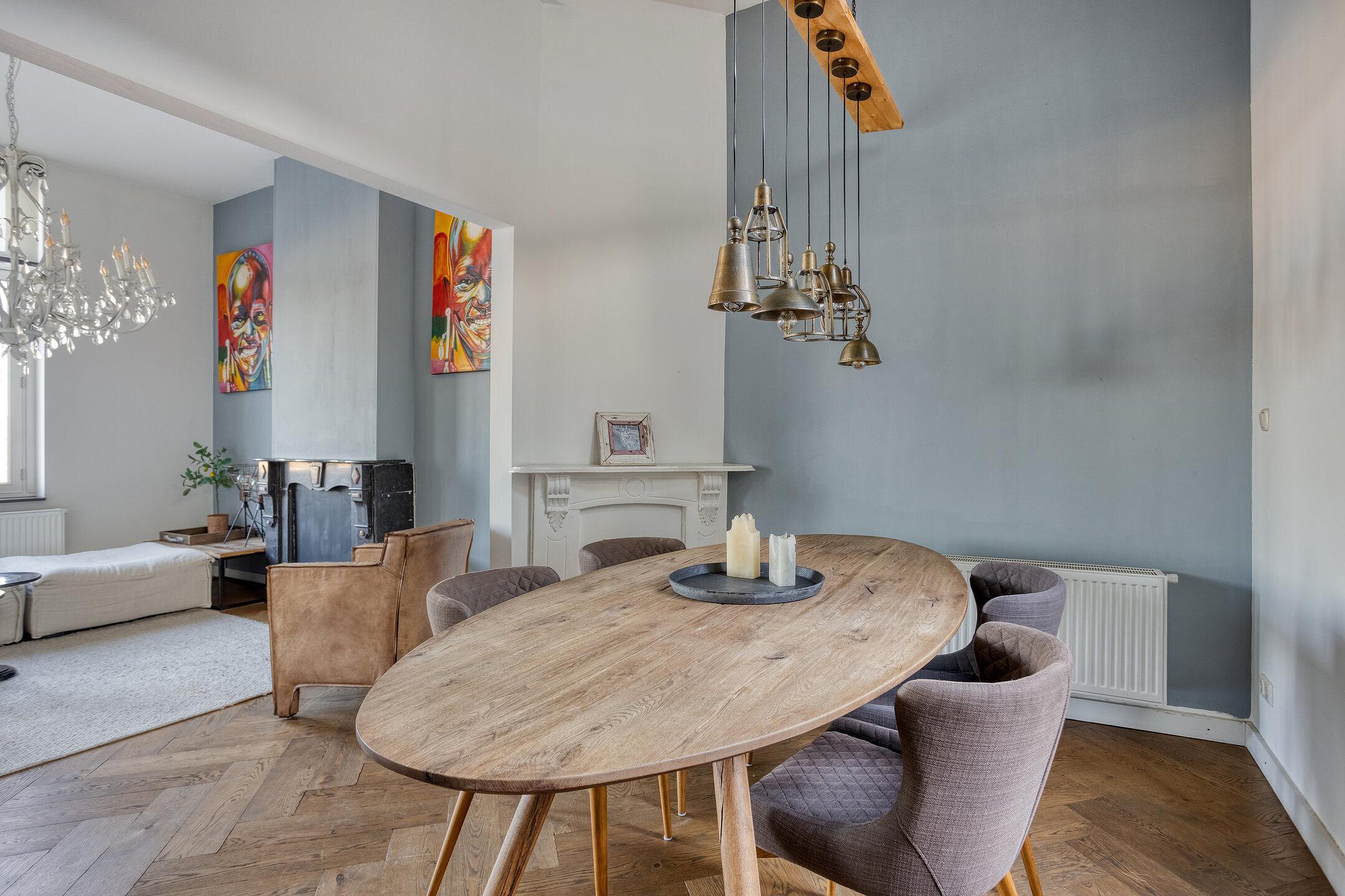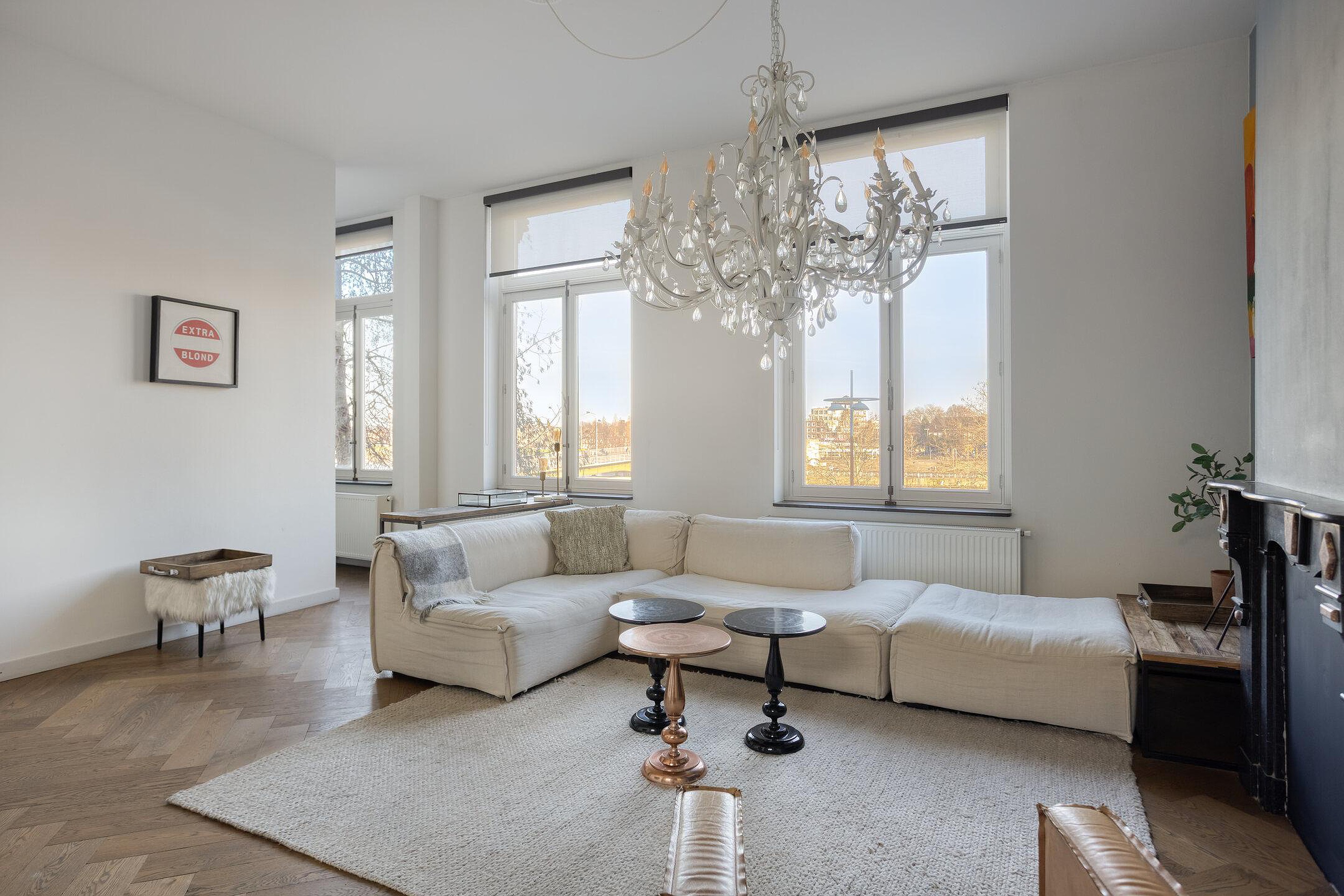 De woonkamer (34m2) ademt charme dankzij de originele houten visgraatvloer en de stijlvolle marmeren schouw. De ruimte is logisch ingedeeld in een royaal zitgedeelte (24m2) en een comfortabel eetgedeelte (10m2), waar de grote raampartijen zorgen voor veel licht en een fantastisch vrij uitzicht dat nooit verveelt.