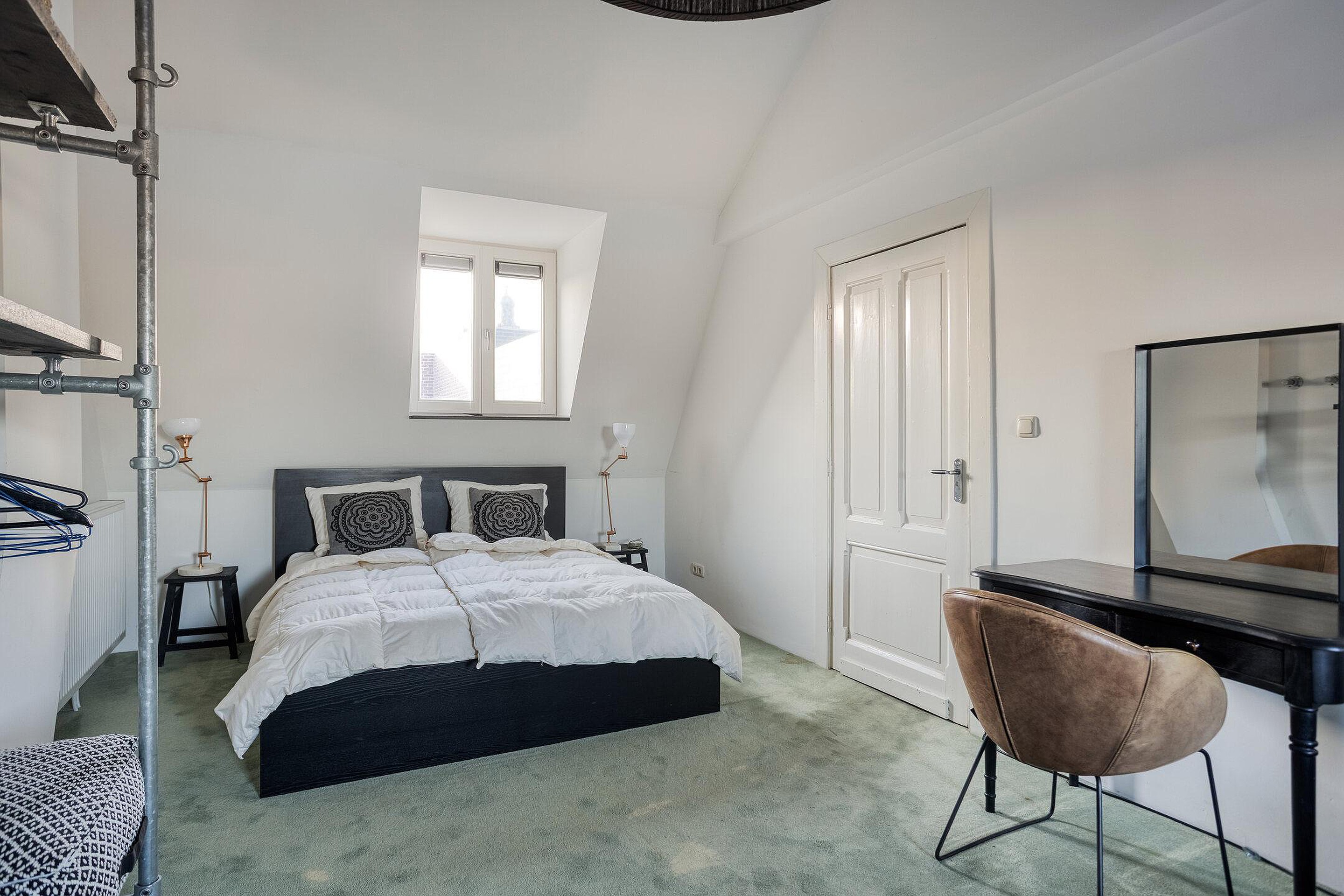 De verdieping beschikt over twee slaapkamers van goed formaat (21m2 en 11m2), beide met een fijne lichtinval en voorzien van houten kozijnen met HR++ beglazing. Dankzij de afmetingen en indeling zijn de kamers uitstekend geschikt als hoofdslaapkamer, logeerkamer of thuiswerkplek.