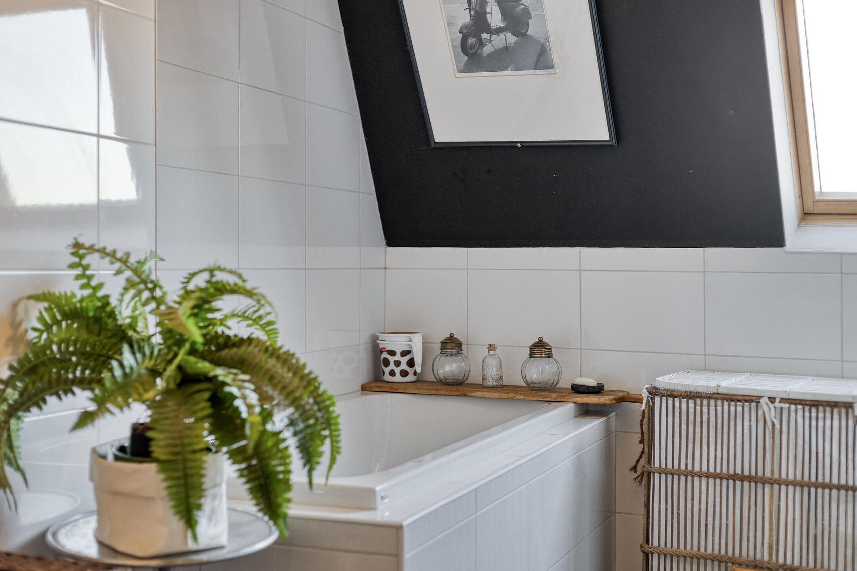 De luxe badkamer (14m2) is royaal opgezet en van alle gemakken voorzien. Hier vind je een ligbad, een ruime regendouche, een dubbele vaste wastafel en een wandcloset. Een dakraam zorgt voor daglicht en extra ventilatie, wat bijdraagt aan een frisse en aangename sfeer.