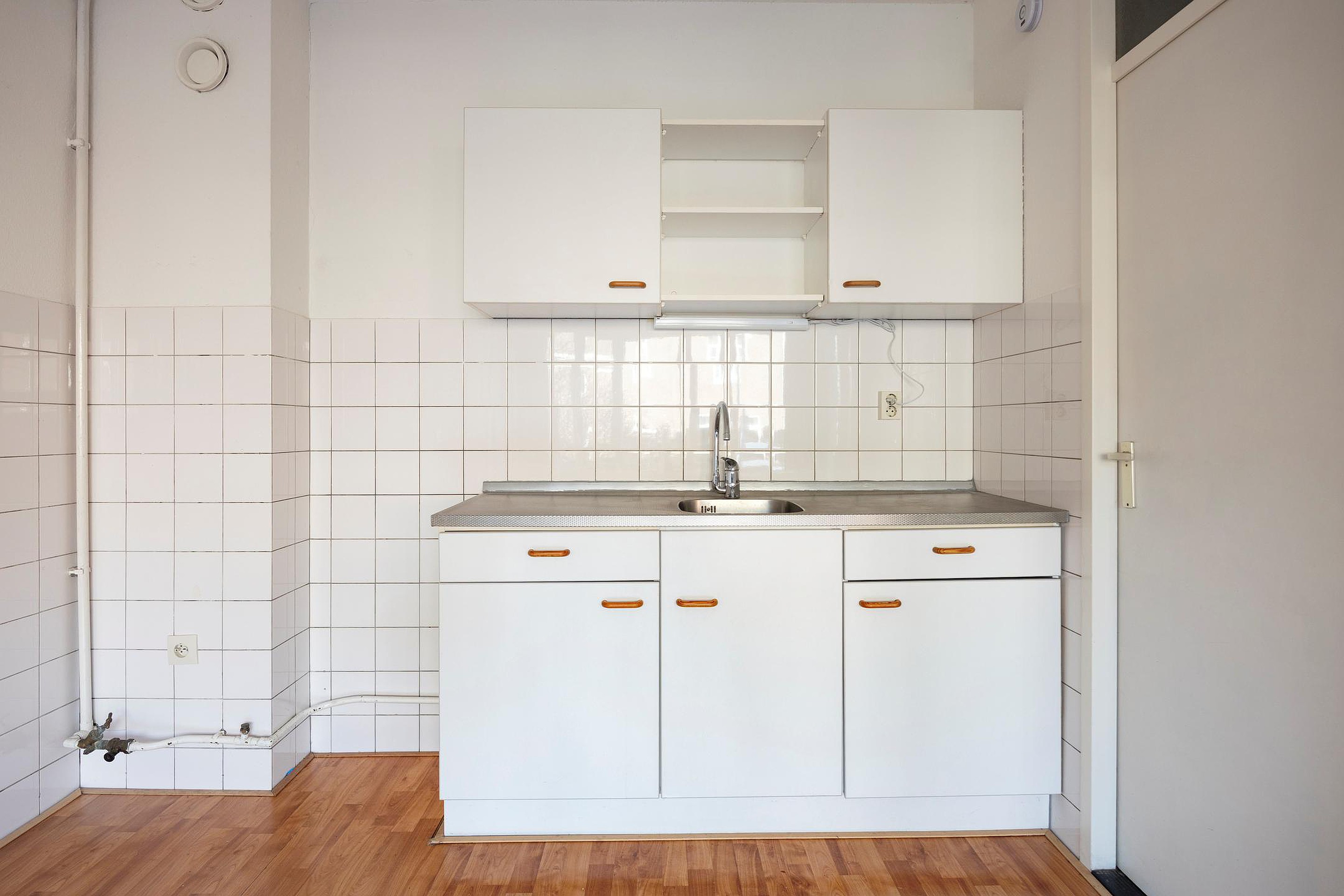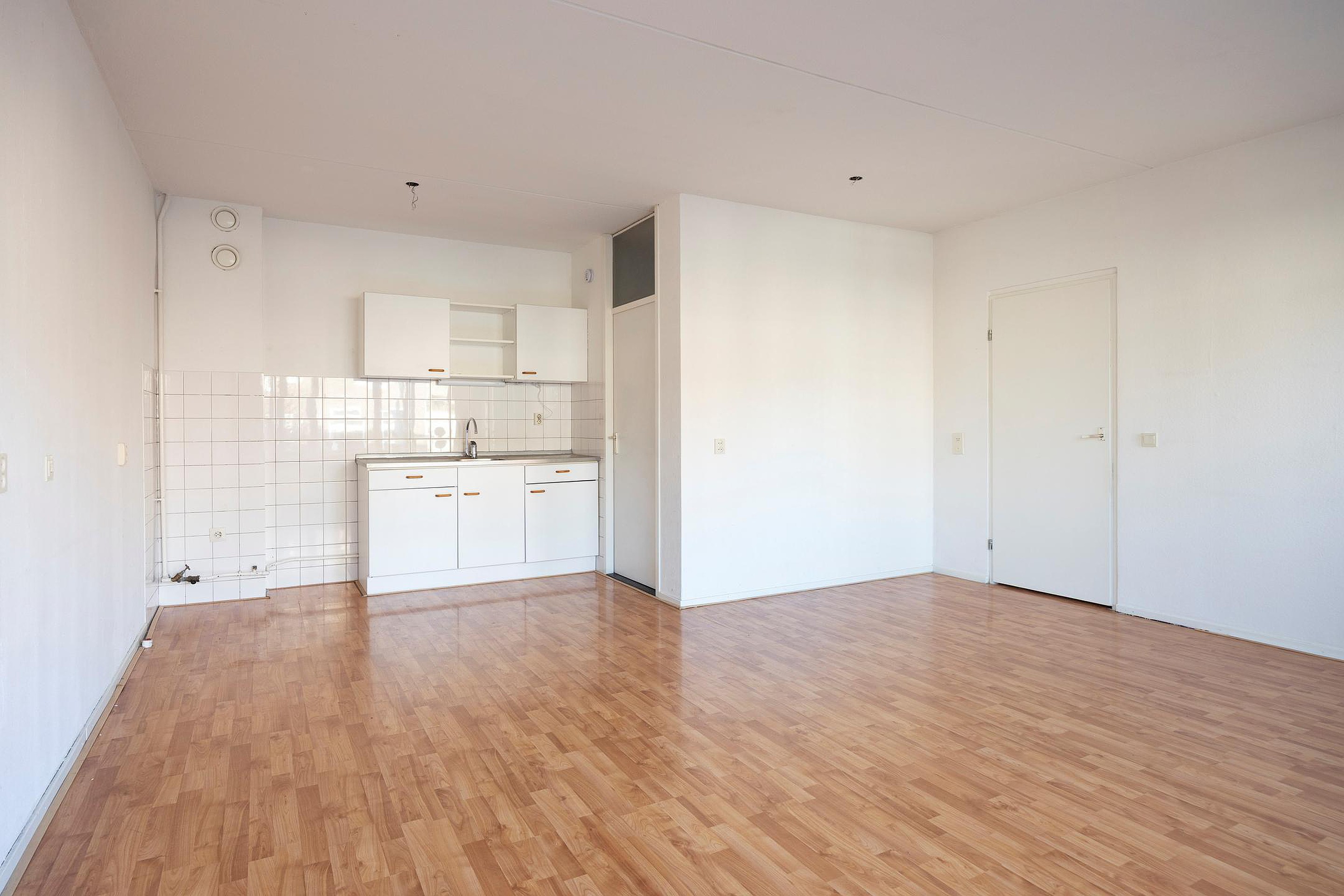 De open keuken sluit aan op de woonkamer en vormt een fijne centrale plek in het appartement. Aangrenzend bevindt zich de bijkeuken, ideaal voor extra opslag.